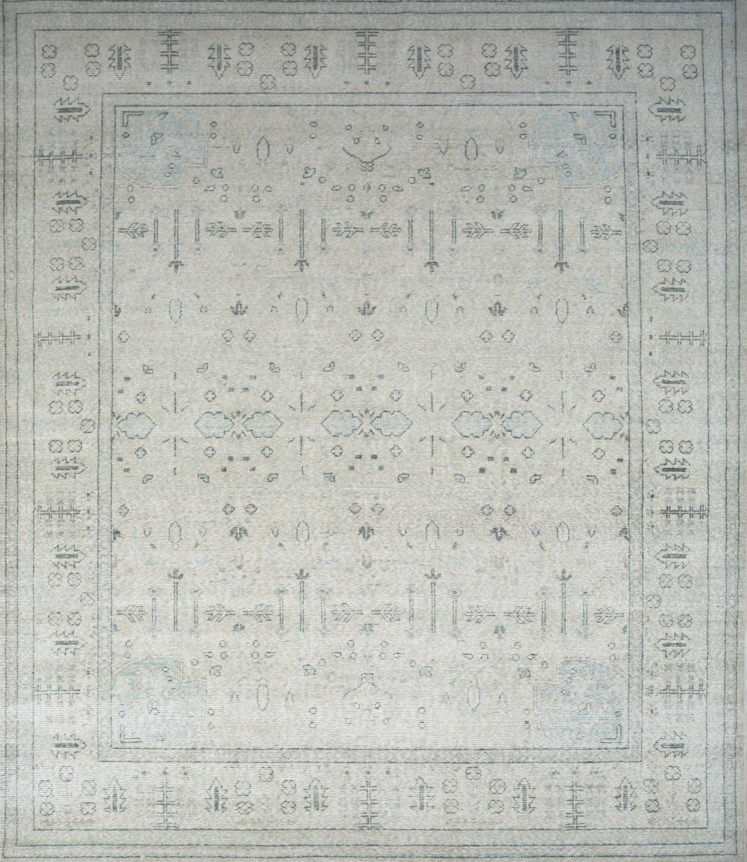 Visually, the rug exudes a minimalist charm with a predominantly light gray or beige palette. Its pattern includes intricate geometric shapes, florals, and possible abstract motifs in a symmetrically arranged central area, devoid of a central medallion. Multiple borders surround the central field, with each border layer featuring distinctive motifs and symbols that add depth and interest to the overall design.