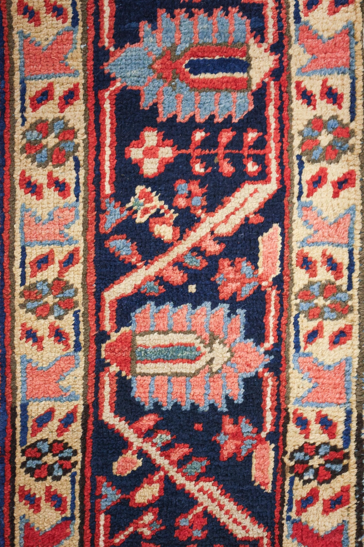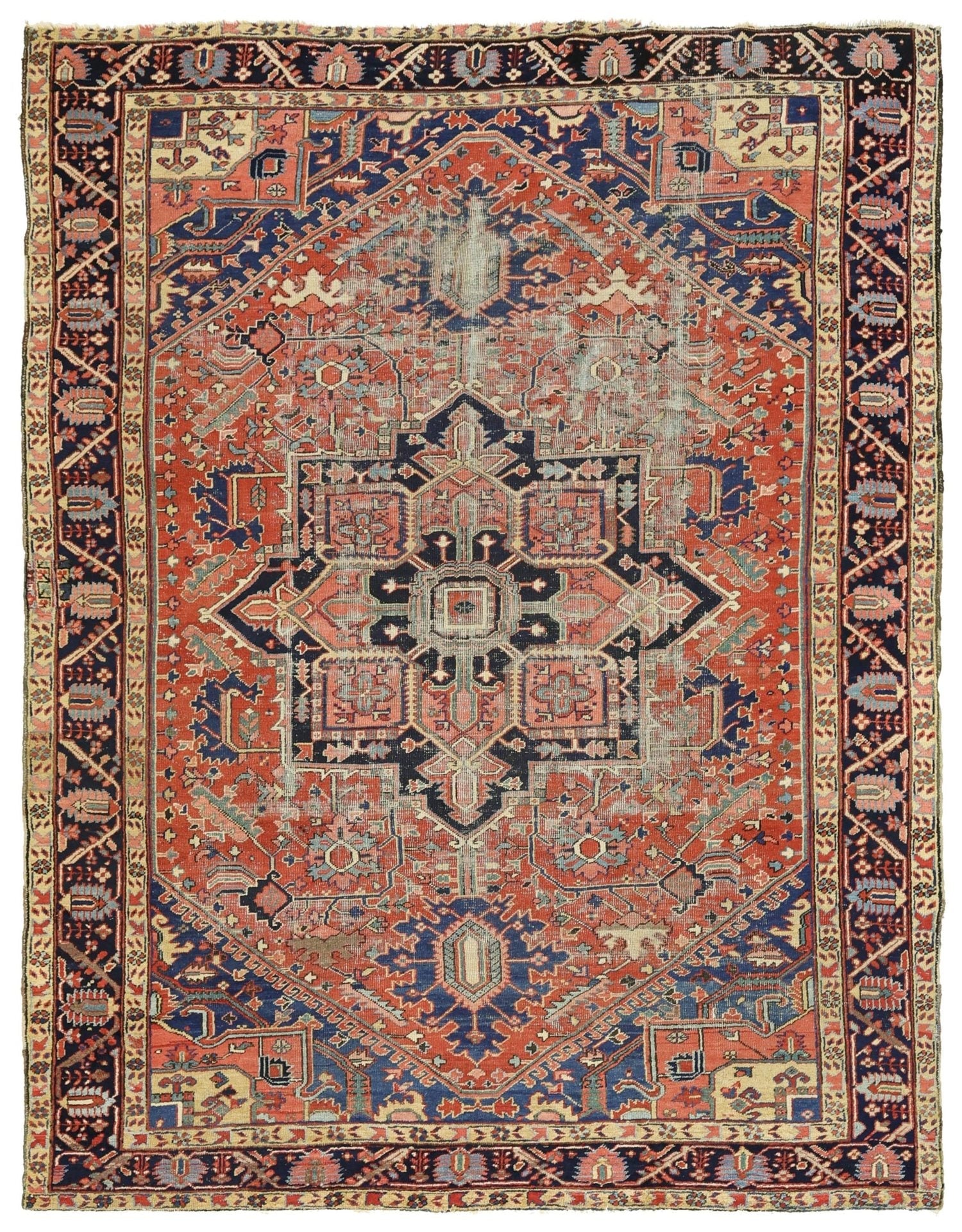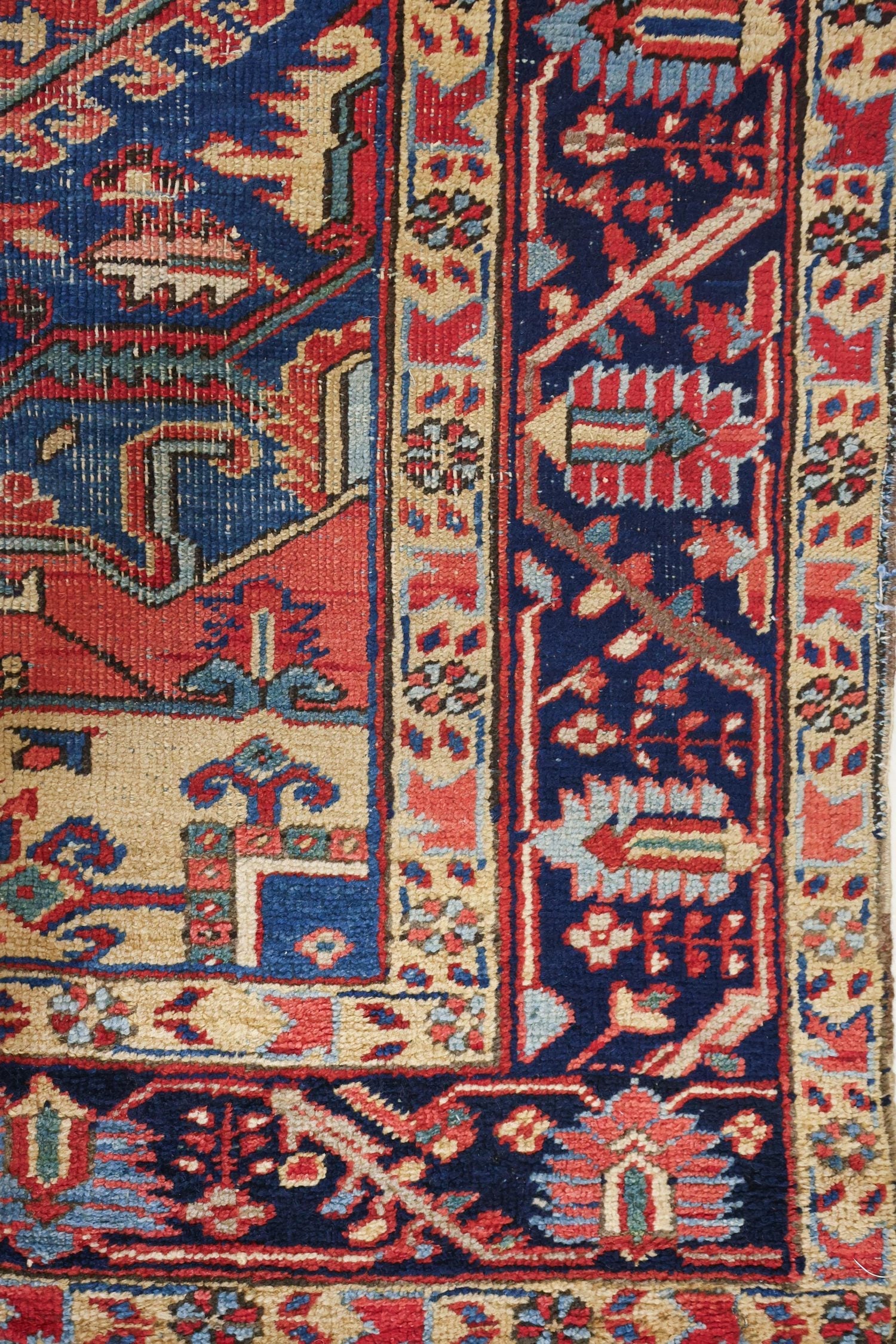 In essence, this almost century-old Persian Heriz rug, with its vibrant color palette and intricate design, is a distinctive piece of work. The craftsmanship is made evident through the level of detail etched in its wool on cotton material, and its size gives it a commanding presence in any setting it is placed. Despite the signs of wear and age, the rug retains its historical value, highlighting the durability and longevity of traditional Persian rug-making practices. This rug serves as a window into the past, inviting appreciation for its intricate design and the rich history of Persian carpet weaving.