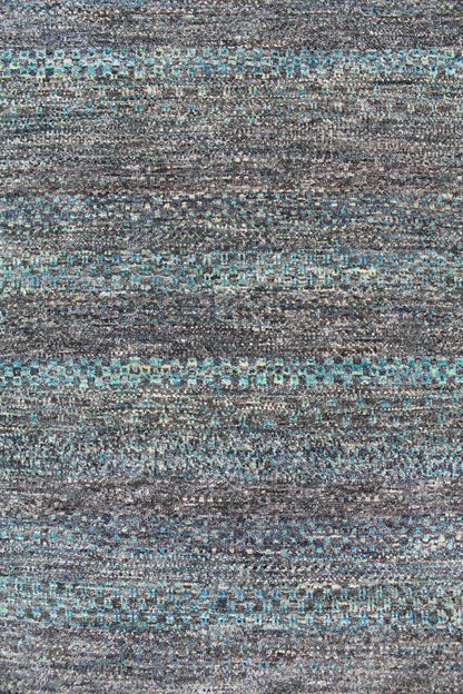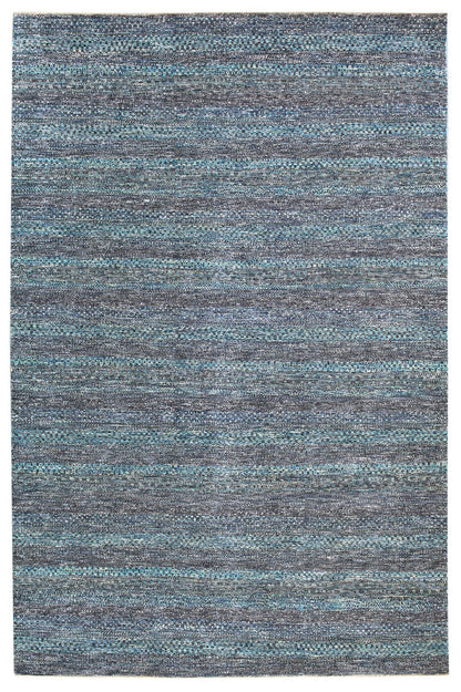Prominently featured in turquoise and teal shades, the rug showcases an Illusion design that appears like an artistic portrayal of horizontal blades of grass, handwoven to perfection in varying blue tones. The background of the rug, a pleasing turquoise, plays an eloquent host to the illusion design that exhibits a gradient effect with varied shades of blue.