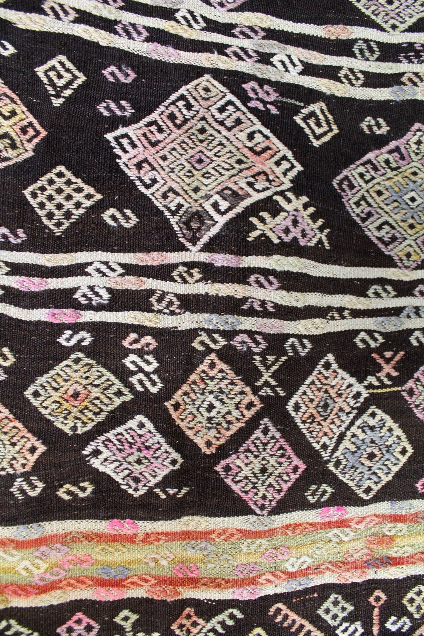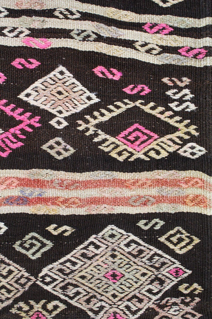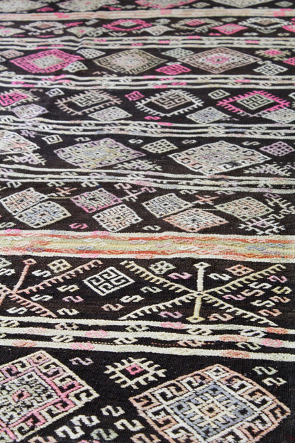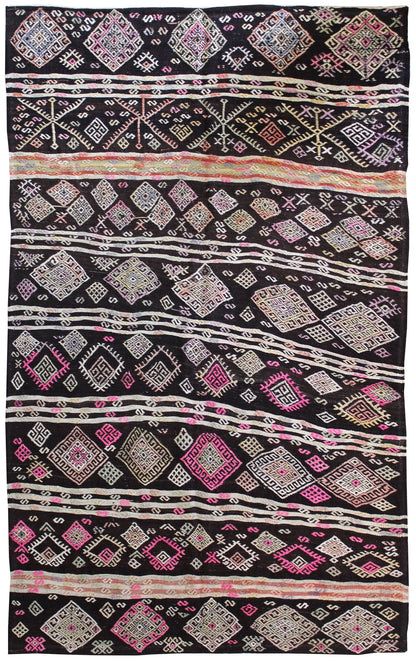 Show off your exquisite taste with our beautiful Vintage Jijim Handwoven Tribal Rug (J64804). It’s a prime example of a tribal Kilim done right and will add a unique, polished look to your space. Crafted mainly in brown and complemented with cocoa and pink, the Jijim design really pops. The wool flatweave surface is resilient yet comfortable and the wool foundation provides a sturdy base. This 6' 5" X 10' 9" handwoven rug is of vintage construction and Turkish origin. All in all, you’re going to love this piece and it’s going to be the perfect addition to your home. Make it happen today — with your own Vintage Jijim Handwoven Tribal Rug.