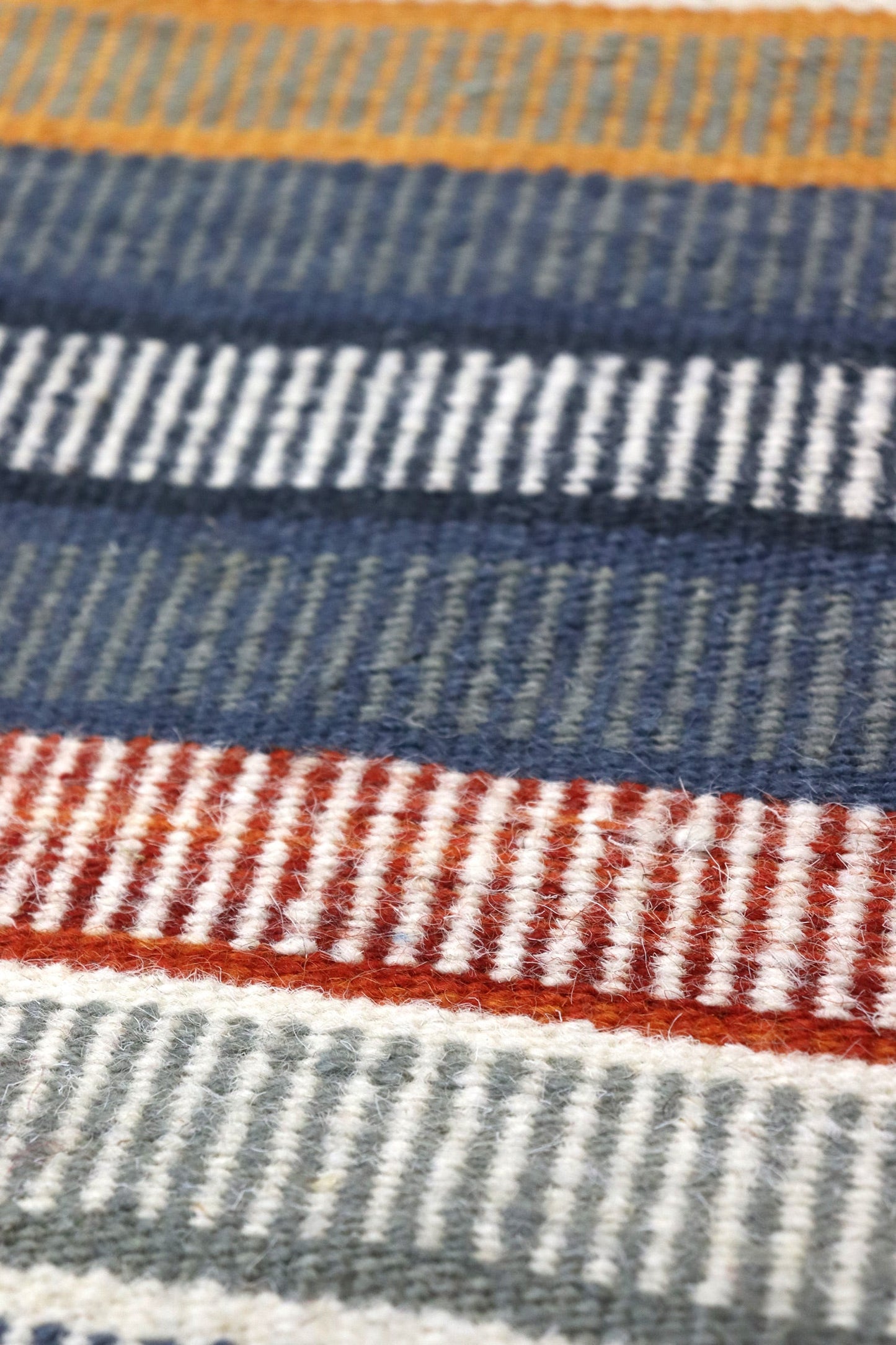 Change things up — transform your space with our amazing Stripes Handwoven Contemporary Rug (J66442). This new 4' 6" X 4' 6" rug is in the contemporary Modern Flatweave style and features a stunning Stripes design that you’ll absolutely love. This rug is primarily blue on orange with denim accents. You’ll also appreciate the wool flatweave on a cotton foundation, which feels great underfoot! As with other handwoven Indian rugs, this one’s made to last. You’ll be enjoying the elements of interest and sophistication it adds to your home for years. Don’t delay — refresh your room today with your own Stripes Handwoven Contemporary Rug.