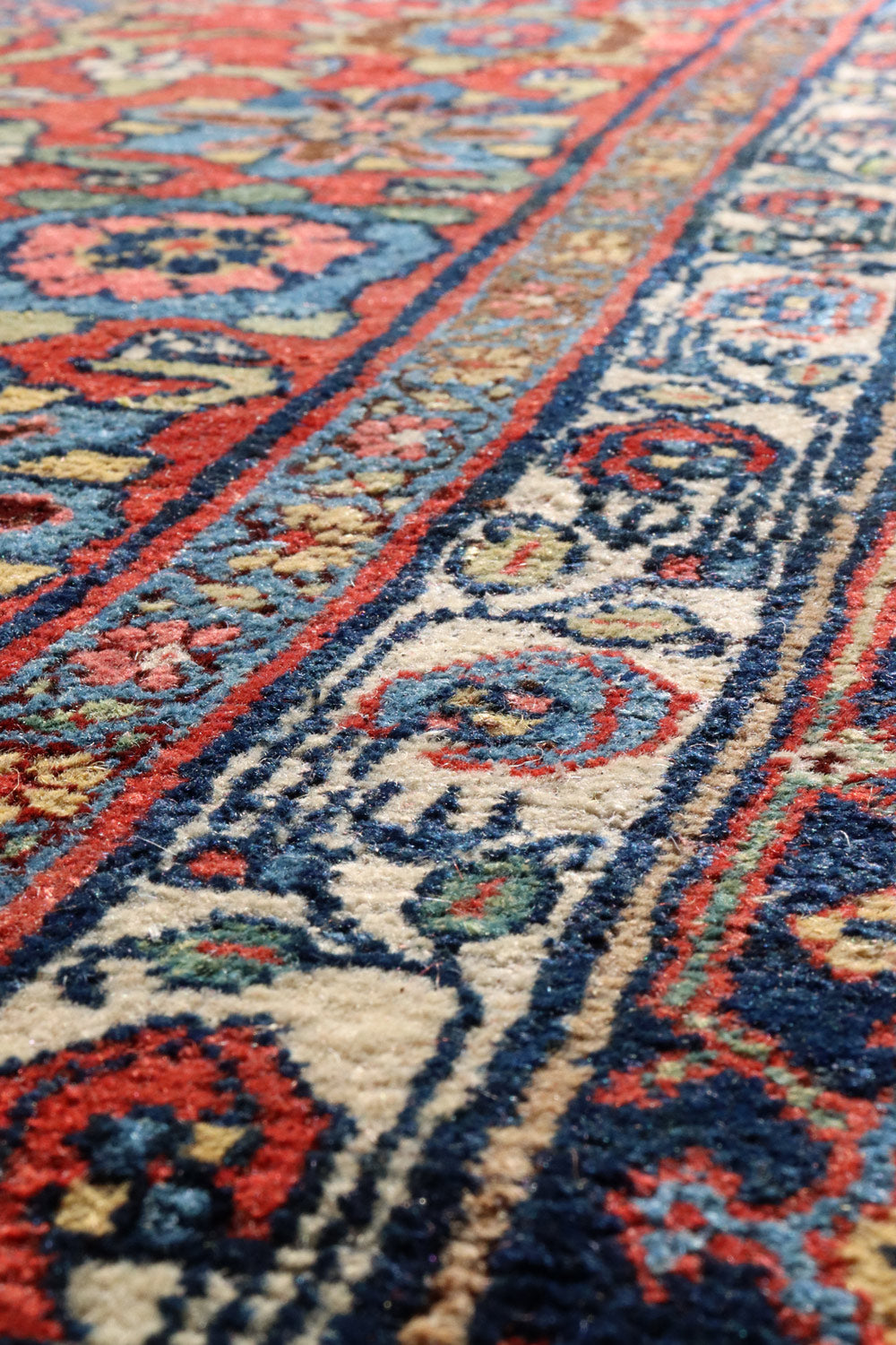 The main border of the rug encompasses multiple layers, each containing intricate designs. The largest layer features a repeating floral pattern with alternating colors, while the inner and outer borders are smaller and showcase simpler geometric and floral designs. The border colors complement the central field yet are slightly more subdued, utilizing more blues and creams to achieve a cohesive look.