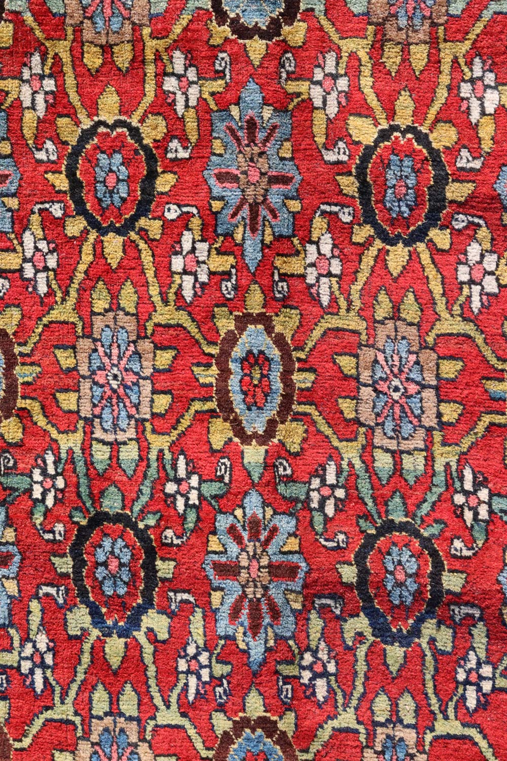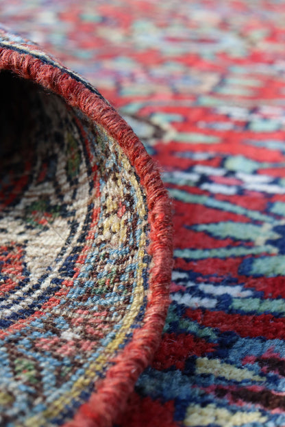 The main background of the rug is a deep, rich red, accented by a navy border. The patterns on this rug are dense and repeated, consisting mainly of a combination of floral and geometric motifs. Predominant motifs include rosettes, stylized flowers, and leaves, which are symmetrically arranged across the rug’s field. The colors used within the motifs include vibrant shades of blue, mustard yellow, white, and various tones of red and orange. These hues contrast effectively against the red background, highlighting the intricate designs.