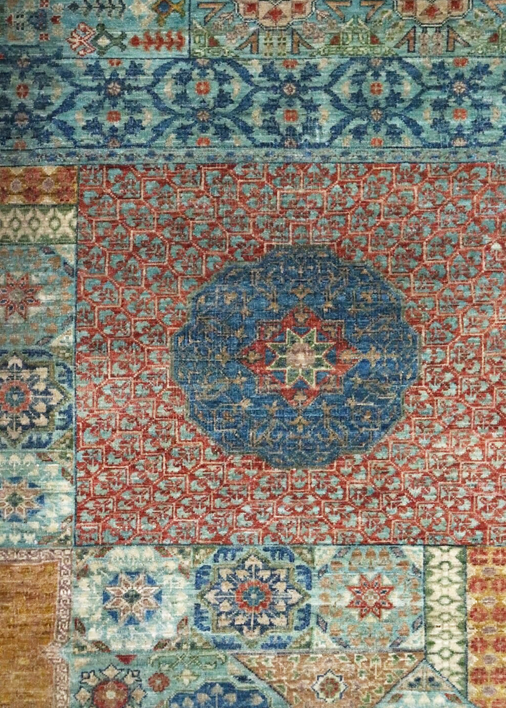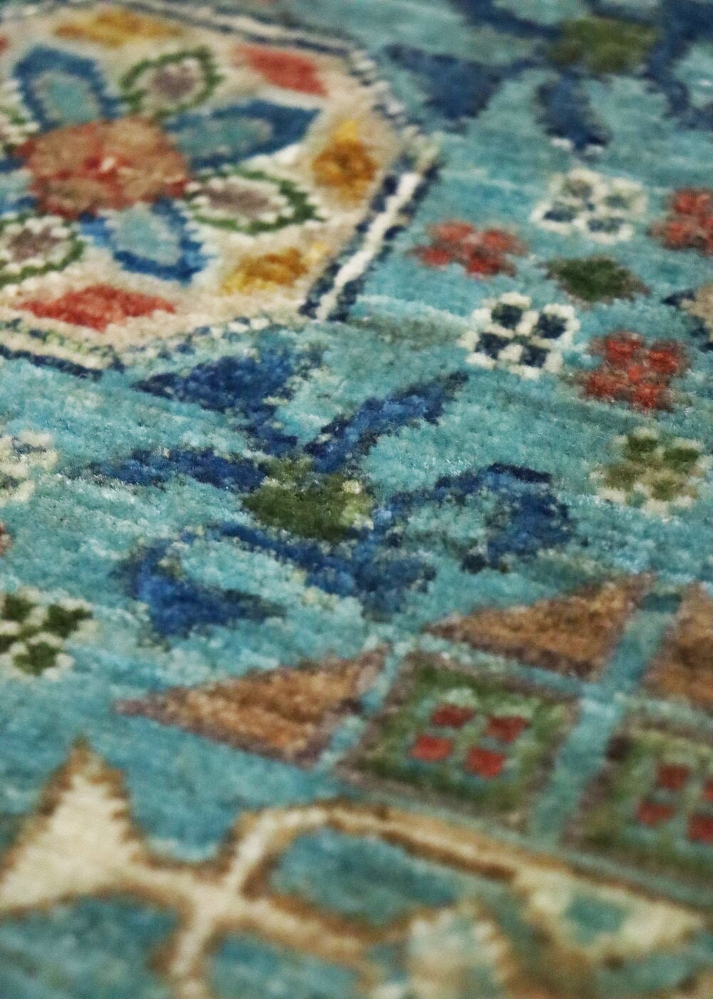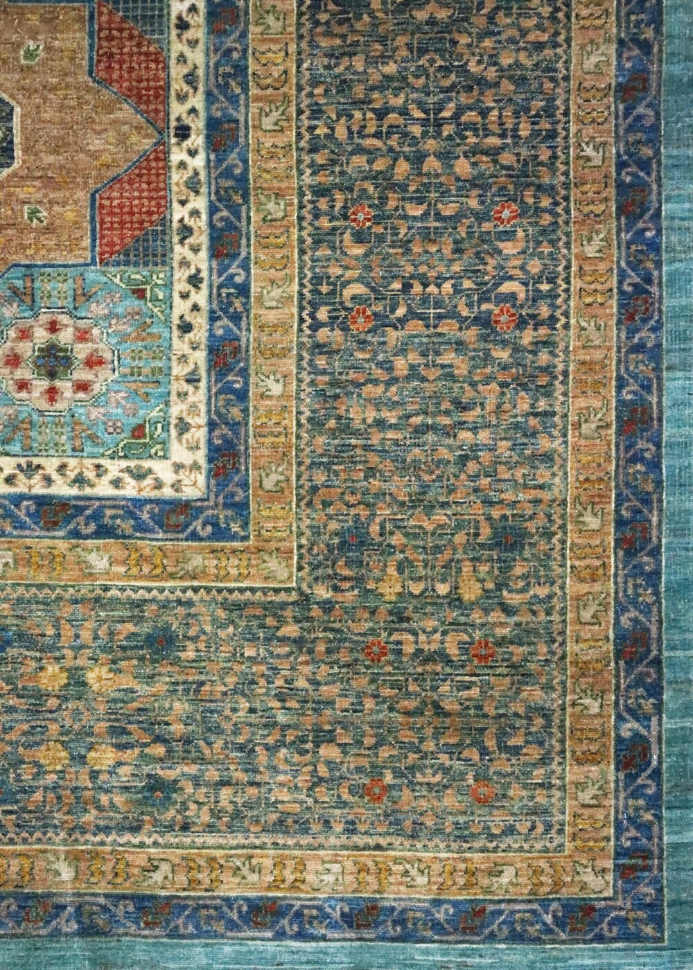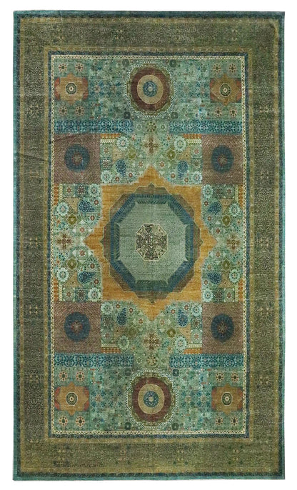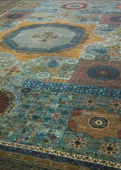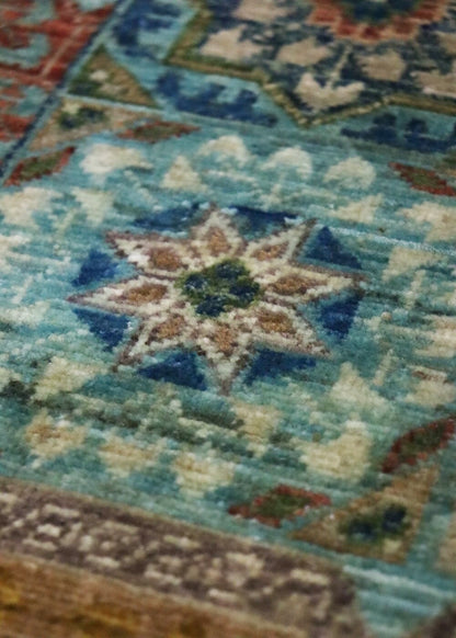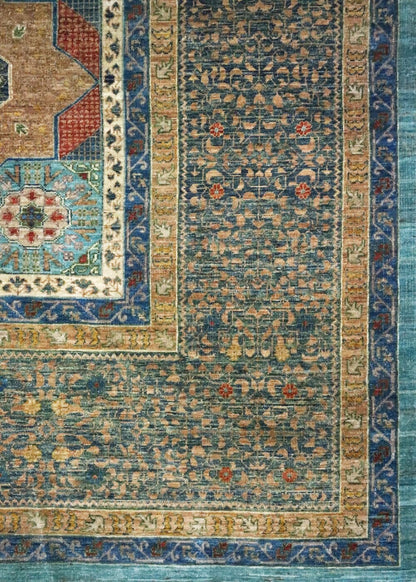 This Afghani rug features a tribal Mamluk design, known for its geometric motifs and vibrant colors. The background of the rug is a striking turquoise, while the border is a rich jade. The main color of the rug is teal, creating a harmonious and eye-catching palette.