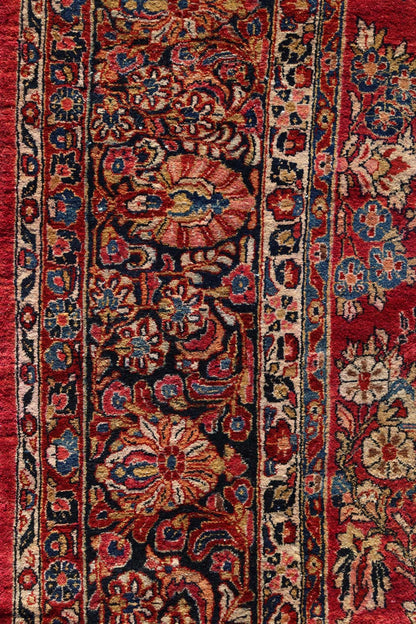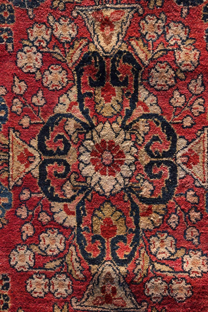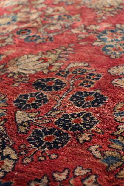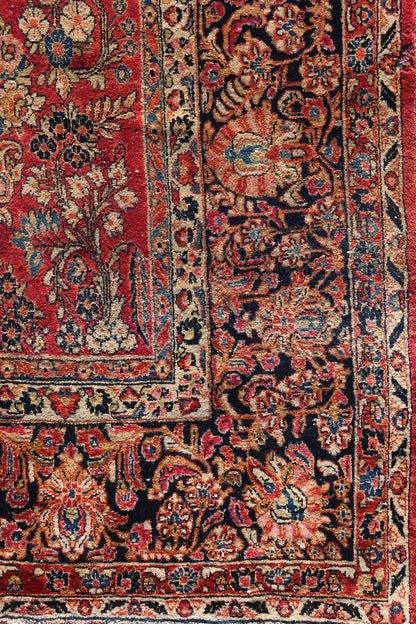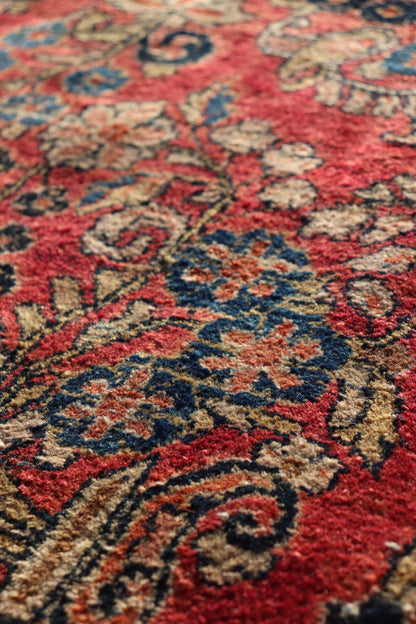 This antique Persian Sarouk rug, originating around 1930, exemplifies traditional Persian design with a focus on floral and arabesque motifs. Crafted from high-quality wool on a cotton foundation, this rug features a wine-colored background with intricate patterns in shades of red, dark blue, cream, light blue, gold, and brown.