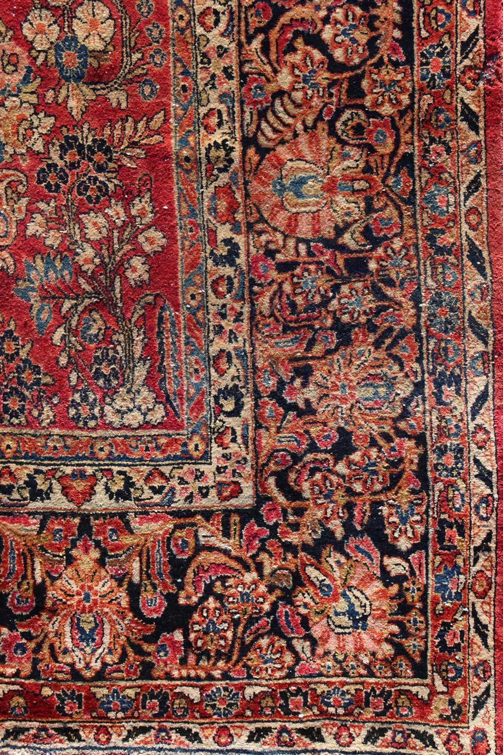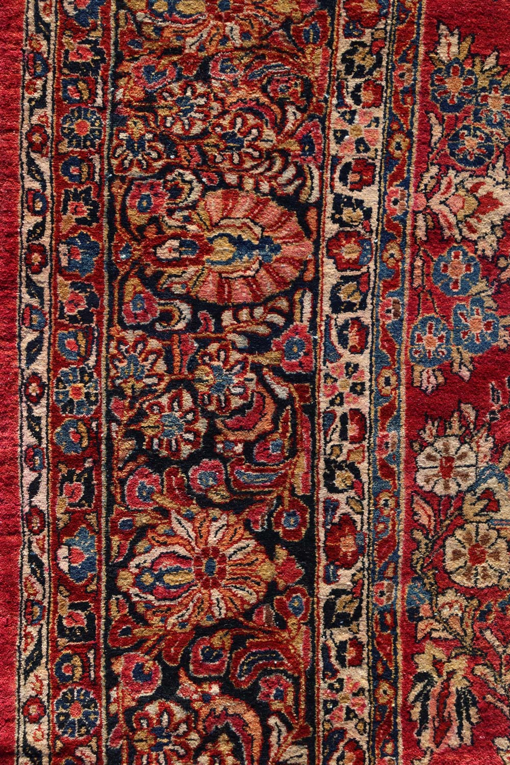 The primary border of the rug is a rich navy blue, adorned with elaborate floral and vine motifs that harmonize with the central design. This main border is flanked by two narrower borders: a cream-colored secondary border and an innermost border that mirrors the style of the secondary but is even more narrow. These borders not only frame the central field but also enhance the overall symmetry of the rug, which is evident along both the horizontal and vertical axes.