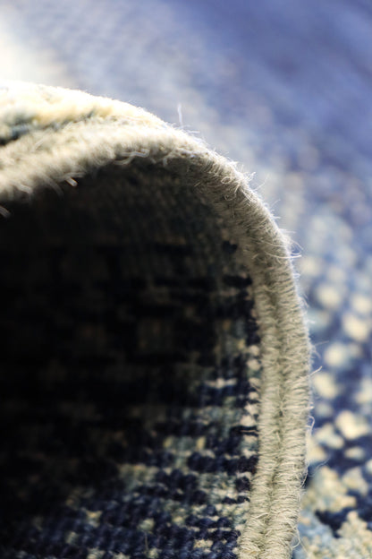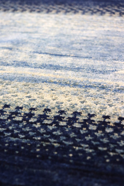 The background of this rug is a captivating navy blue, creating a visually striking canvas for the intricate design to unfold. The border, on the other hand, boasts a serene sky blue, adding a touch of elegance to the overall composition.