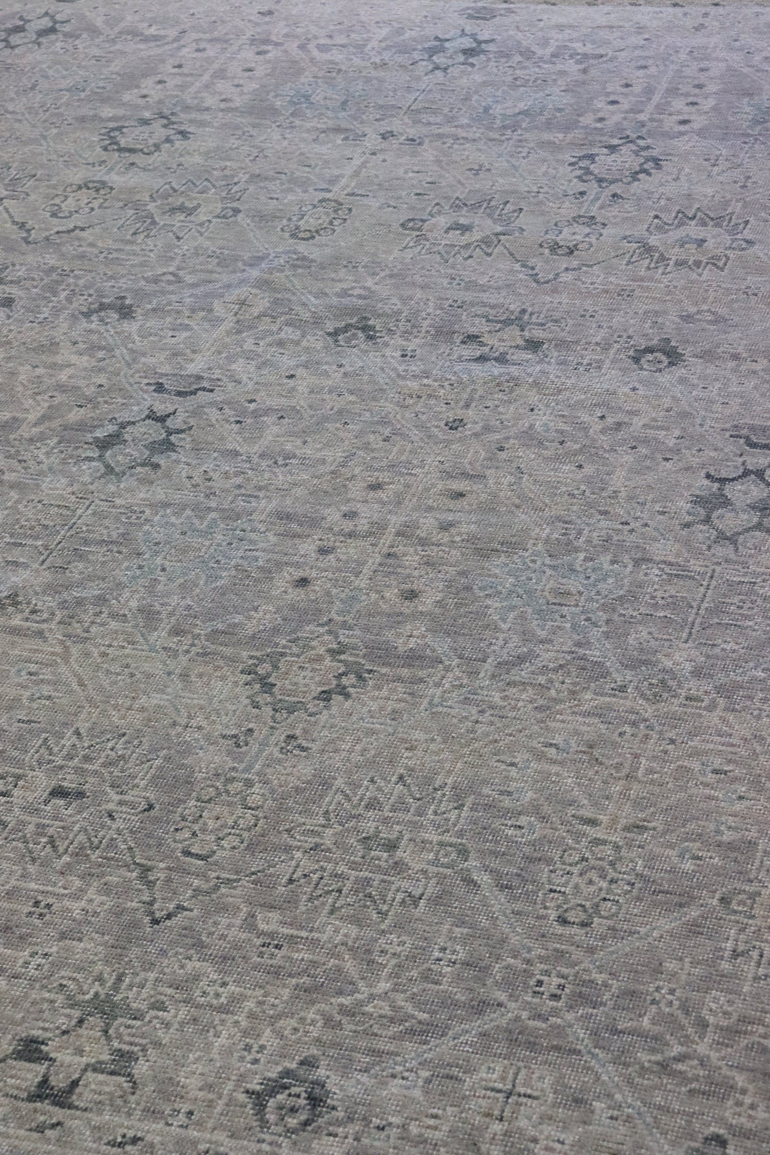 Visually, this rug showcases a detailed pattern with a predominantly muted color palette. Geometric and floral elements interplay, with intricate details adding depth and character to the design. The base color of the rug is primarily grey or beige, accented by hints of blue and darker grey within the intricate motifs. Symmetrical in design, the rug features mirrored elements along the central axis, creating a harmonious and balanced aesthetic. The subtle border seamlessly merges with the central design, contributing to the overall understated elegance of this Indian Ferahan rug.