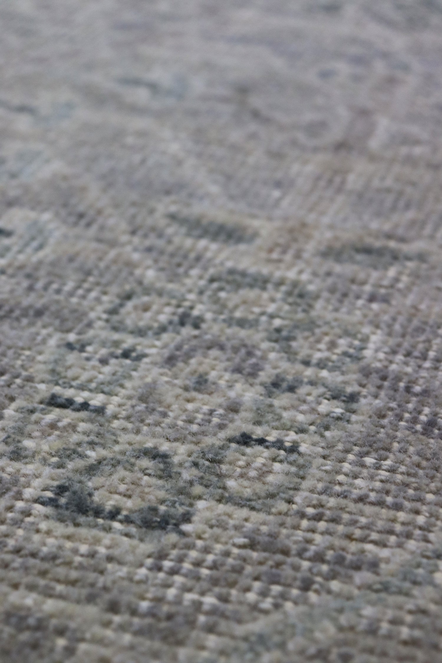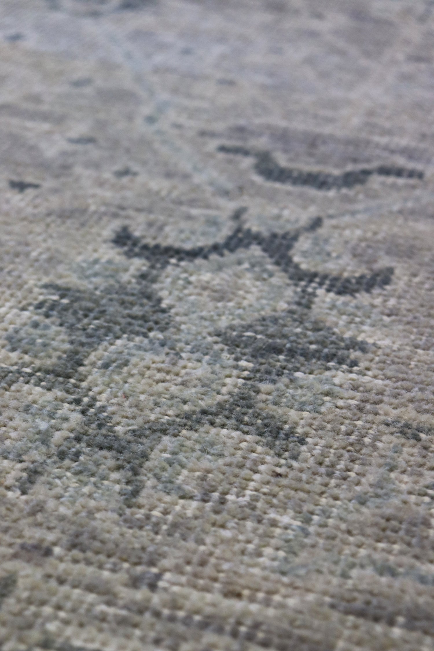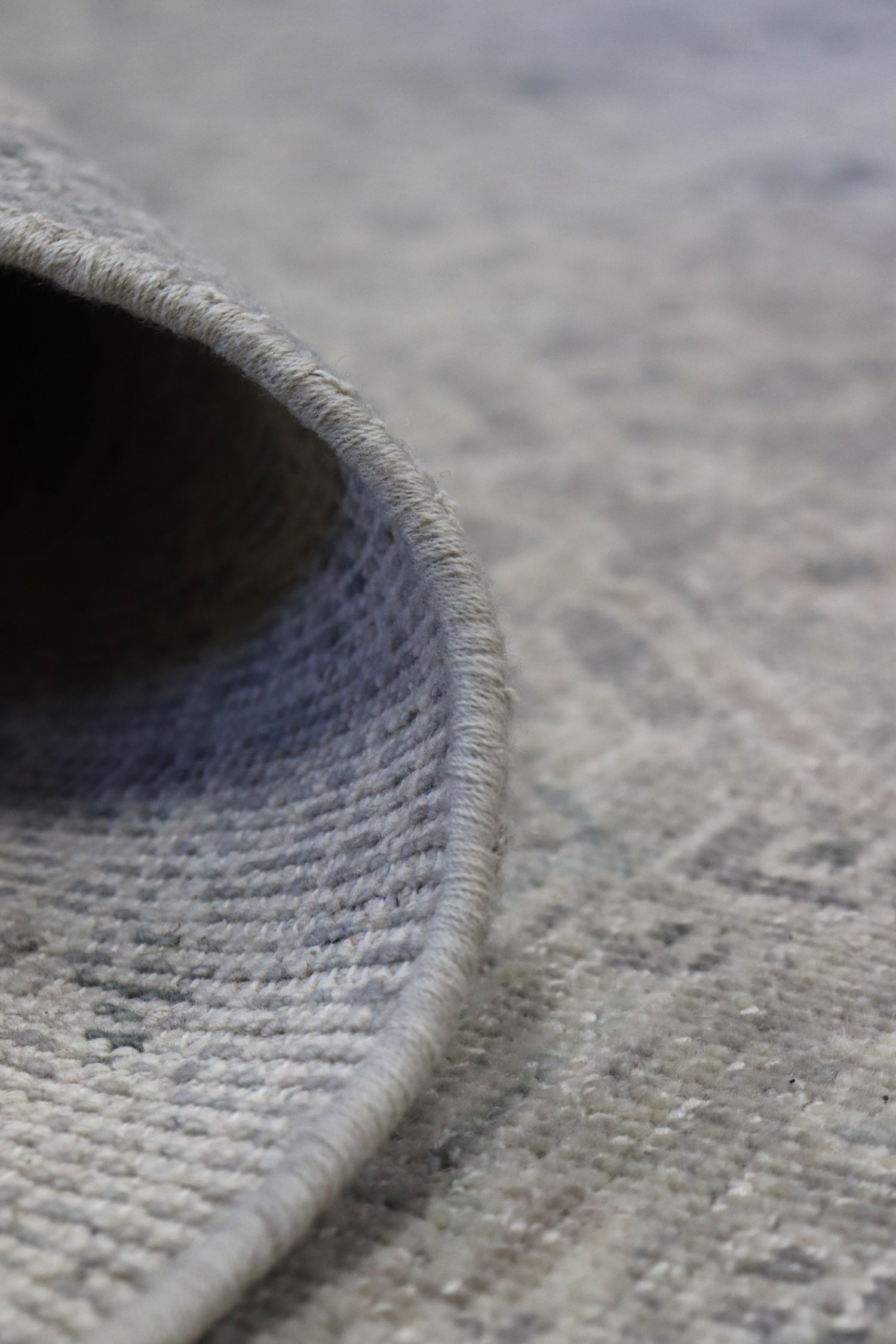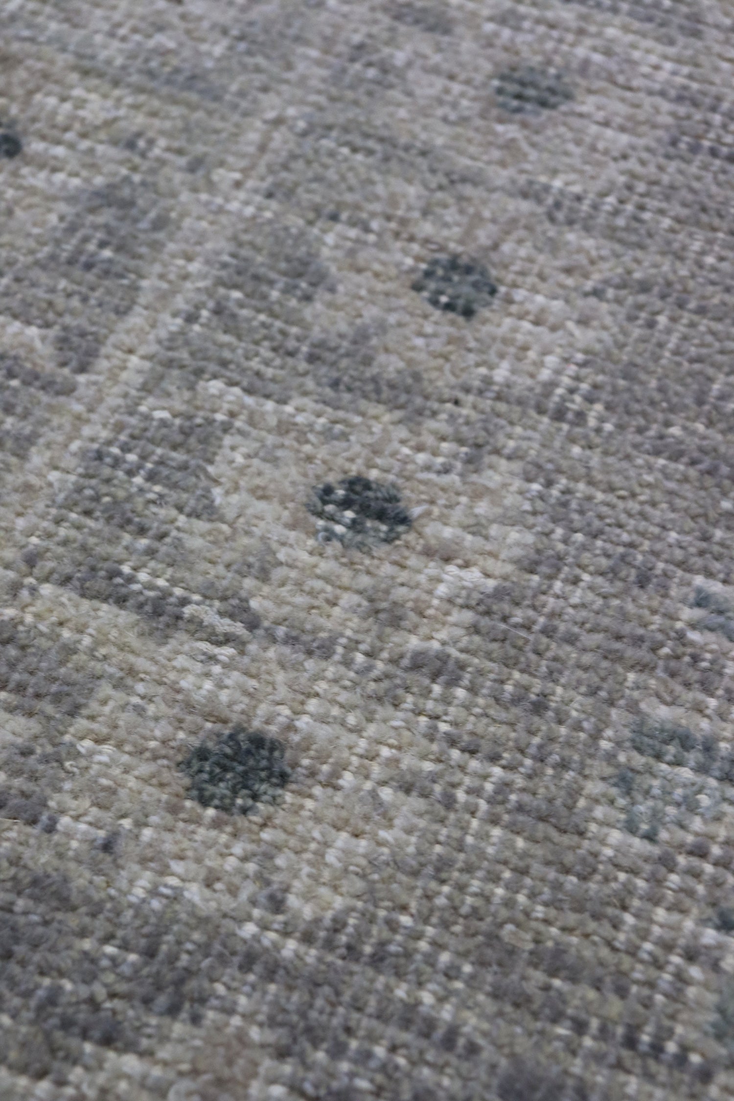 The blend of Ghazni wool imported from Afghanistan and South African wool results in a high-quality texture. The foundation of the rug consists of a thick bottom weft with multiple layers of dense cotton, while the upper weft is finer and threaded loosely through the warps, providing a textured appearance akin to antique rugs. The design of this rug draws inspiration from antique Persian and Khotanese carpets, blending traditional and modern colorations seamlessly.