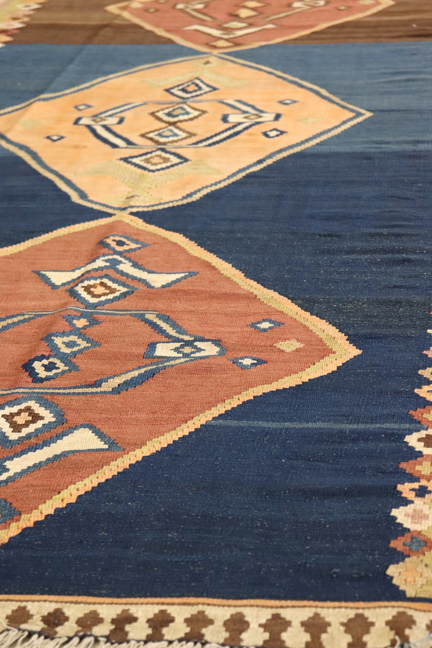 Make your house truly feel like home with our Vintage Bijar Kilim Handwoven Tribal Rug (J67873). It's vintage (circa 1930) and tribal. It’s blue on medium blue with orange accent colors. It’s a Kilim style rug with a Bijar Kilim motif. All things you gravitate towards when it comes to aesthetics and design in your space. Being a 4' 10" X 10' 5" rug of wool flatweave on a cotton foundation, you can rest assured that this piece will do more than just make the visual impact and create the vibe you want. It comes from the fine Persian tradition of handwoven rugmaking, meaning this rug will serve you well and look terrific for years. Add that extra special personal touch today with your own Vintage Bijar Kilim Handwoven Tribal Rug.
