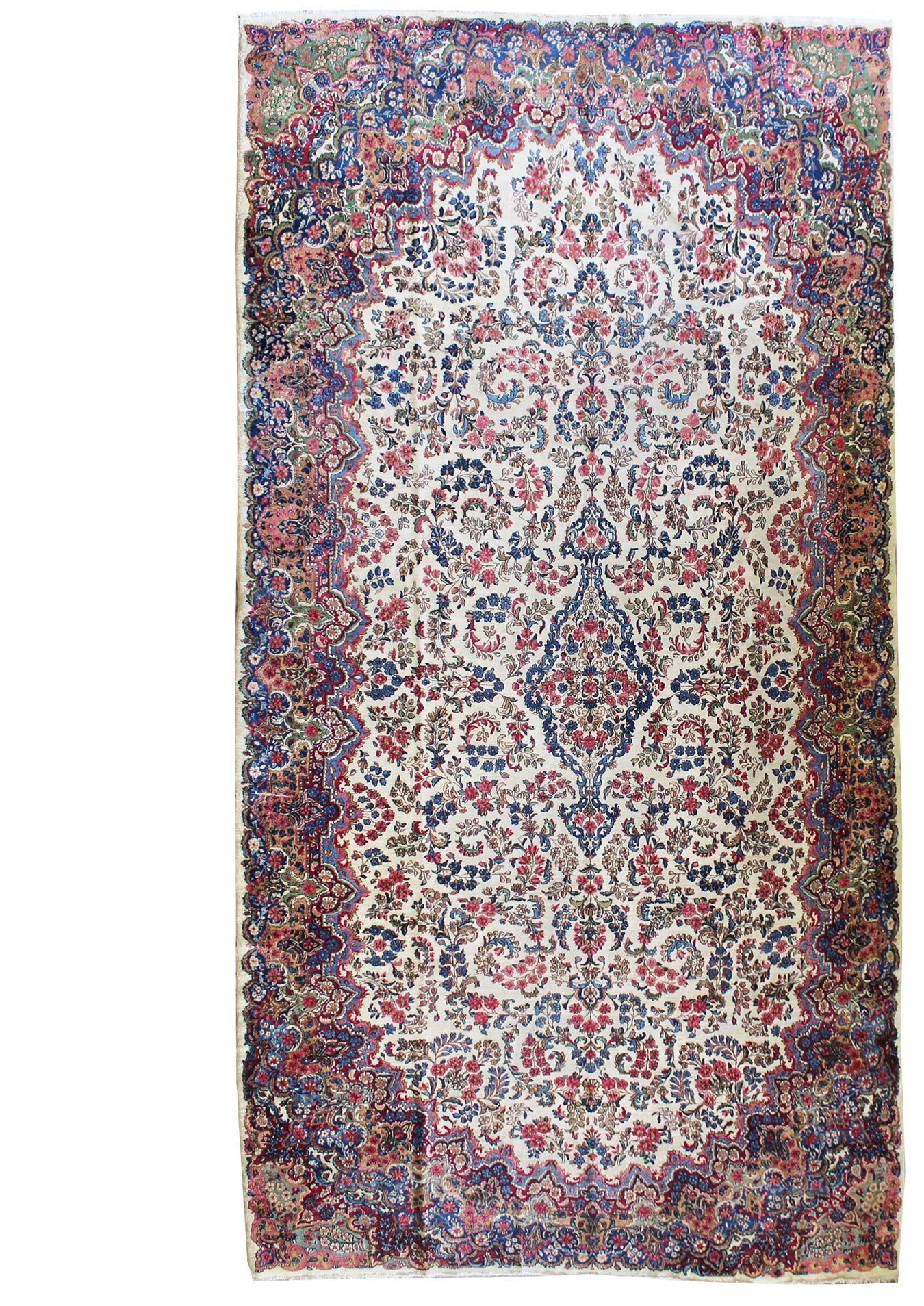 The region’s high-quality wool is a significant factor contributing to the durability and fine texture of Kerman rugs. This particular rug’s intricate pattern includes various motifs such as flowers, leaves, and vines, all interwoven to create a harmonious and lush appearance. The main color, ivory, serves as a subtle backdrop to these ornate designs, which are highlighted with deep blues, rich reds, and subtle hints of green and beige.