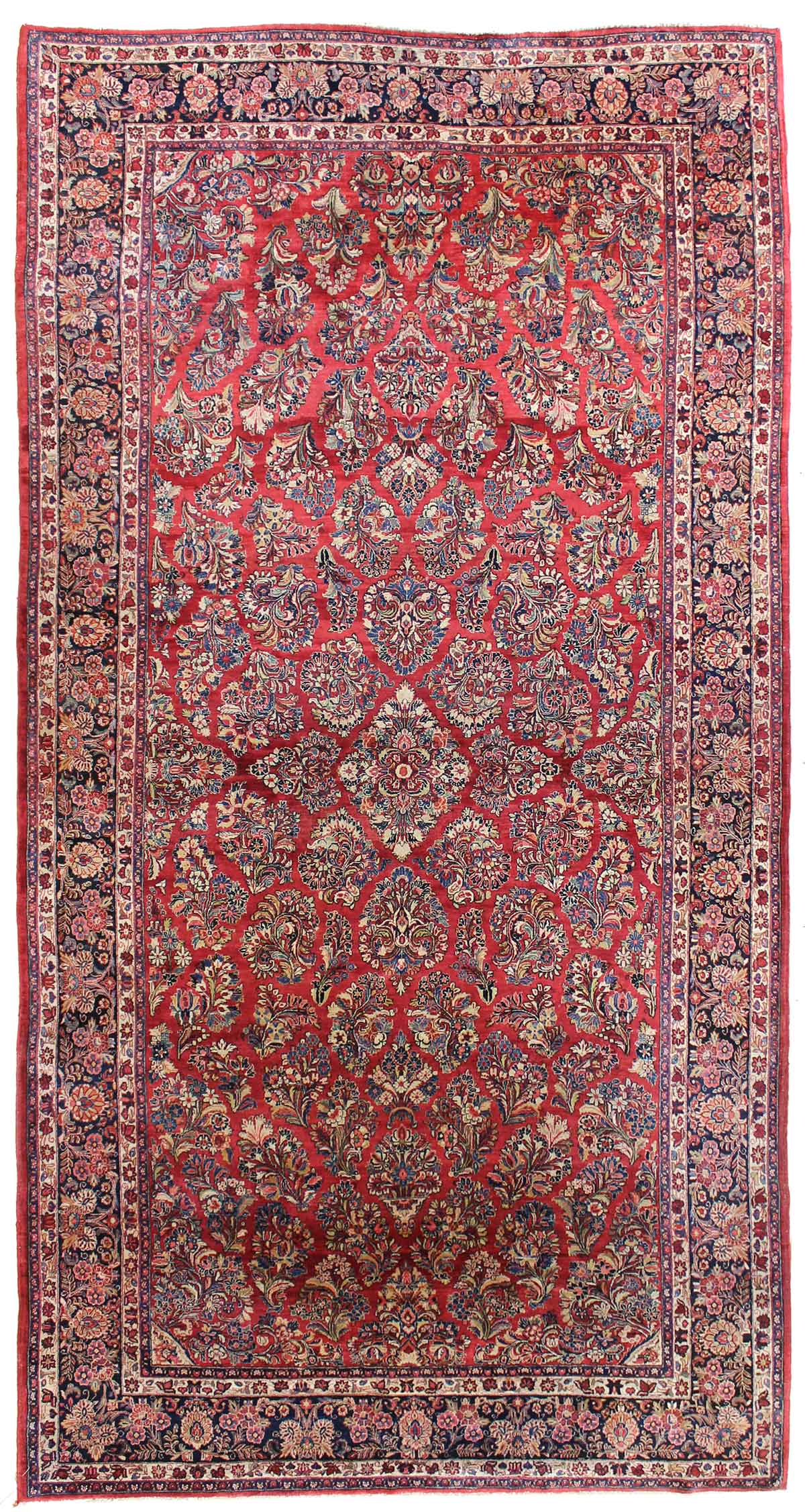 Sarouk rugs are renowned for their classic curvilinear vine scrolls and elaborate arabesques. The designs often incorporate local motifs filled with floral elements, emphasizing the richness of Persian carpet-weaving traditions. Typically, Sarouk rugs display either medallion-and-corner layouts or allover patterns, often featuring intricate arrangements of bouquets and foliage.