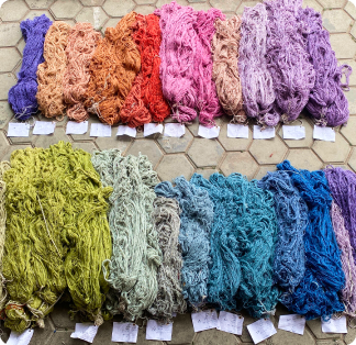 Our designer will help you choose colors from our extensive palette. If you do not find the exact color, do not despair. We can match just about any shade. If you like a stippled or brindled effect, we can mix yarns of different colors together. Color poms show various colors on wool and silk. Our weavers in Nepal use the same color poms to ensure an exact match of your selection for the dyeing process.
