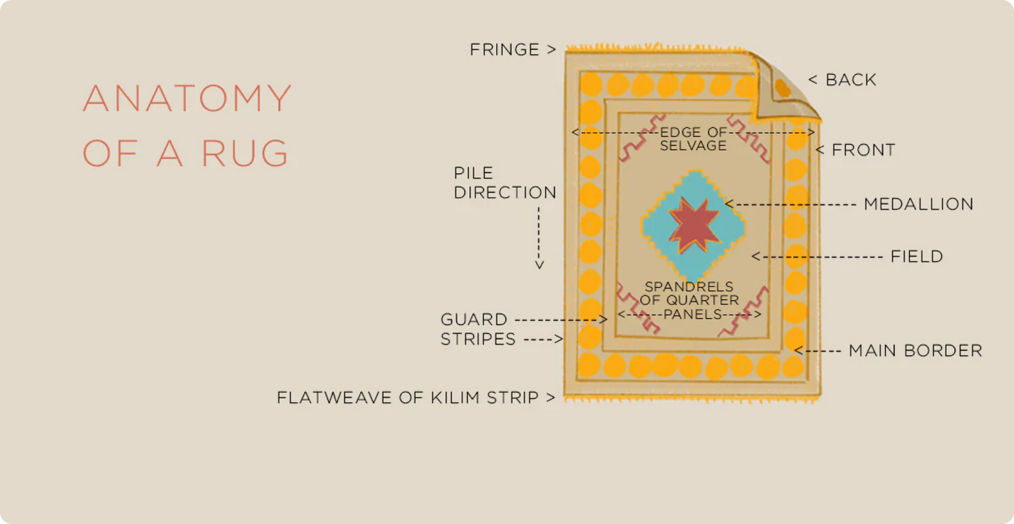 rug parts like field, borders, medallions, and all-over design options. Explore Our Rugs.