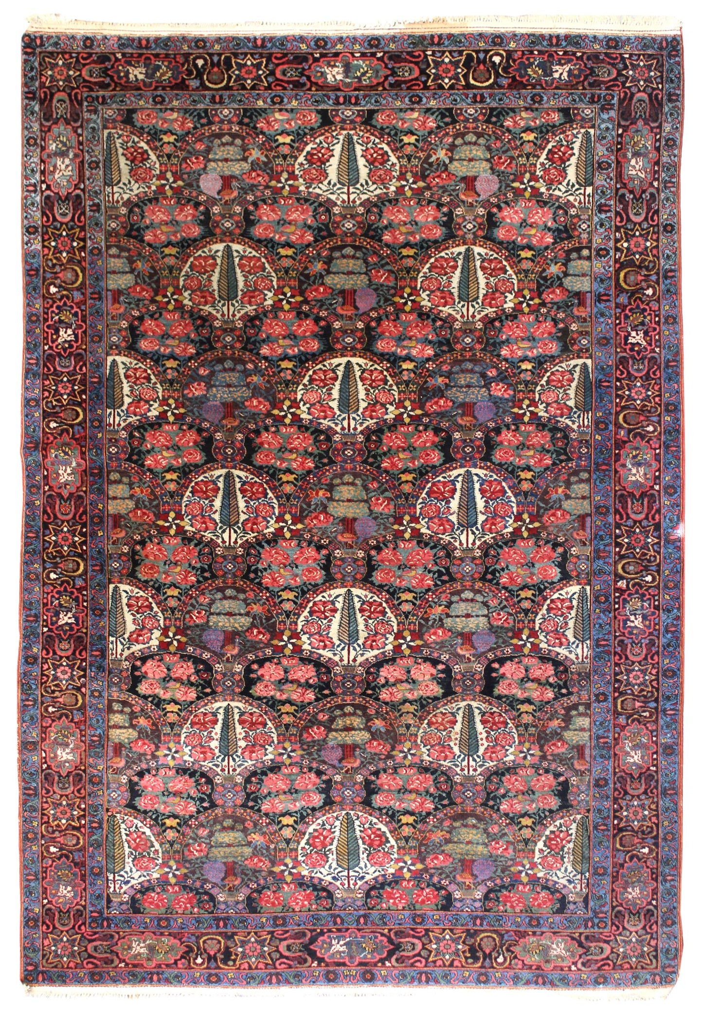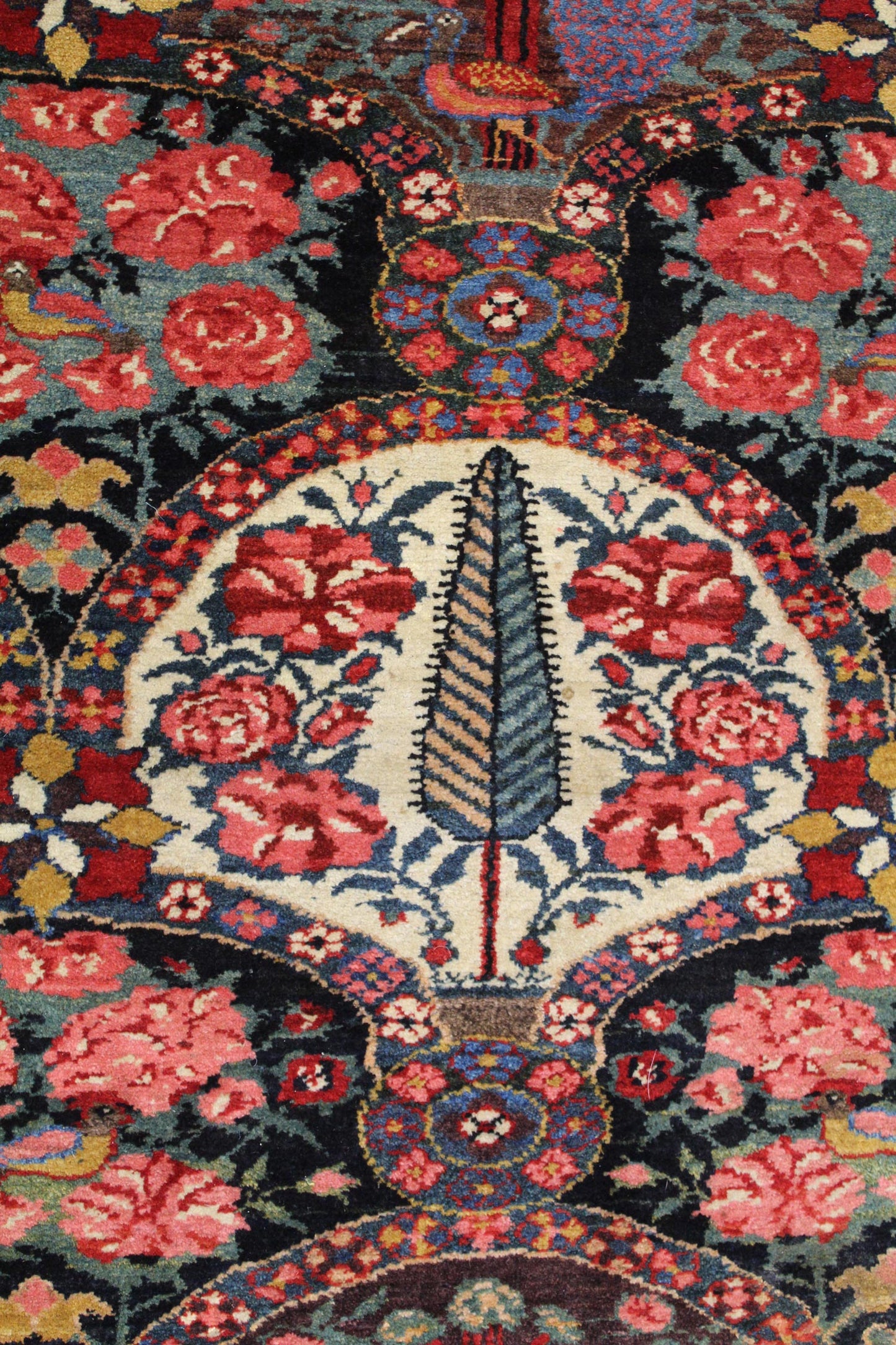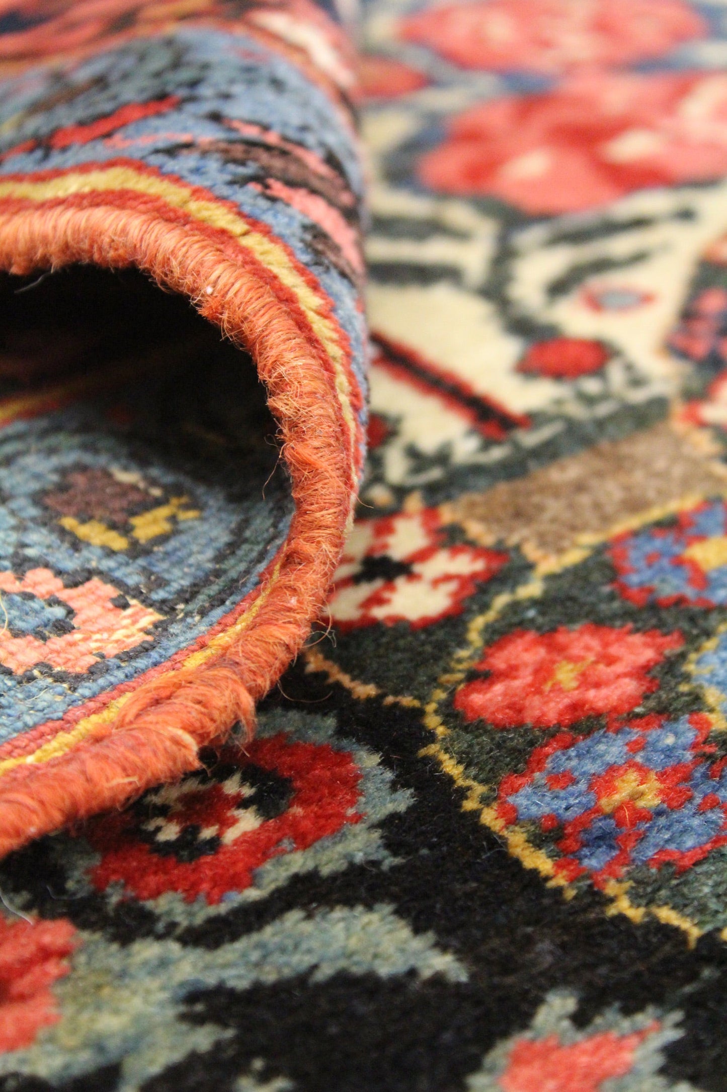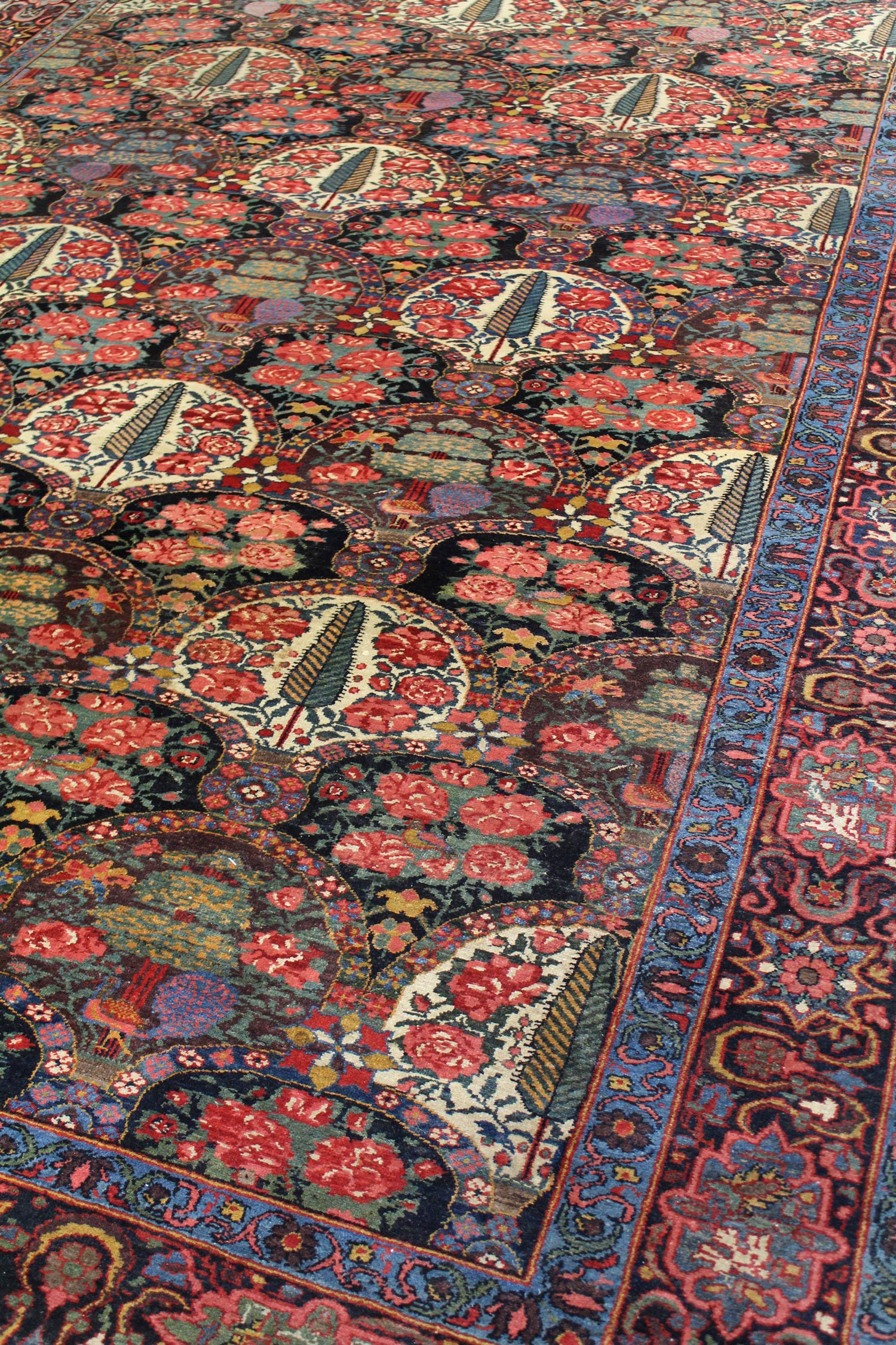 The design of the rug is characteristic of Bakhtiari style, incorporating a blend of tribal and urban motifs. The central field features a repeating motif of arch-shaped elements arranged in a grid-like pattern. Each arch is intricately filled with floral and geometric designs, showcasing detailed artistry and a high density of patterns. The background of the rug is a deep ebony hue, providing a stark contrast to the vibrantly colored motifs within each arch. Rich reds, blues, whites, and greens populate these arch-shaped figures, enhancing the visual appeal with their saturated tones.