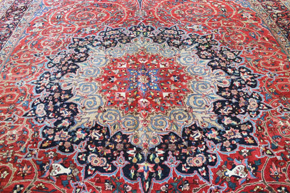 Bakhtiari rugs are distinguished by their intricate patterns and a harmonious blend of nomadic tribal motifs with urban design influences. This particular rug exhibits a prominent central medallion, which is a focal point of its design. The medallion, radiating from the center, comprises multiple layers of patterns in red, cream, black, and blue, adding depth and intricacy to the piece.