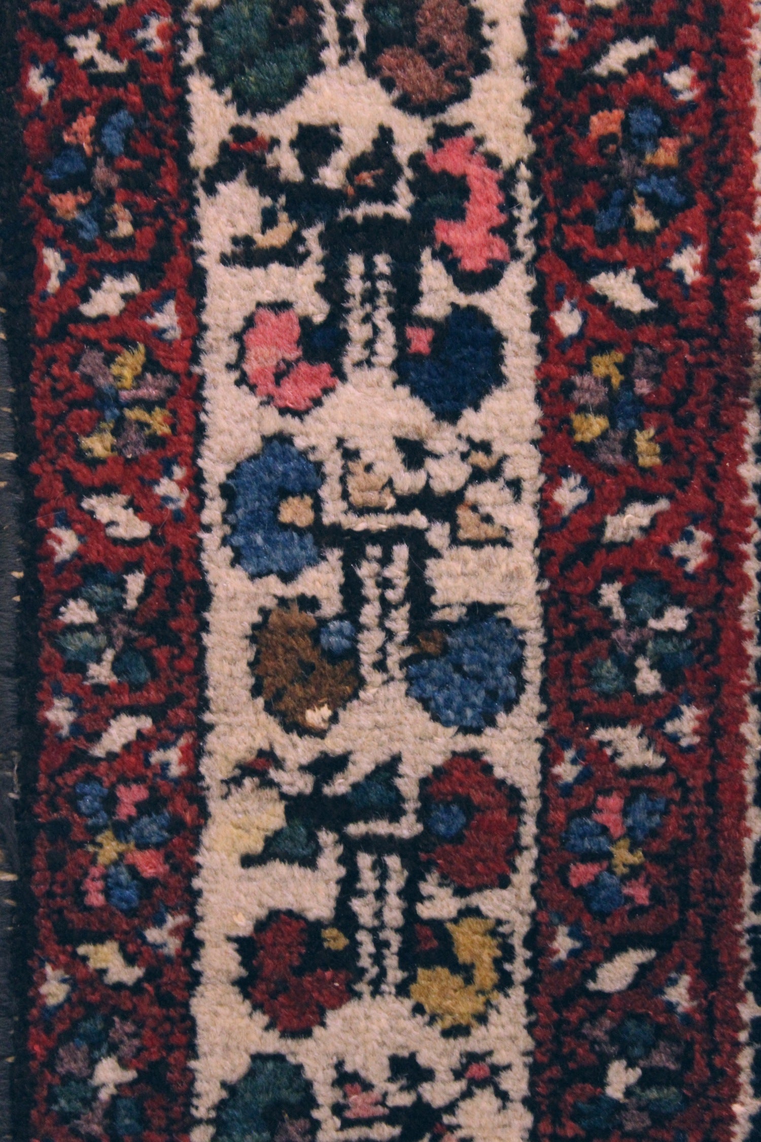 Symmetry is a key aspect of this rug's layout, with patterns mirrored perfectly along a vertical axis. This symmetry, typical of Bakhtiari rugs, enhances the visual harmony and balance of the piece. The density of the patterning is medium to high, ensuring that the eye constantly discovers new details without overwhelming the view.
