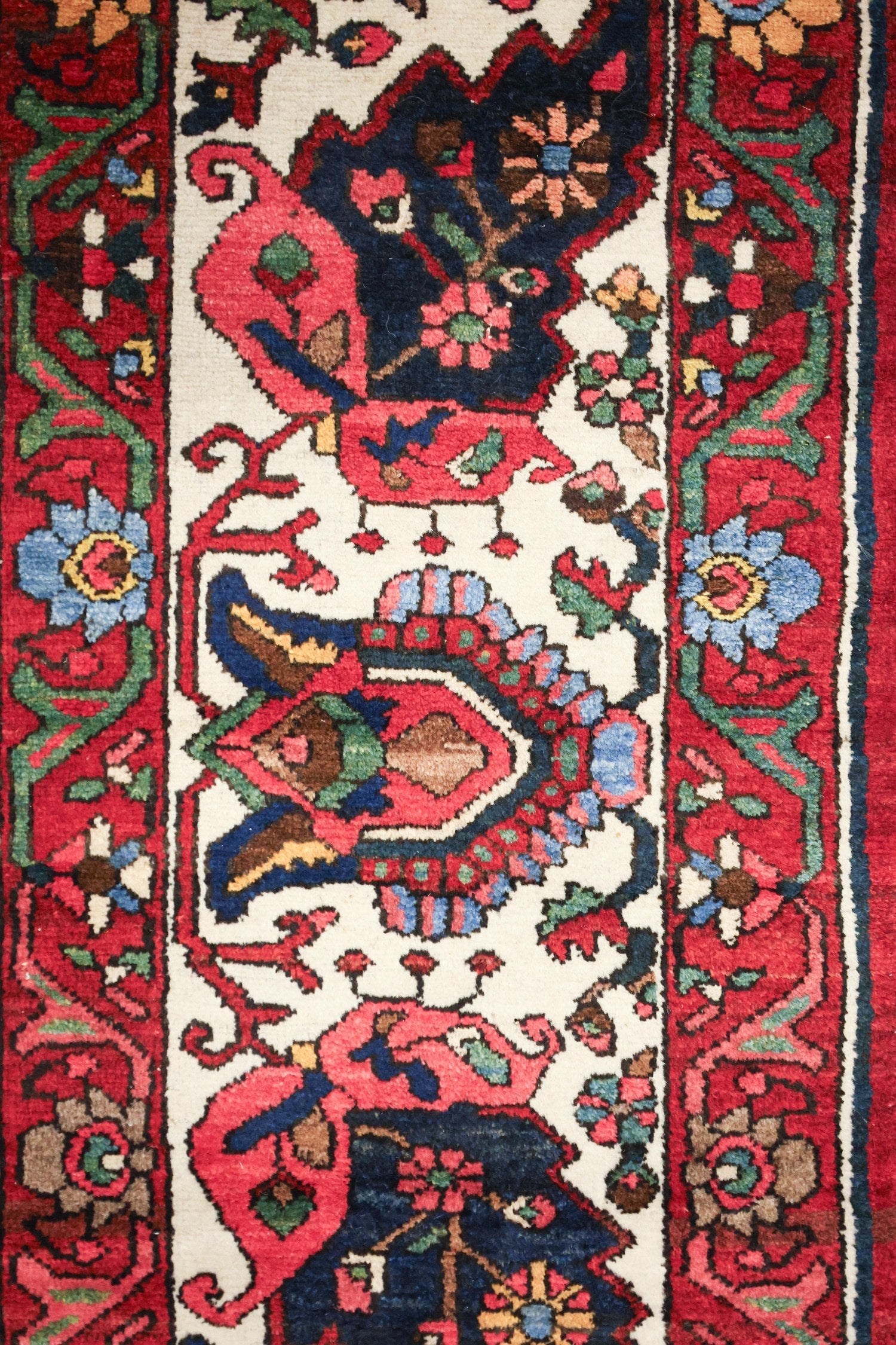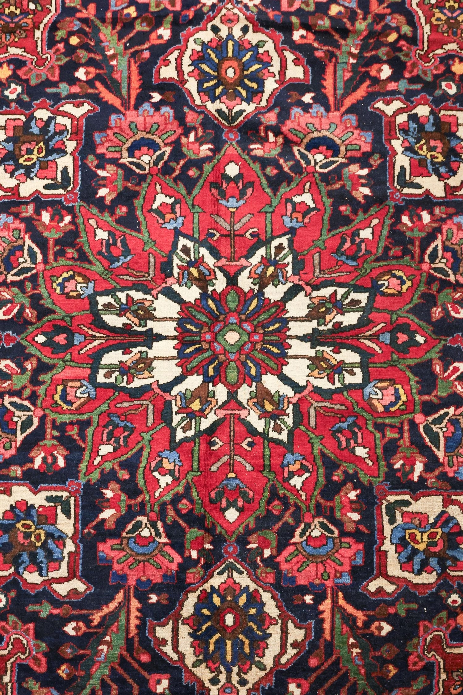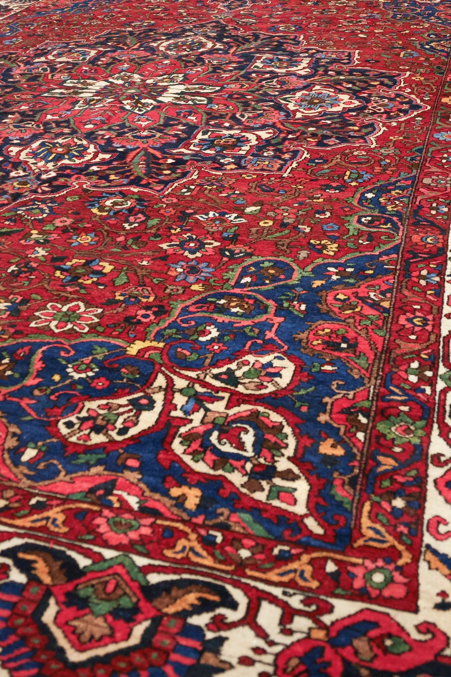 The rug's central medallion serves as a focal point, showcasing a multifaceted, star-like design that draws the eye inward and highlights the rug's intricate details. This element, combined with the rich colors and meticulous craftsmanship, makes it a representative example of Bakhtiari tribal art from the early 20th century.