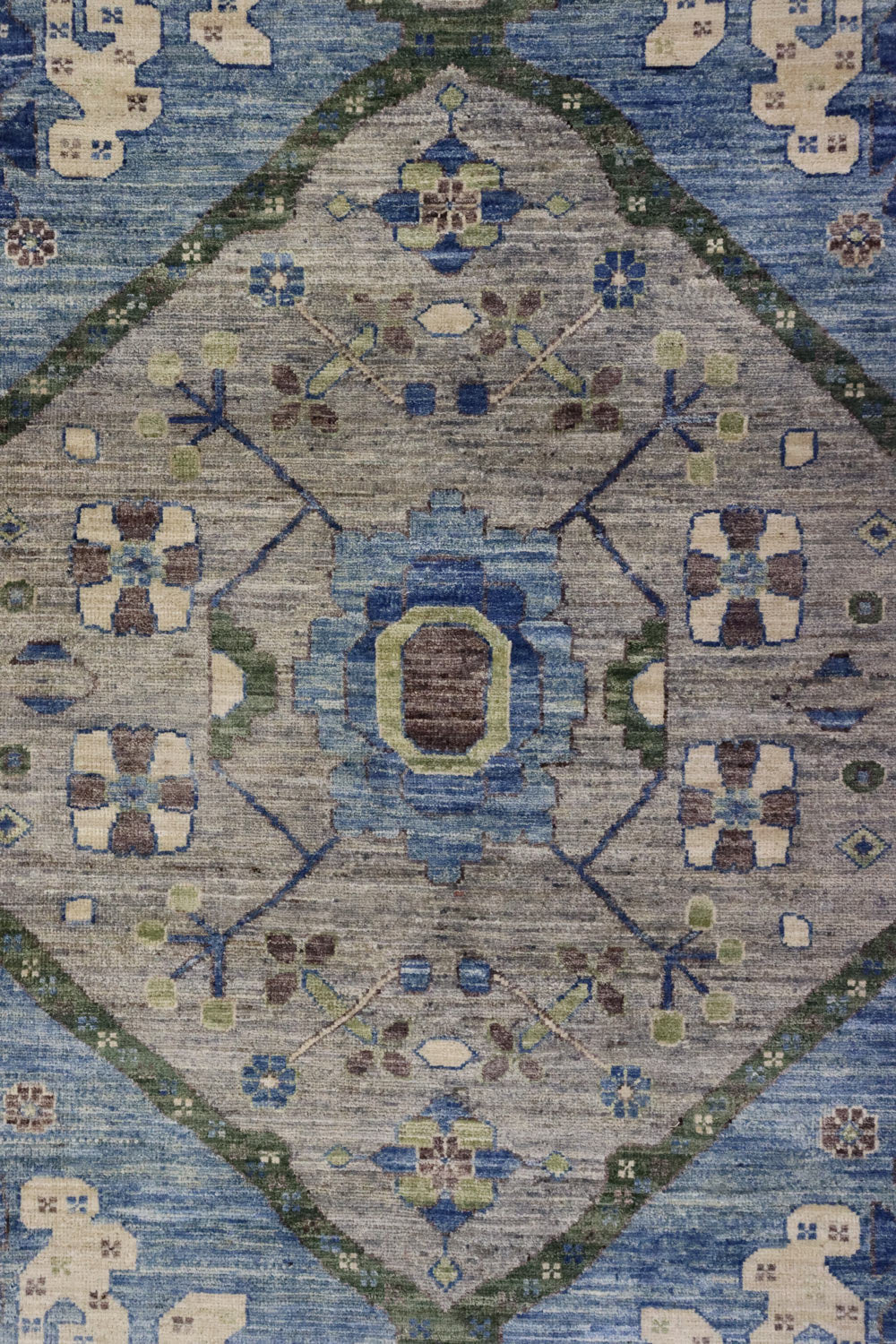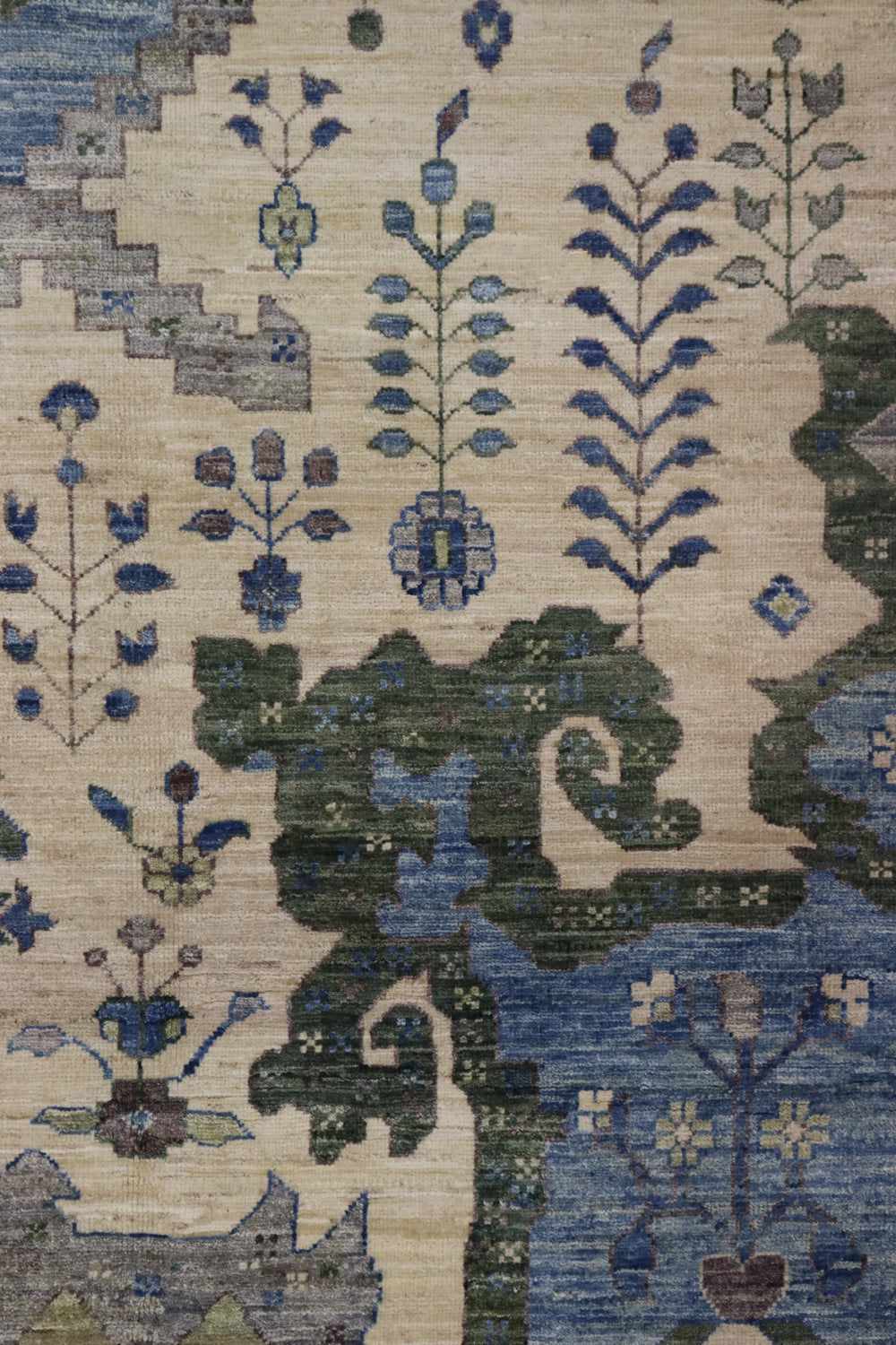 Introducing our exquisite Afghani rug, boasting a captivating Bakshaish design. This tribal-style masterpiece showcases a stunning blue background, gracefully adorned with an ivory border.