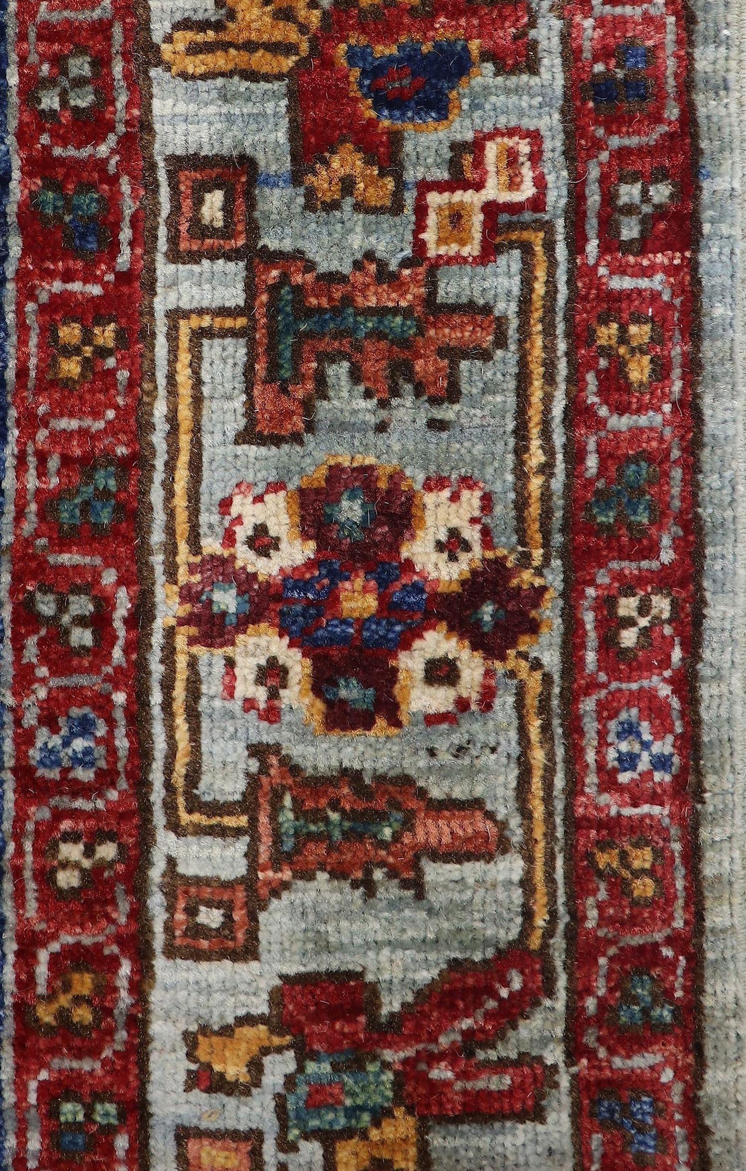 Furthermore, the dyes used to achieve the captivating red color in this rug are derived from natural madder root. Madder root dyes, sourced from the Rubia tinctorum plant, have been cultivated for centuries and are revered for their ability to produce a wide range of warm and cool red, orange, pink, and brown shades. The use of these all-natural dye stuffs pays homage to the rich history and cultural significance of this art form.