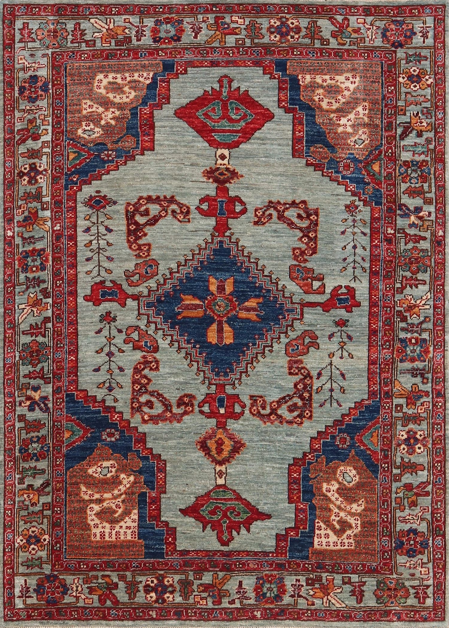 Introducing the exquisite Afghan Bakshaish tribal rug, originating from Afghanistan and boasting a captivating design. This rug showcases the distinctive features of the Bakshaish tribe, with a slate background and a bold red border. Its main color is a sophisticated grey, adding an elegant touch. Crafted with utmost skill and precision, this rug is made of wool on cotton, ensuring both durability and comfort.
