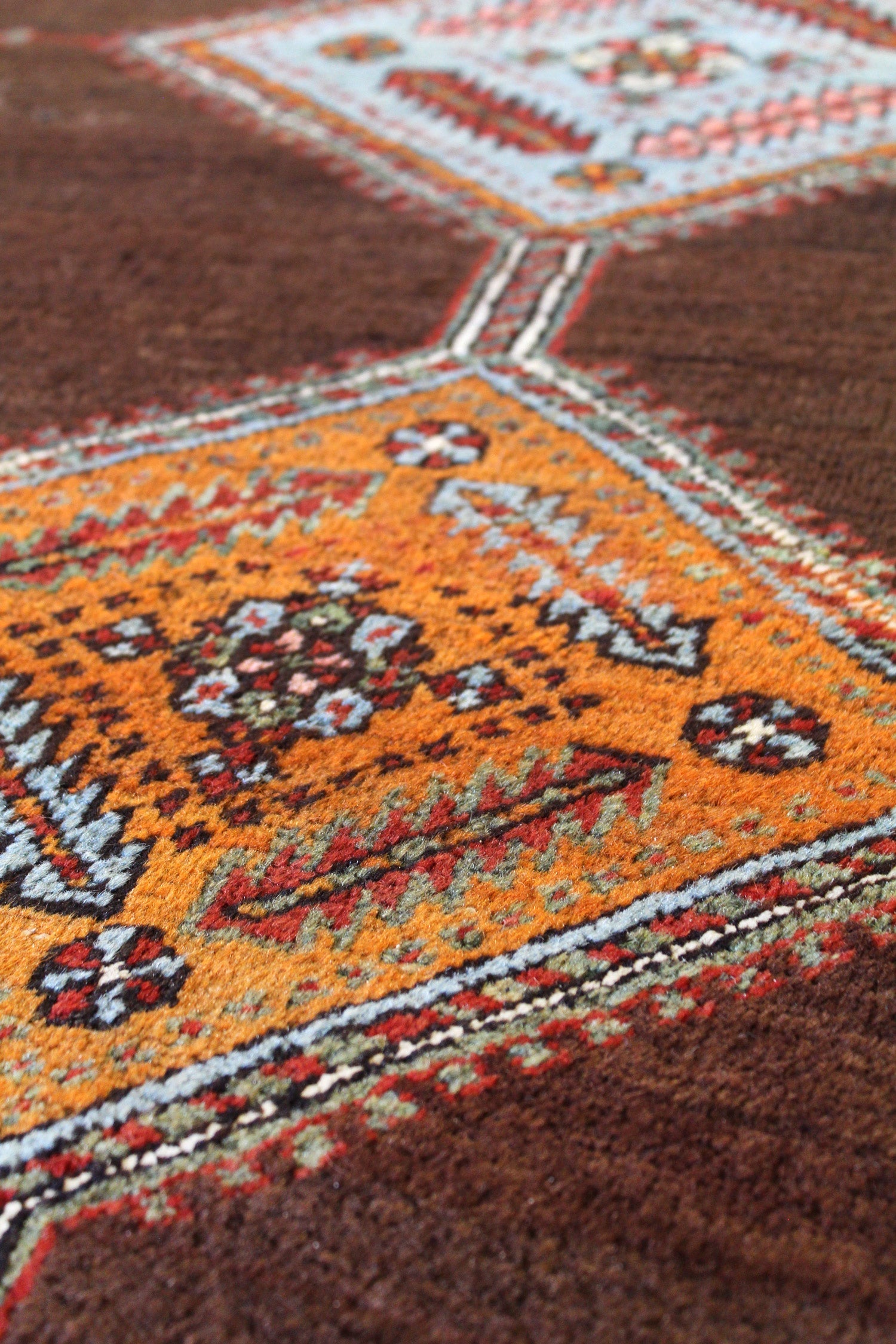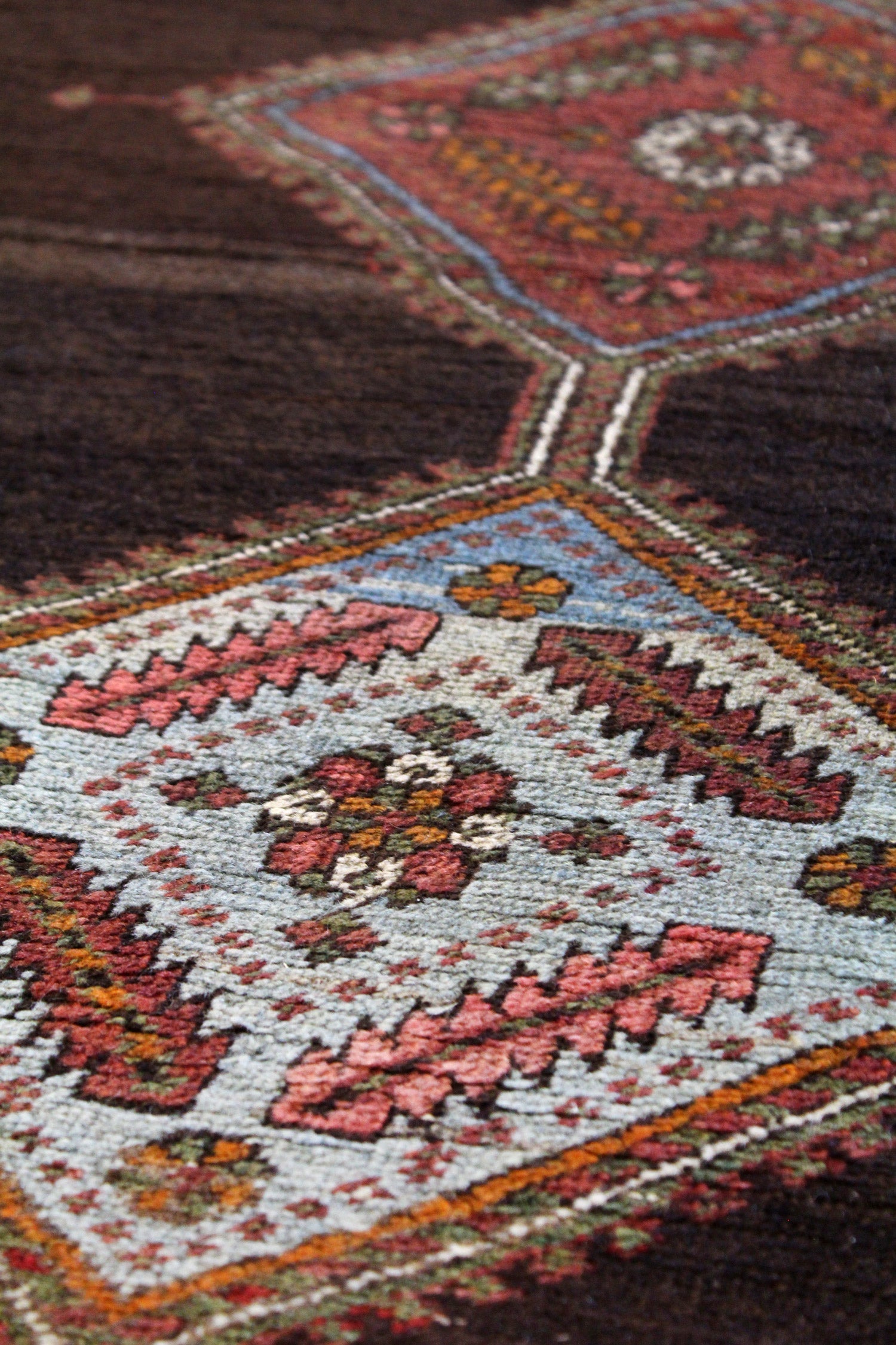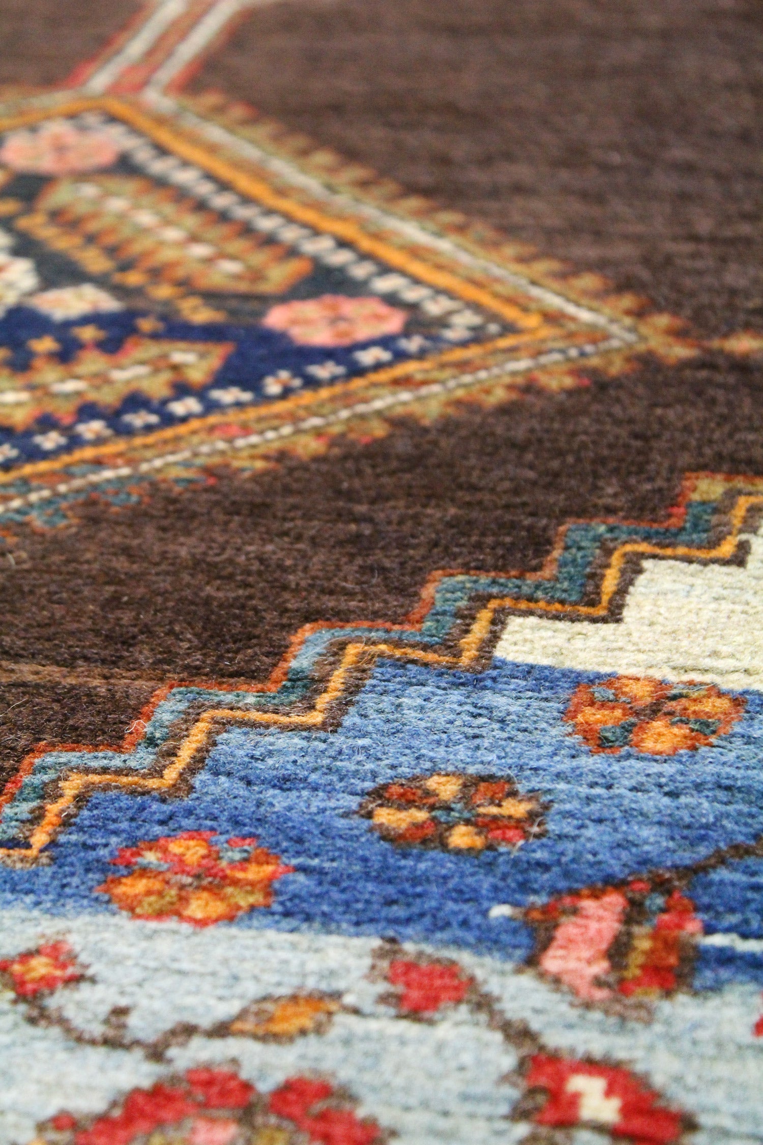 Dating back to circa 1890, this rug is constructed with wool on wool, ensuring durability and a soft underfoot feel. The background exhibits a rich chocolate brown color that forms a striking foil to the intricacies of the central pattern, while the light blue border provides an appealing contrast that frames the composition effectively.