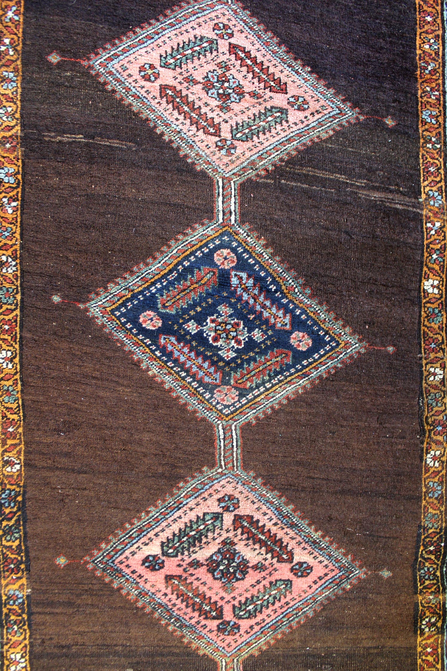 The design features a series of interconnected diamond shapes aligned along the central vertical axis. Each diamond is filled with detailed geometric motifs, offering an intricate and layered visual experience. The dominant colors of this rug are browns, which present a warm and inviting aesthetic. Within the diamonds, a mix of dark blue, light blue, orange, pink, and red introduces a spectrum of vibrant hues against the darker background, enhancing the visual complexity.