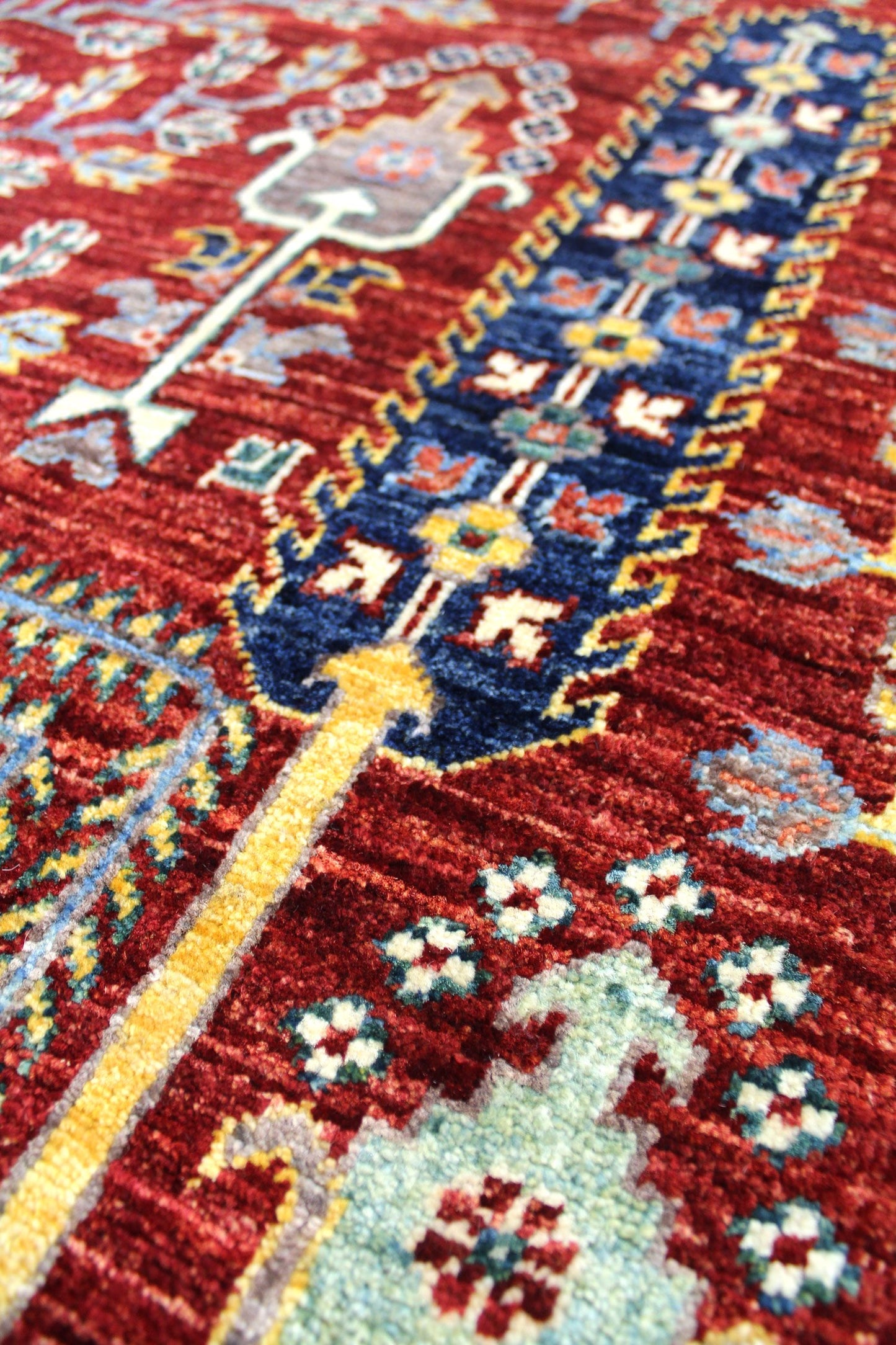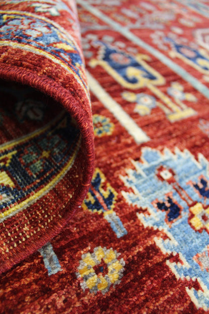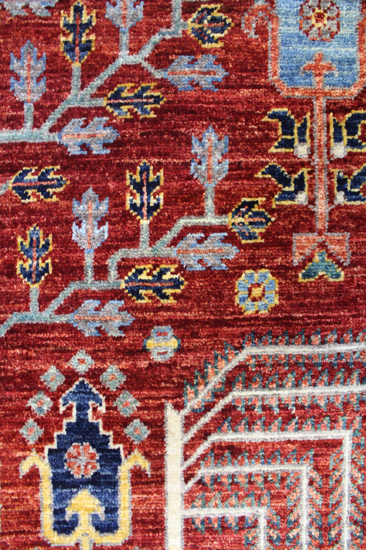 Woven on traditional floor looms in the weavers' homes, this rug showcases an asymmetrical "Persian" knot type, ensuring its authenticity and traditional charm. The cotton warp and weft, along with the all-wool pile, contribute to its durability and longevity. The double wefting and heavily packed depressed warp weaving technique make this rug one of the sturdiest handwoven carpets available.