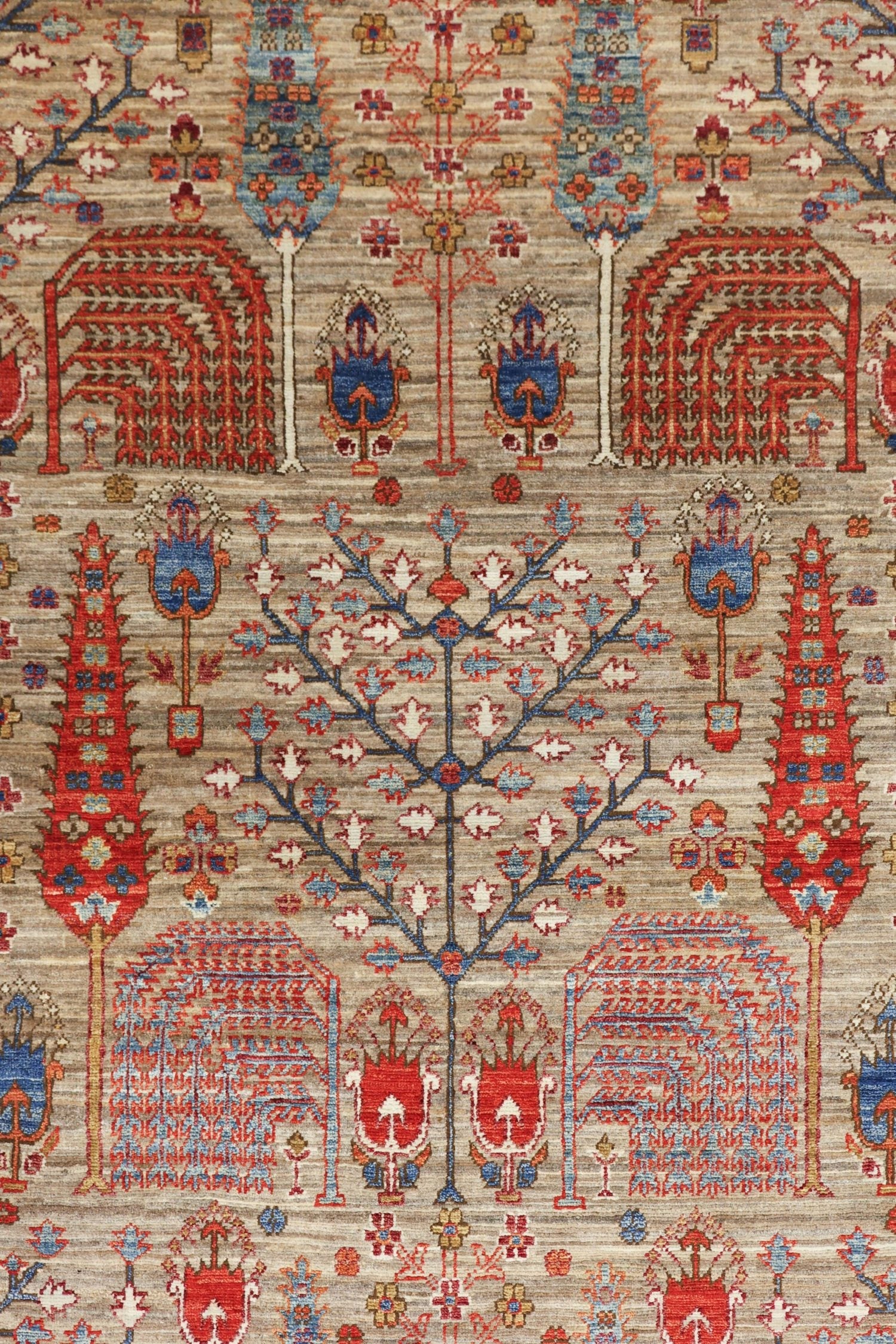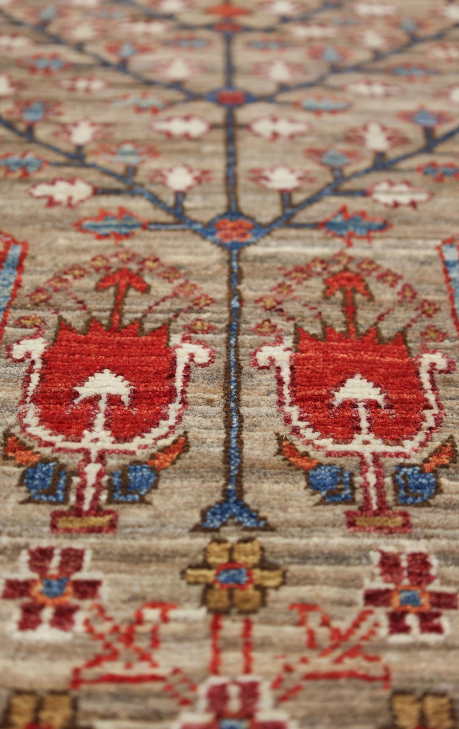 Crafted using traditional techniques and materials, this rug is made of wool on a cotton foundation. The wool used in this rug comes from sheep in the Ghazni Province of Southeast Afghanistan, where the mountainous terrain provides ideal conditions for the production of longer, higher-quality wool. The raw Ghazni wool is then transported to the western side of Afghanistan, near Herat, where it is hand-carved and spun into carpet yarn.