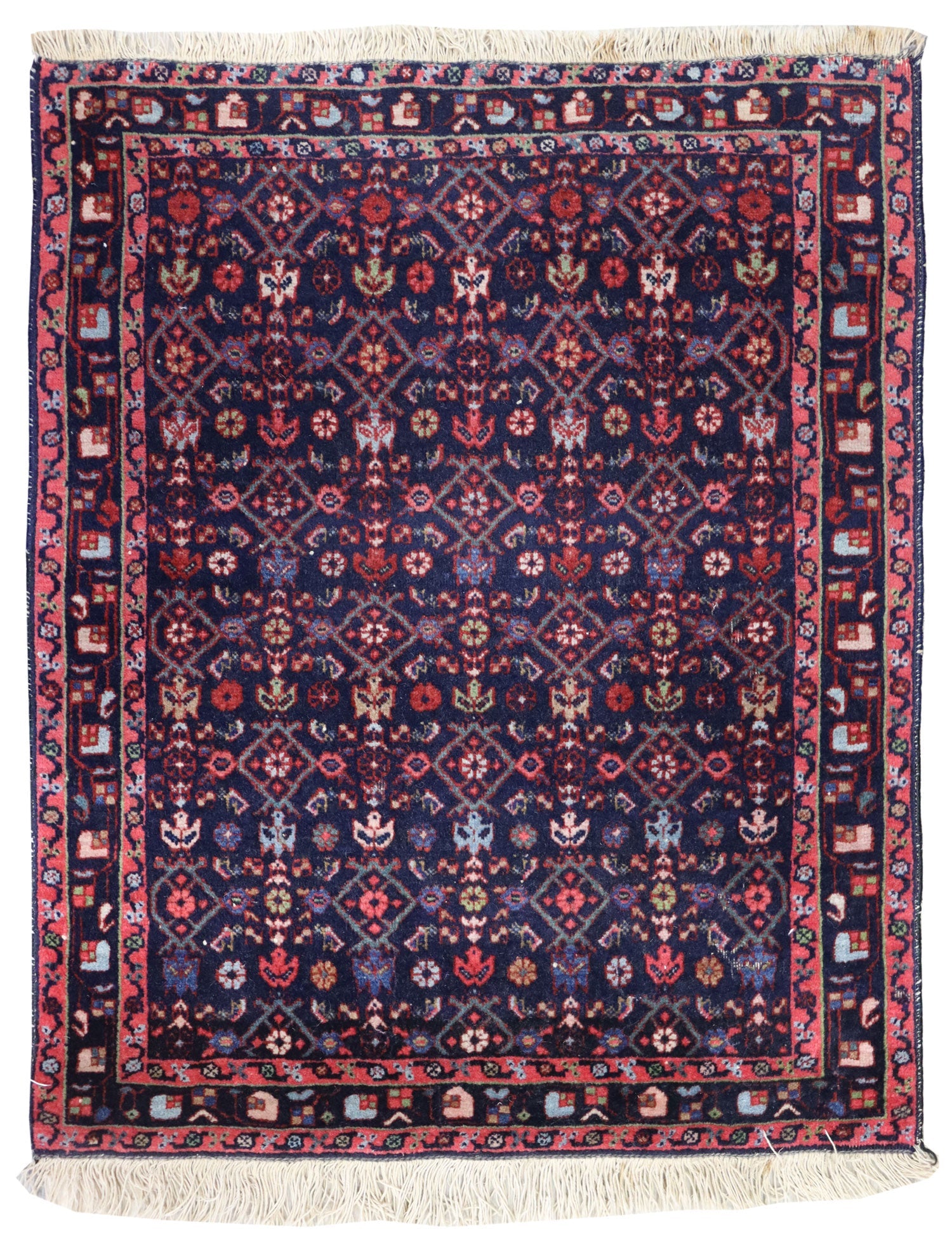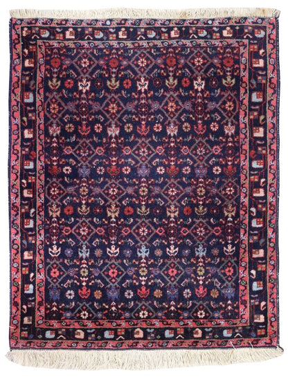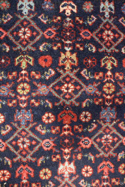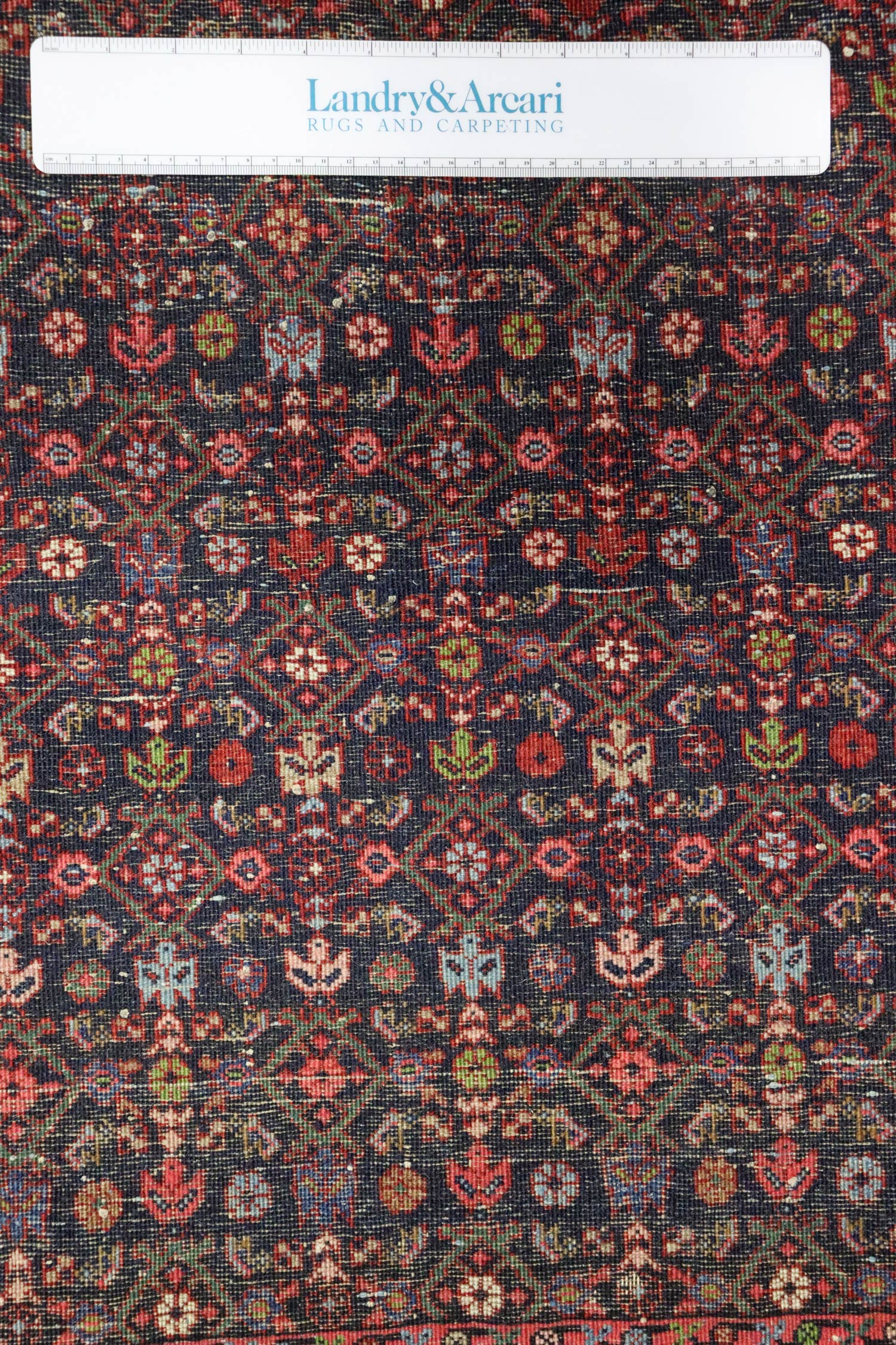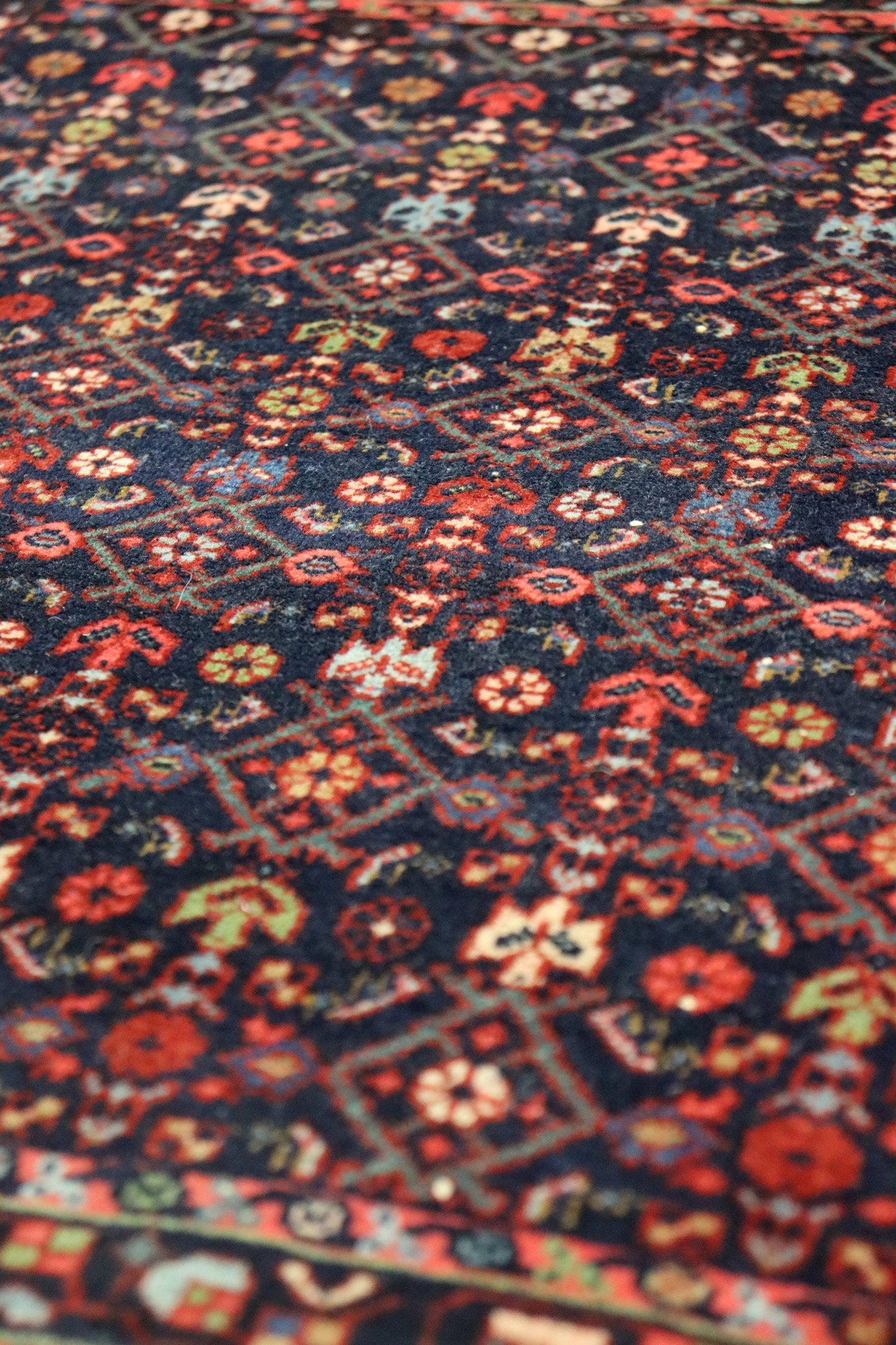 This Persian Bijar tribal rug, crafted circa 1925, showcases the intricate artistry and durable construction the Bijar weaving tradition is known for. With a navy background and a rich red border, this antique rug features a predominant blue palette, accented with hues of pink, light blue, green, and beige. It is woven using wool on a cotton foundation, characteristic of the sturdy and resilient textiles produced in the mountain villages of Western Persia's Kurdistan region.