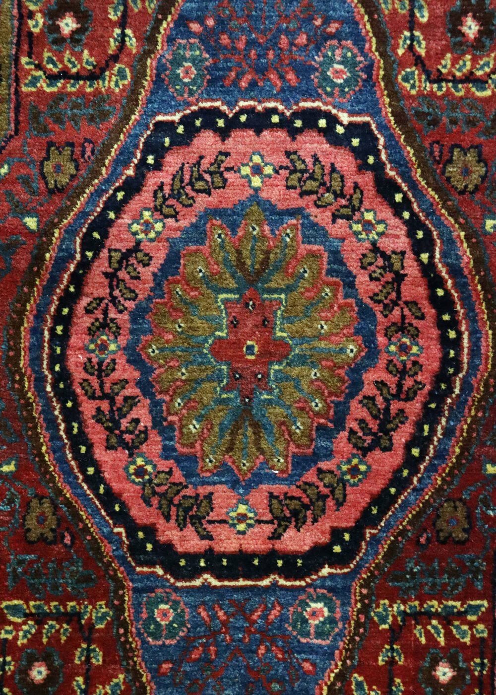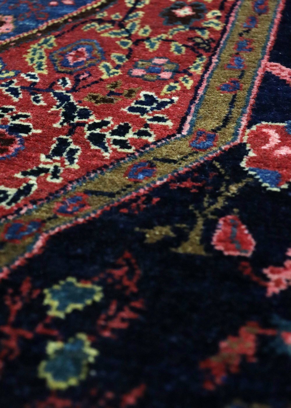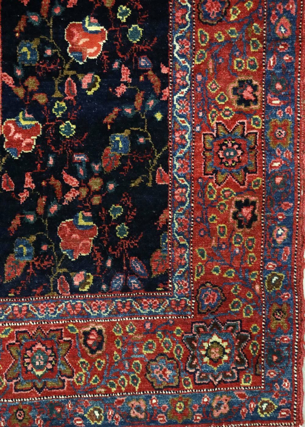 The rug's symmetrical design reinforces its visual balance, with the central medallion acting as a focal point around which the rest of the pattern is organized. This symmetry along both the vertical and horizontal axes is a hallmark of Bijar rug designs, showcasing the craftsmen's dedication to precision and balanced artistry.