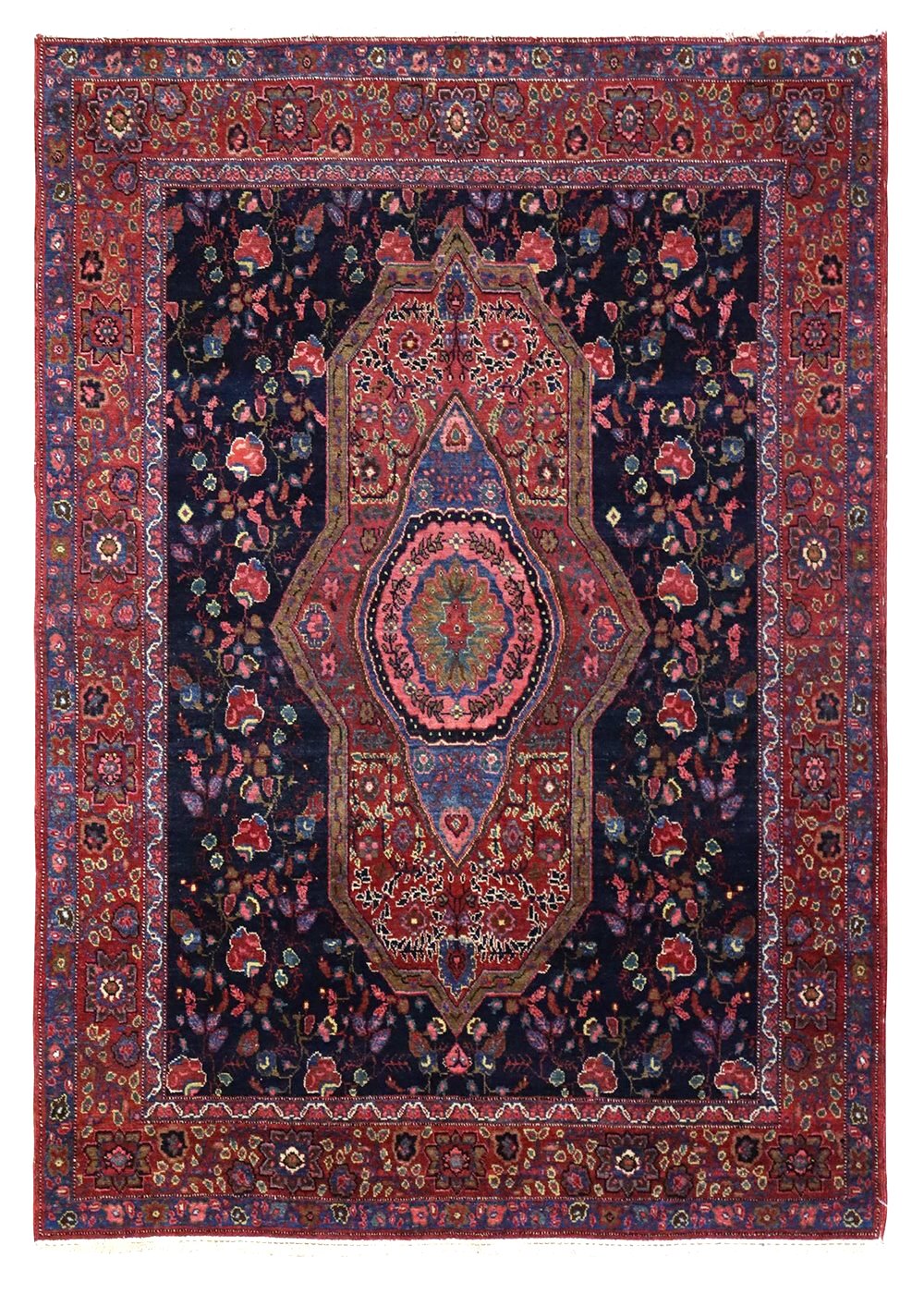 Surrounding the central medallion is a dense array of floral and foliage patterns, vividly rendered in blues, reds, and greens. These motifs contrast sharply against the dark navy background, allowing the colors to stand out and draw the eye across the entirety of the rug. The dominant hues are rich blues and shades of pink, with lighter accents of pale blue, green, and yellow strategically used to enhance certain elements of the design.