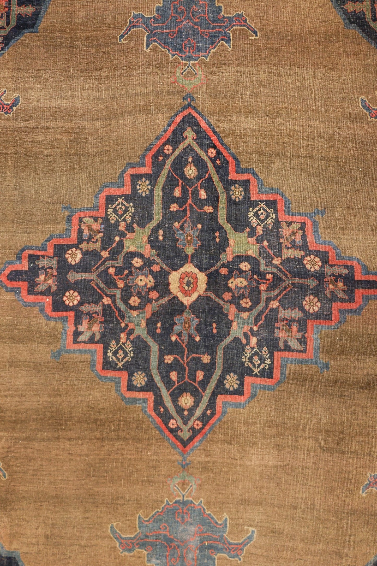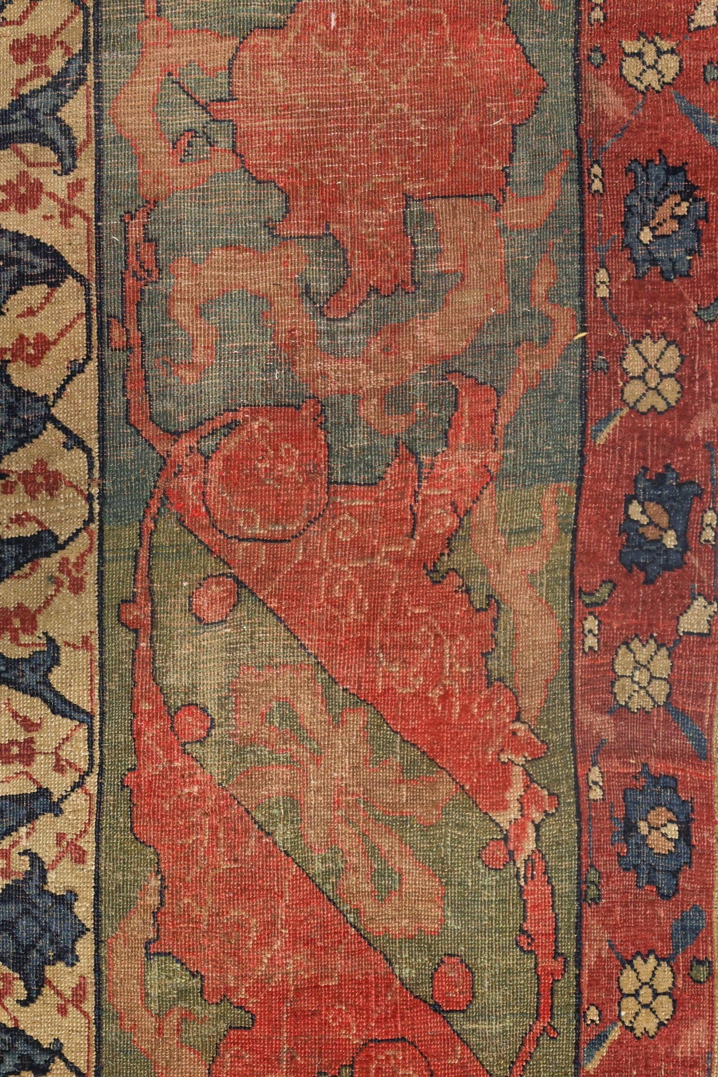 The border of the rug is robust and symmetrical, featuring elaborate floral patterns along with mythical creatures, primarily in shades of red and green. Inside the main border, a slightly narrower border contains a repetitive floral motif in red, blue, and beige. The overall design is highly symmetrical, especially in the medallion and corner pieces, which mirror each other both horizontally and vertically.