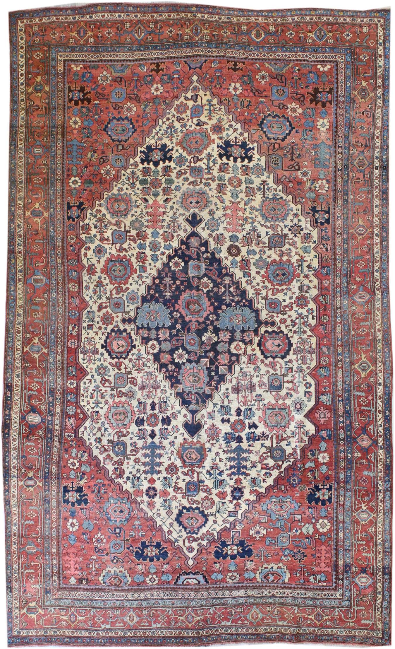 The rug's design prominently features a rich tribal motif set against an ivory background. The central medallion is a striking dark blue, elaborately detailed with lighter blue and red accents. It serves as the focal point, drawing attention to the intricate artistry skillfully woven into the fabric. Surrounding the medallion, the design incorporates a complex array of geometric shapes and floral motifs, traditional elements common to Bijar rugs.