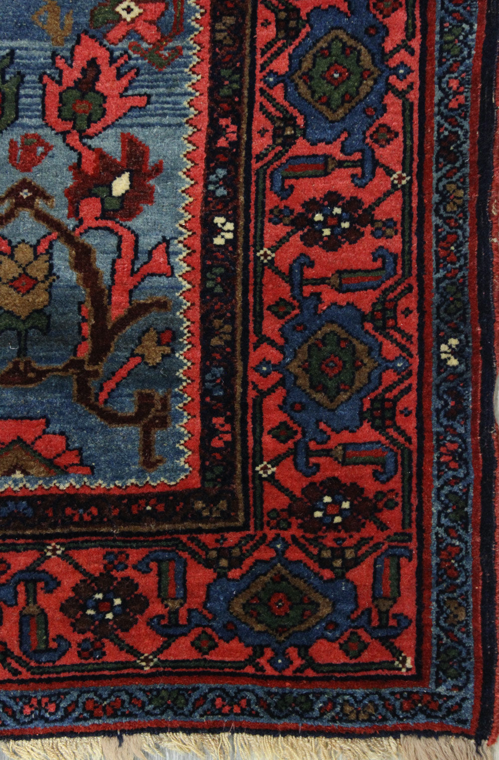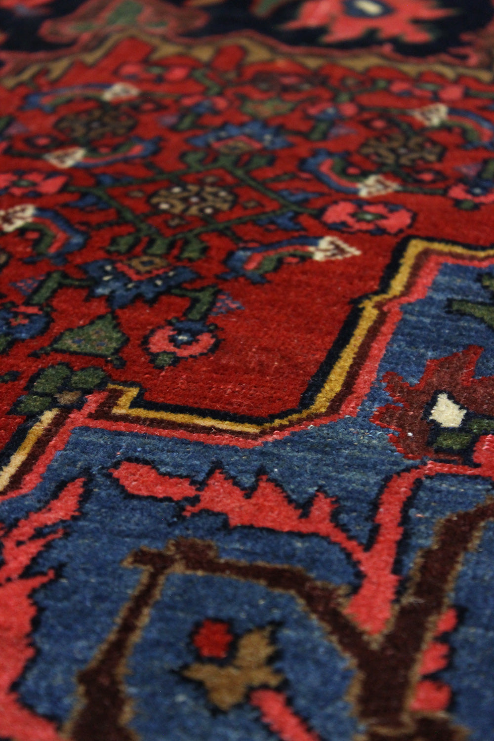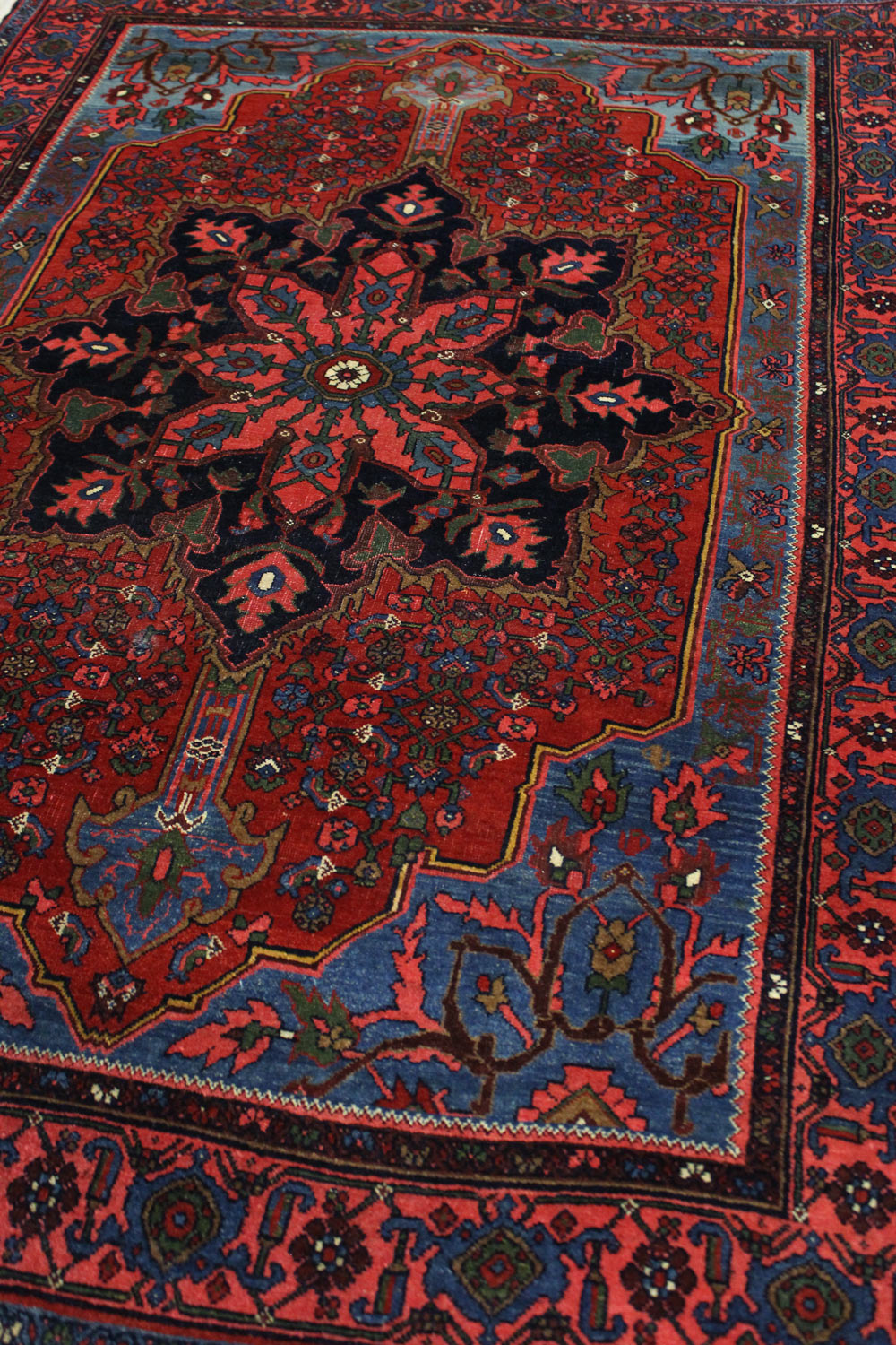 Originating from the mountain villages of Western Persia's Kurdistan region circa 1915, this antique Persian rug exemplifies the Bijar design known for its tribal style and durable construction. The rug’s background is rendered in a rich cherry hue, while the border features a contrasting deep blue. The primary color throughout the rug is a vibrant red, consistent with traditional Bijar palettes, which frequently incorporate striking contrasts.