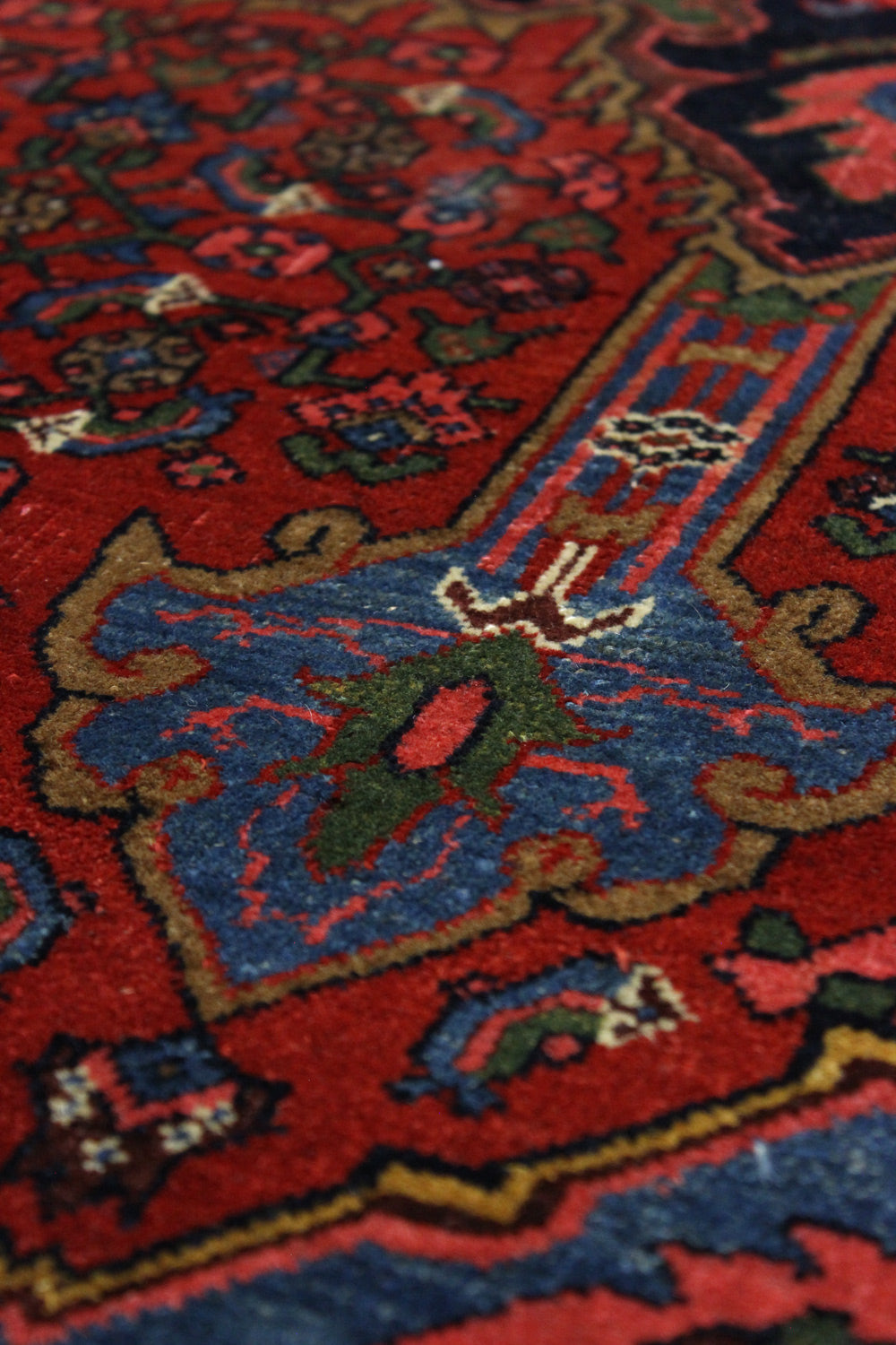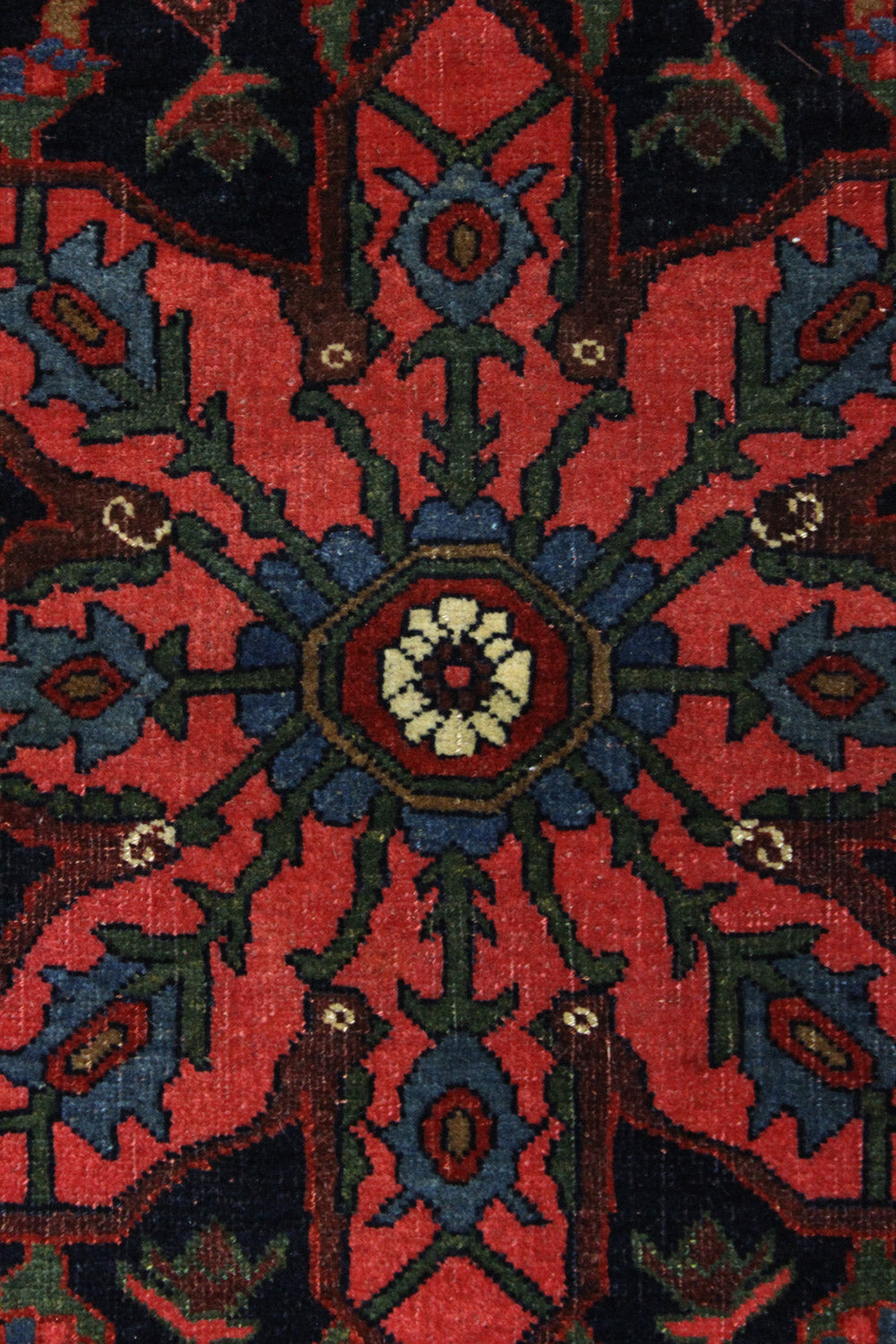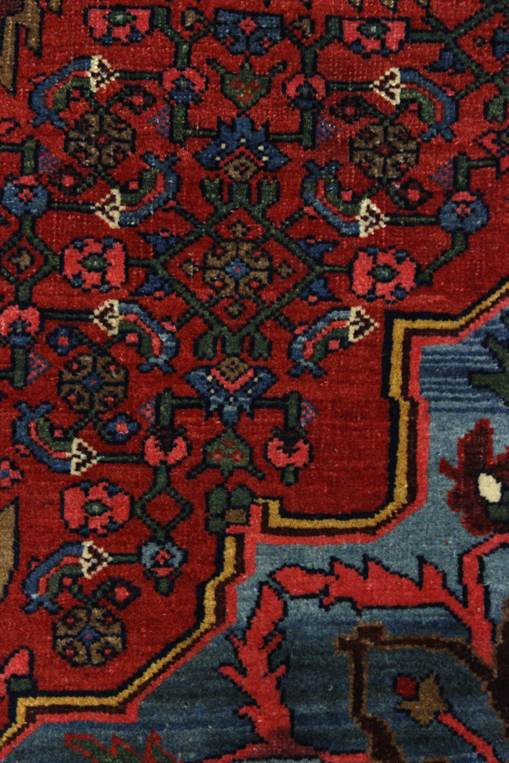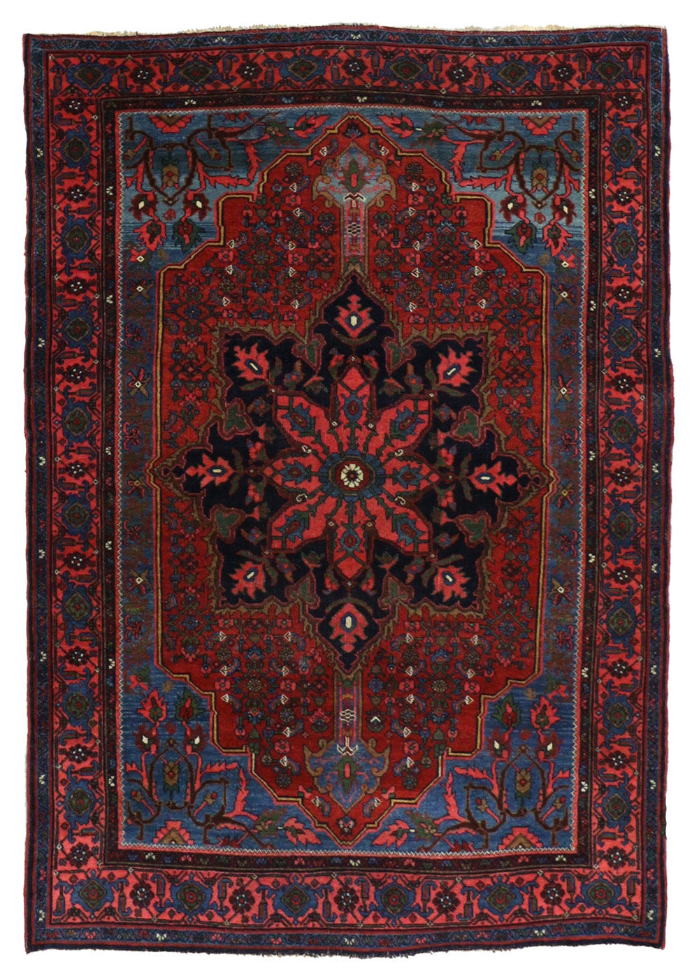 Originating from the mountain villages of Western Persia's Kurdistan region circa 1915, this antique Persian rug exemplifies the Bijar design known for its tribal style and durable construction. The rug’s background is rendered in a rich cherry hue, while the border features a contrasting deep blue. The primary color throughout the rug is a vibrant red, consistent with traditional Bijar palettes, which frequently incorporate striking contrasts.