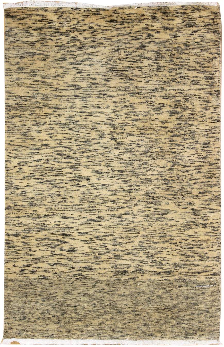 Introducing the "Soft Melody" collection, a contemporary rug from India. This exquisite rug showcases a brindle design with a grey background and a gold border, creating a striking contrast. Its main color is grey, adding a soothing element to any space.