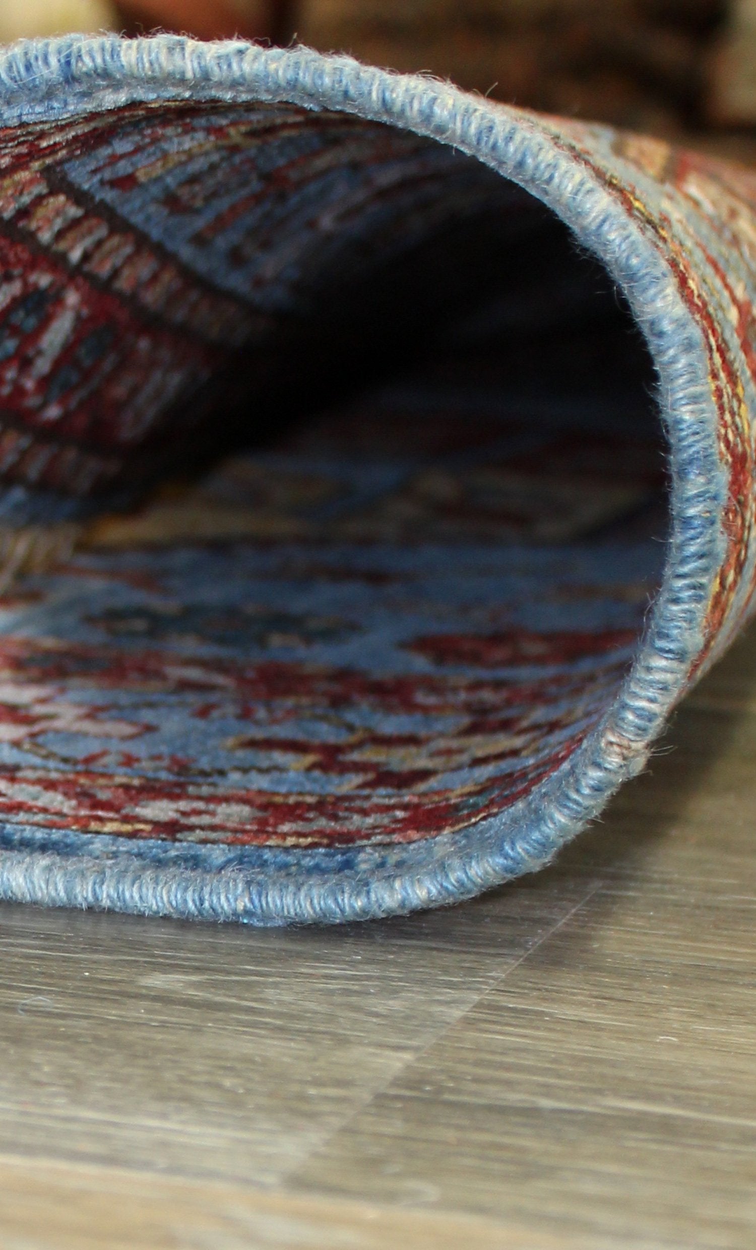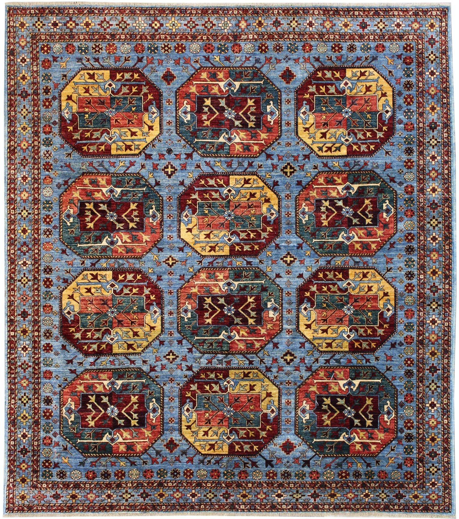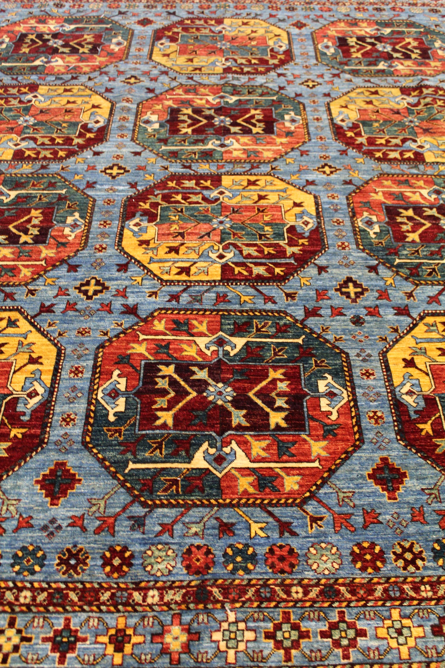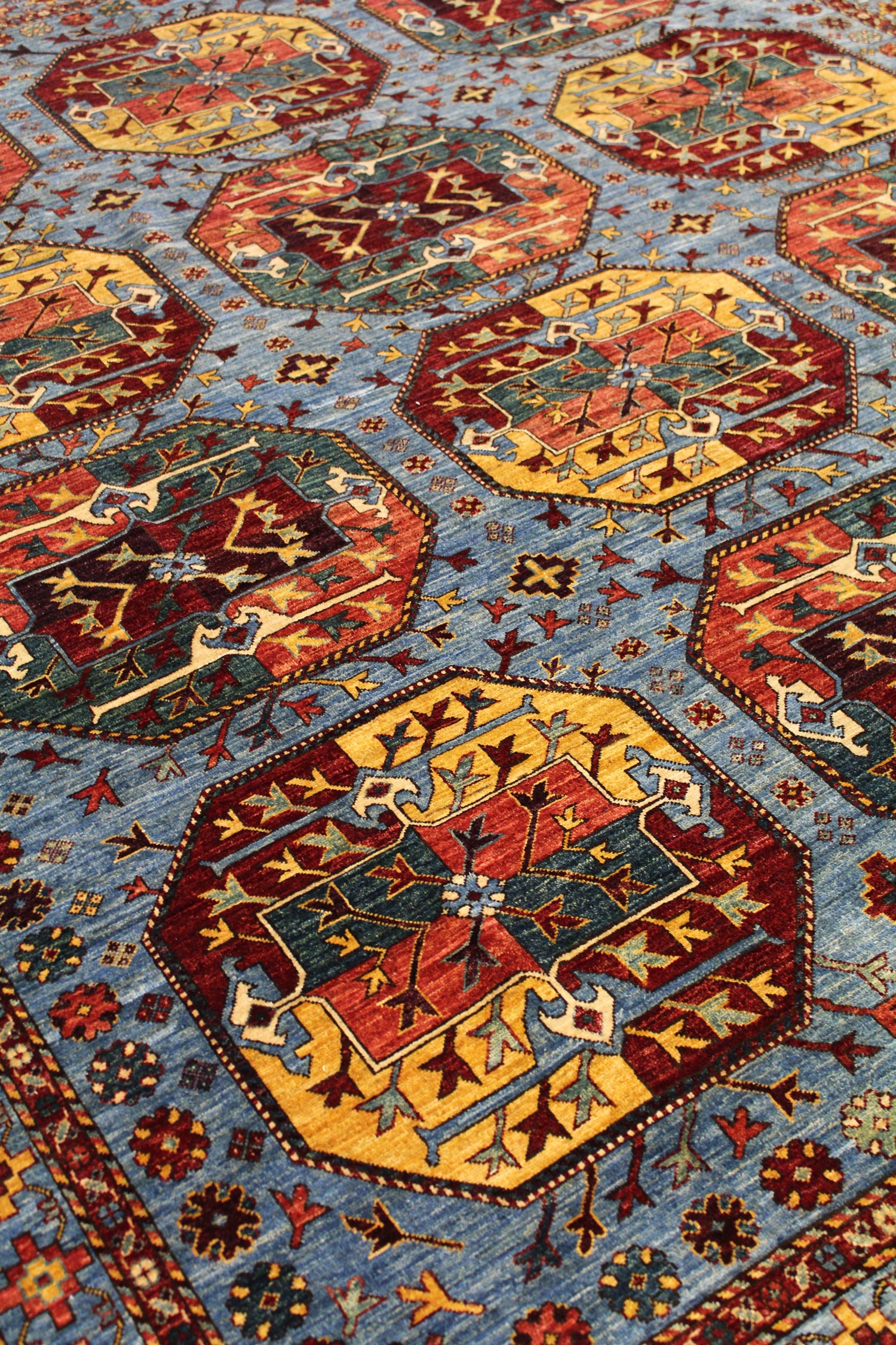 Introducing our exquisite Afghani rug with a captivating design inspired by the tribal Ersari style. Handcrafted with precision and care, this rug boasts a mesmerizing combination of a light blue background and a rust-colored border, creating a harmonious contrast that will elevate the ambiance of any space.
