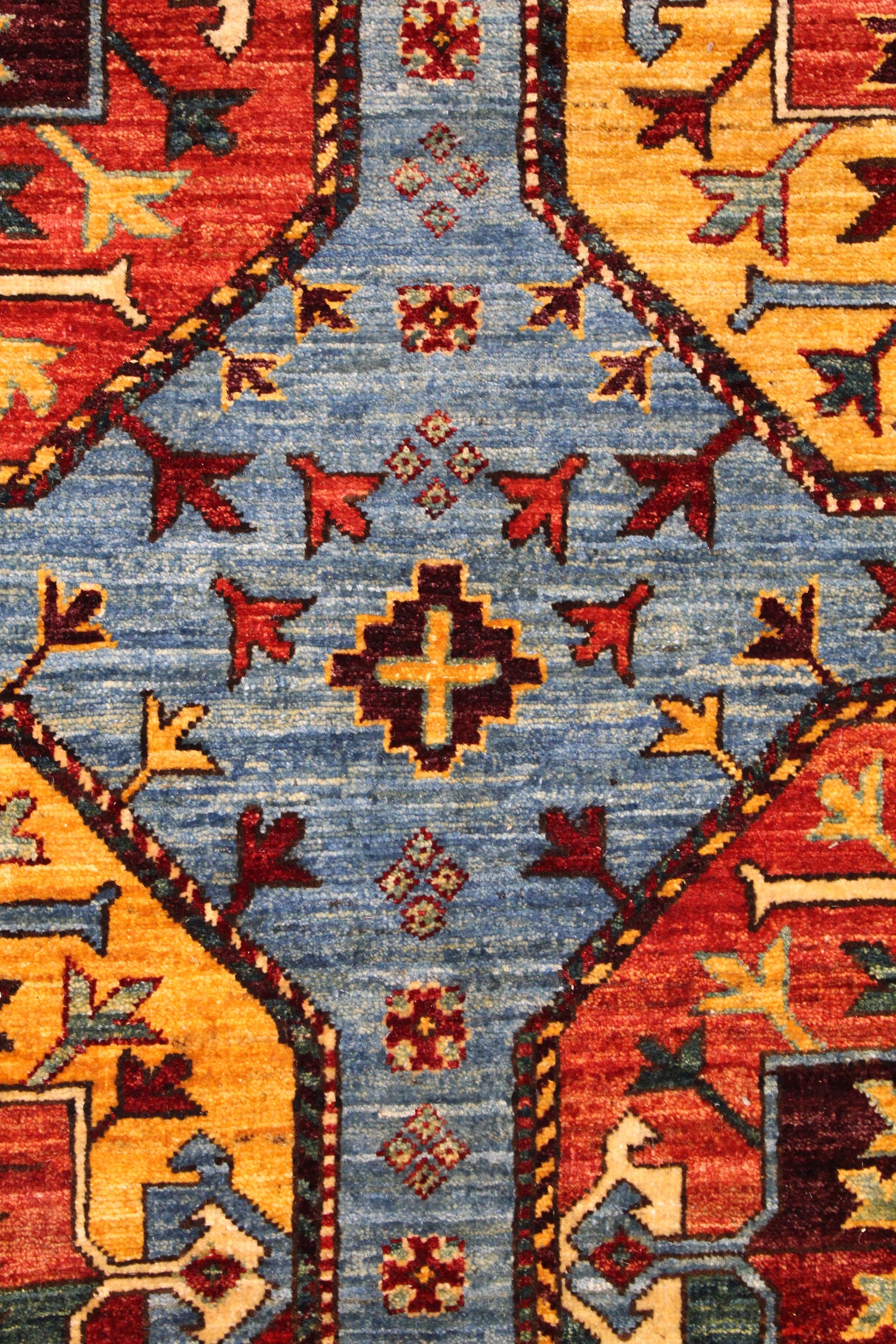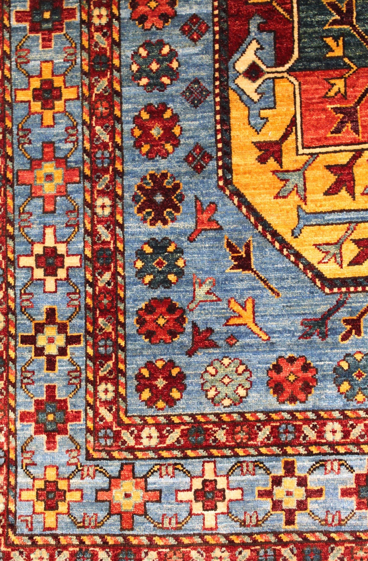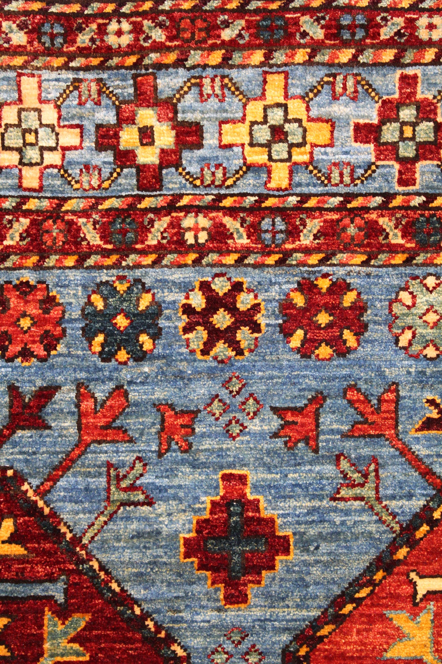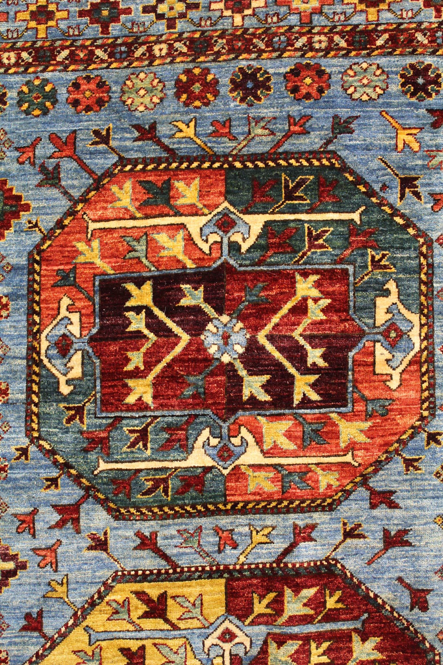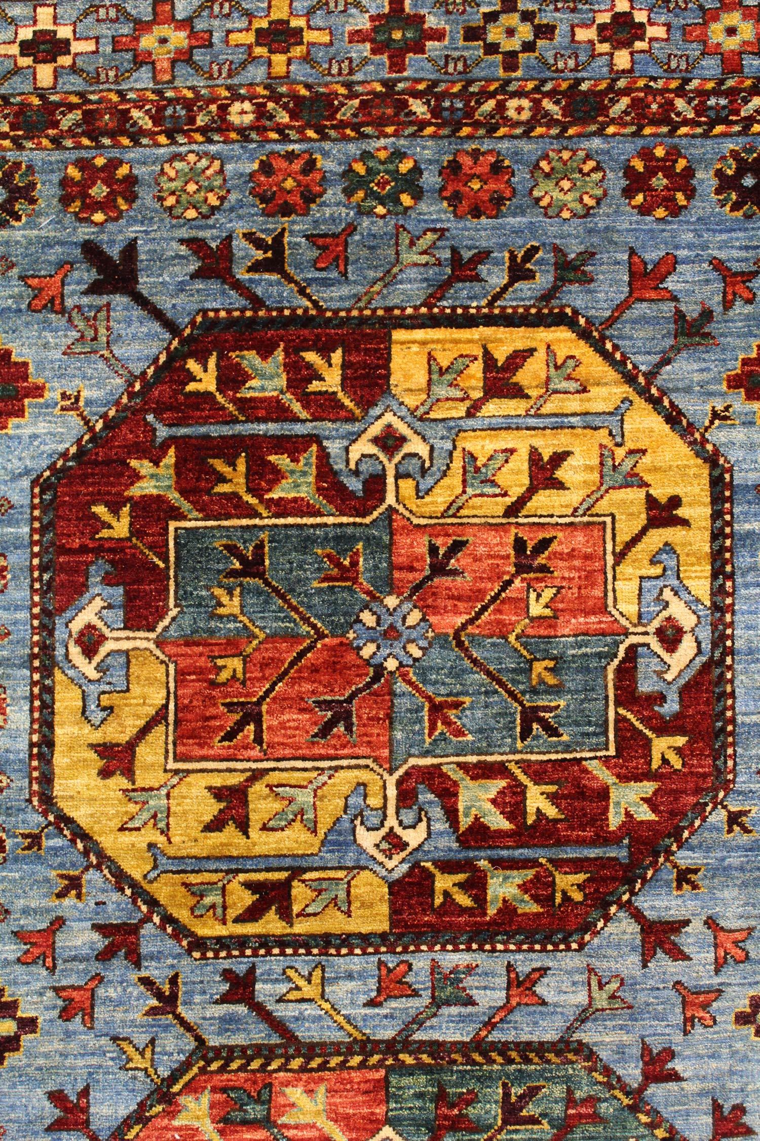 Introducing our exquisite Afghani rug with a captivating design inspired by the tribal Ersari style. Handcrafted with precision and care, this rug boasts a mesmerizing combination of a light blue background and a rust-colored border, creating a harmonious contrast that will elevate the ambiance of any space.