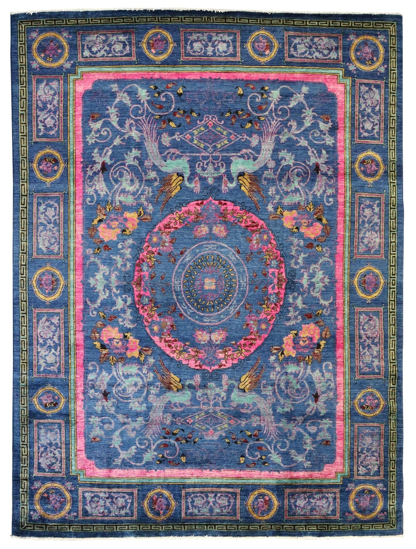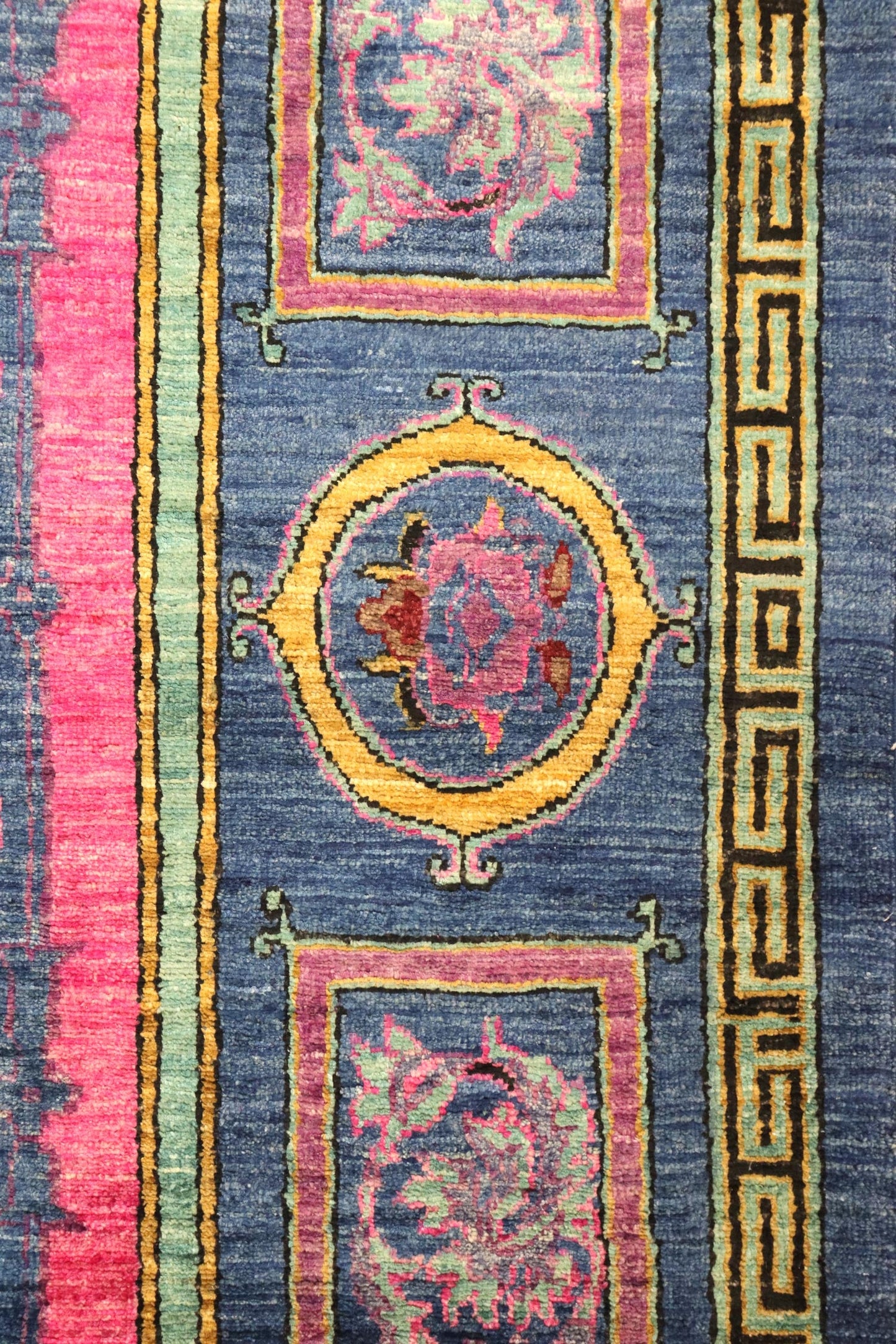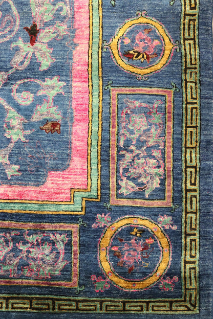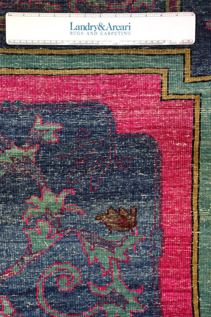 Introducing this exquisite rug from Afghanistan, this piece showcases a stunning transitional design that combines elements of European style. The rug features a denim background, beautifully complemented by a vibrant fuchsia border. Its elegant and timeless design is sure to add a touch of sophistication to any space.
