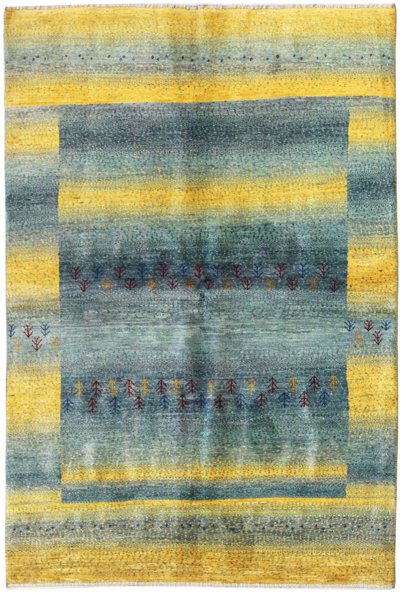 Get ready to fall in love with our Gabbeh Handwoven Tribal Rug (54634)! This tribal Gabbeh piece is blue with yellow accents. The Gabbeh design and 4' 8" X 6' 9" size make this new handwoven Persian rug a gorgeous addition to any space. Its wool pile surface on a wool foundation means this rug is incredibly durable — you’ll be able to cherish it for years to come. Get your Gabbeh Handwoven Tribal Rug today!