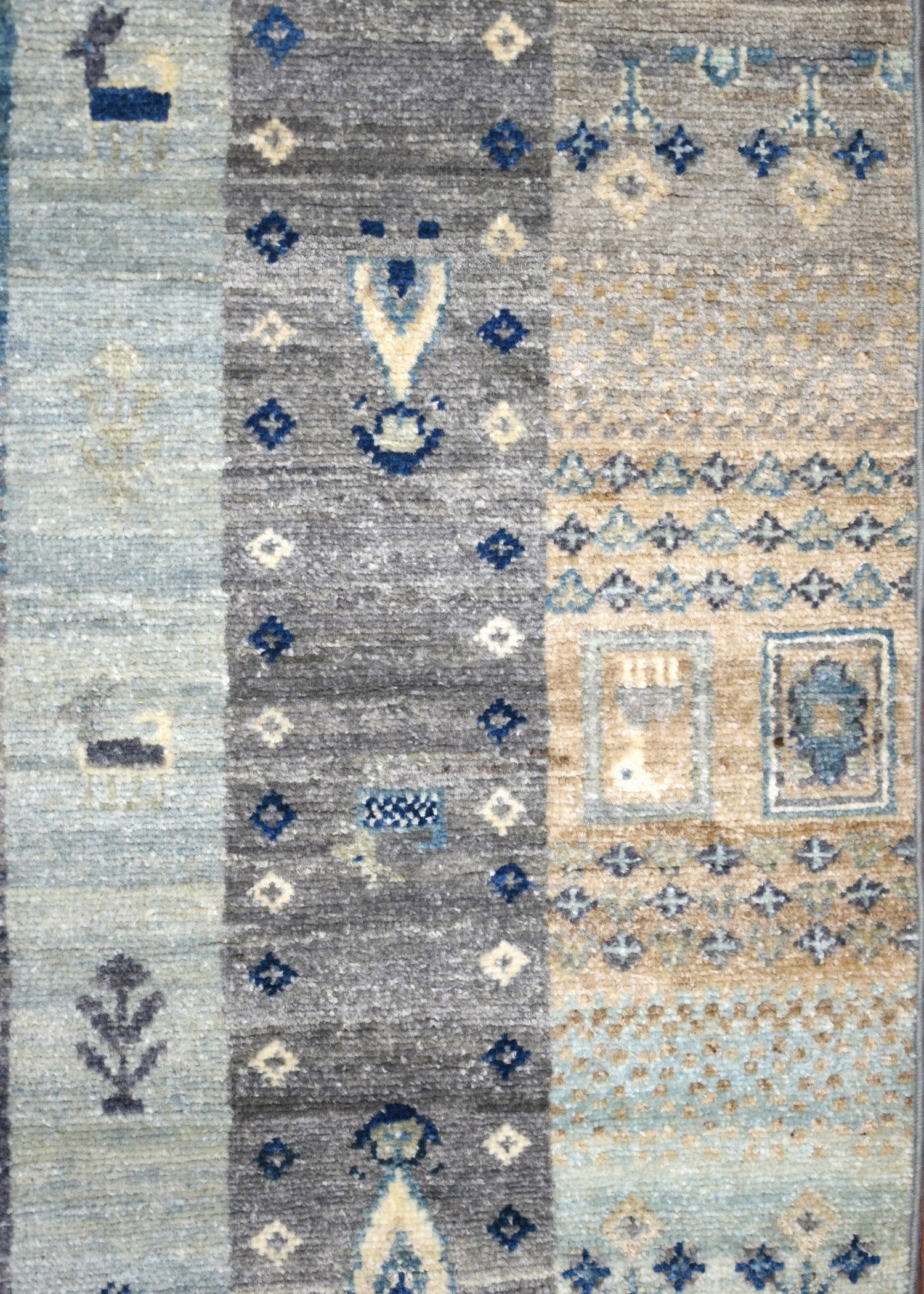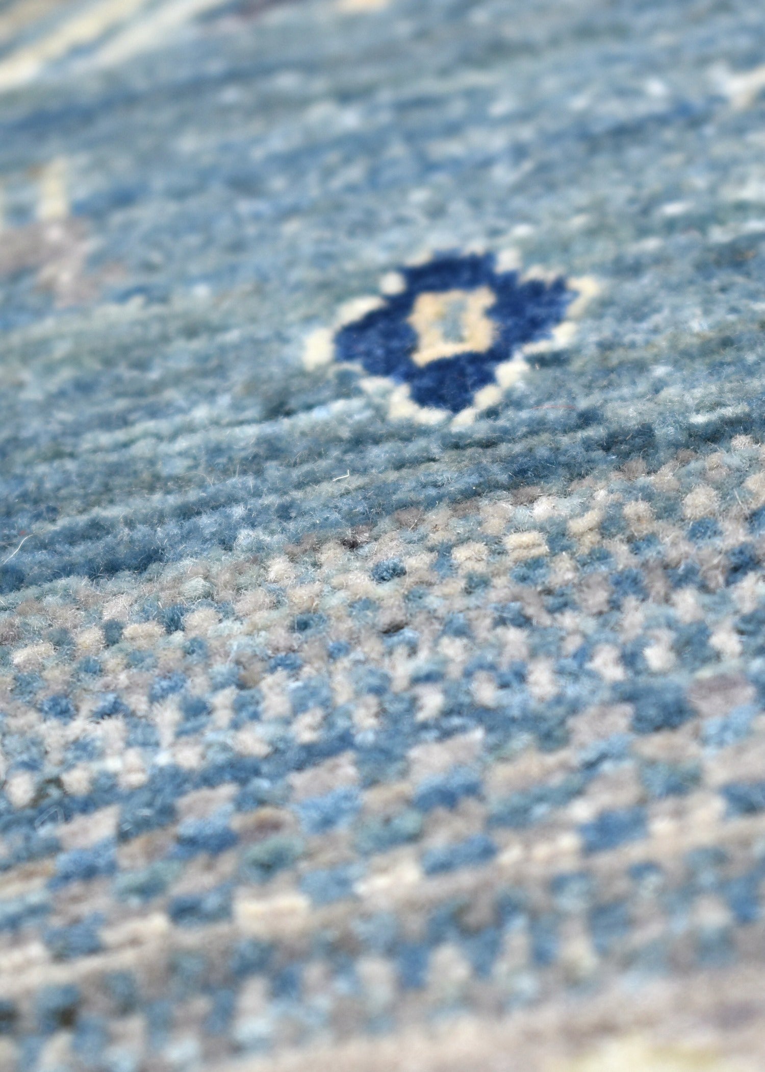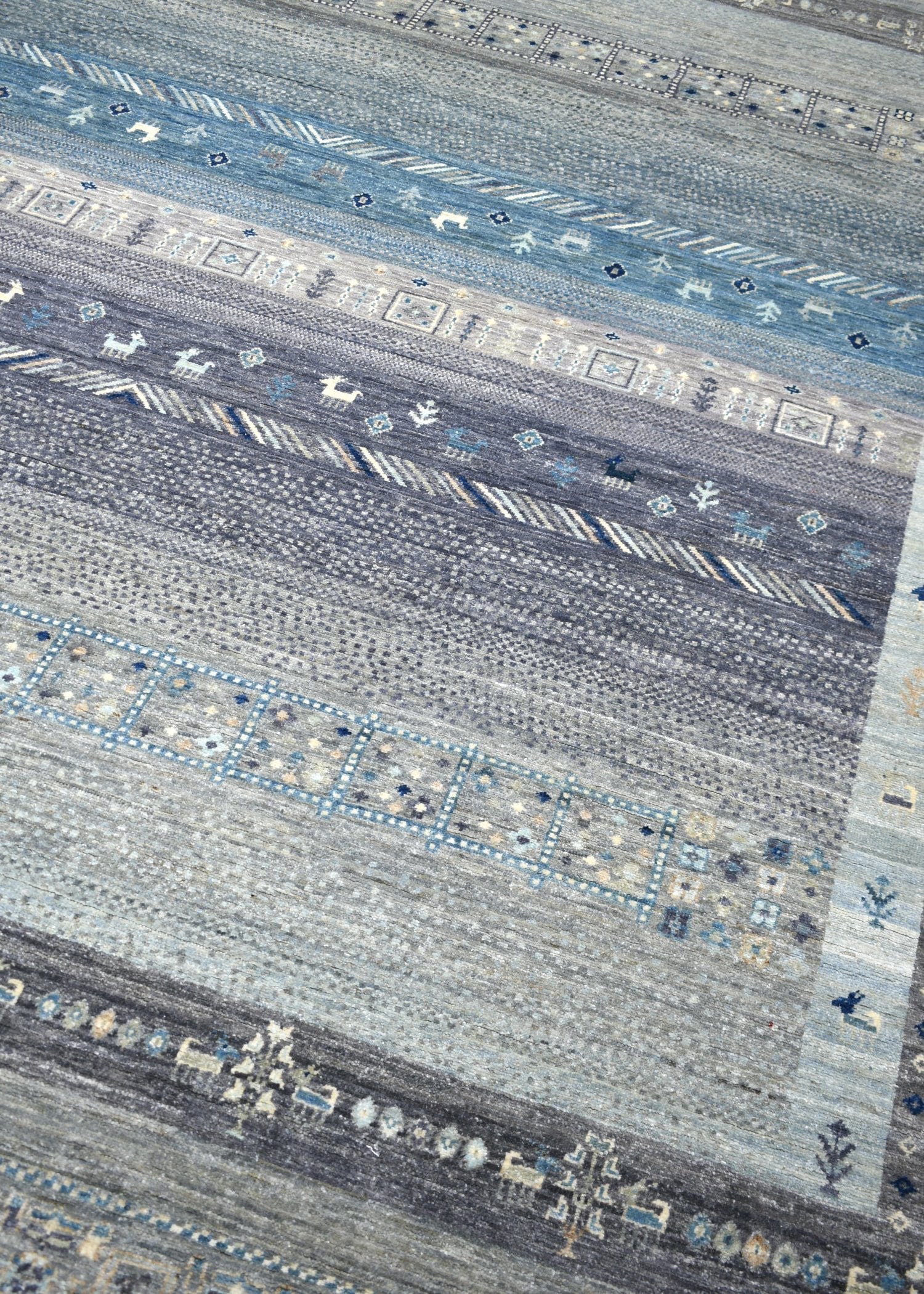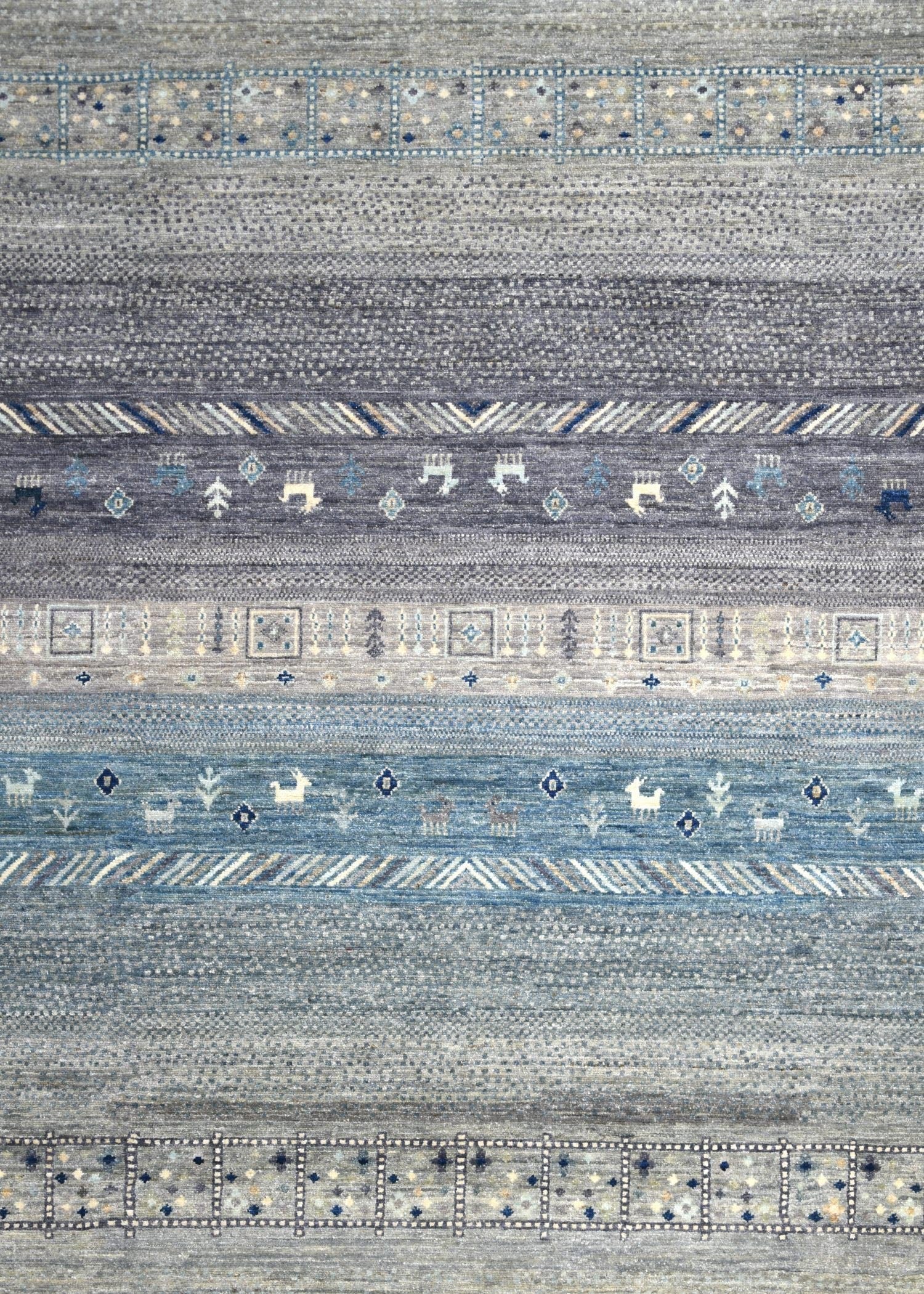 Show off your exquisite taste with our beautiful Gabbeh Handwoven Tribal Rug (J64170). It’s a prime example of a tribal Gabbeh done right and will add a unique, polished look to your space. Crafted mainly in blue and complemented with aqua and slate, the Gabbeh design really pops. The wool pile surface is resilient yet comfortable and the cotton foundation provides a sturdy base. This 8' 3" X 9' 9" handwoven rug is of new construction and Afghani origin. All in all, you’re going to love this piece and it’s going to be the perfect addition to your home. Make it happen today — with your own Gabbeh Handwoven Tribal Rug.