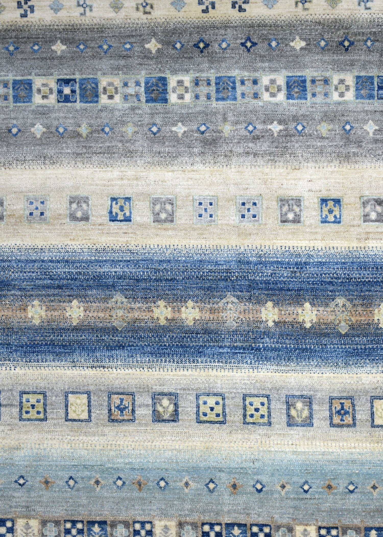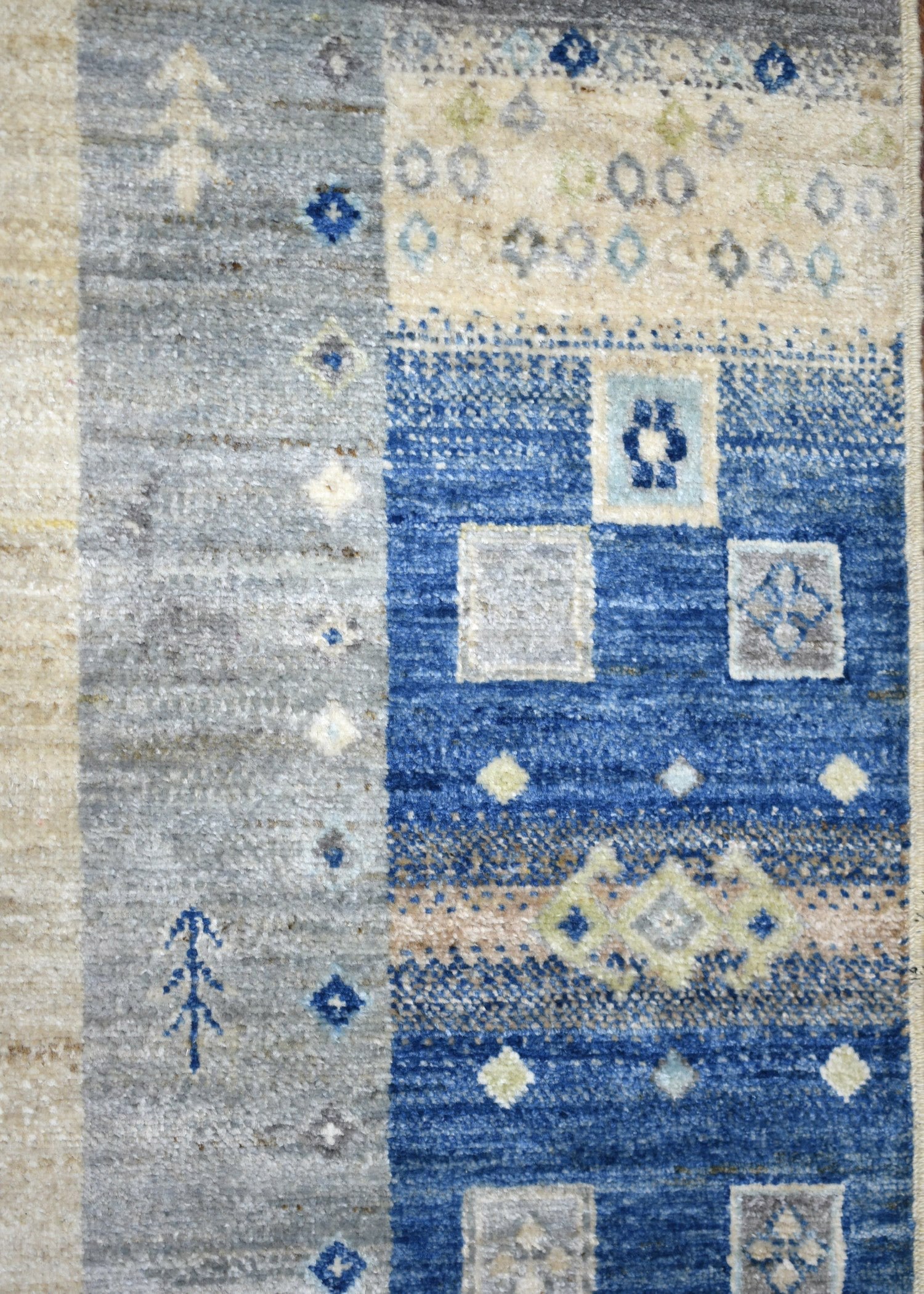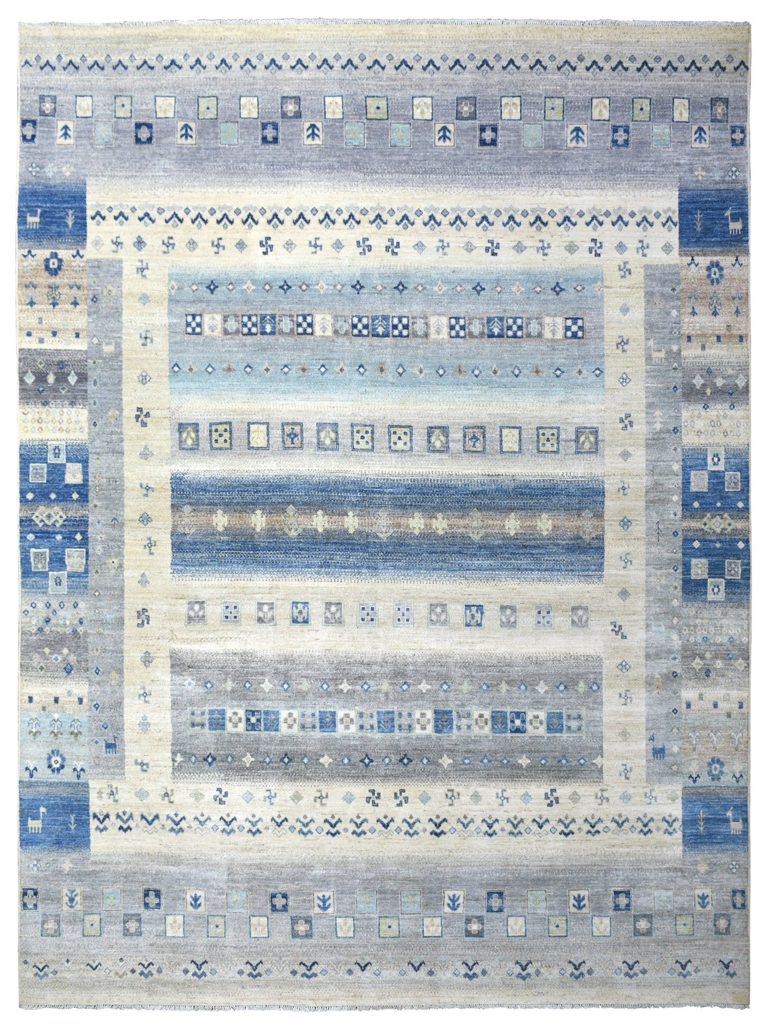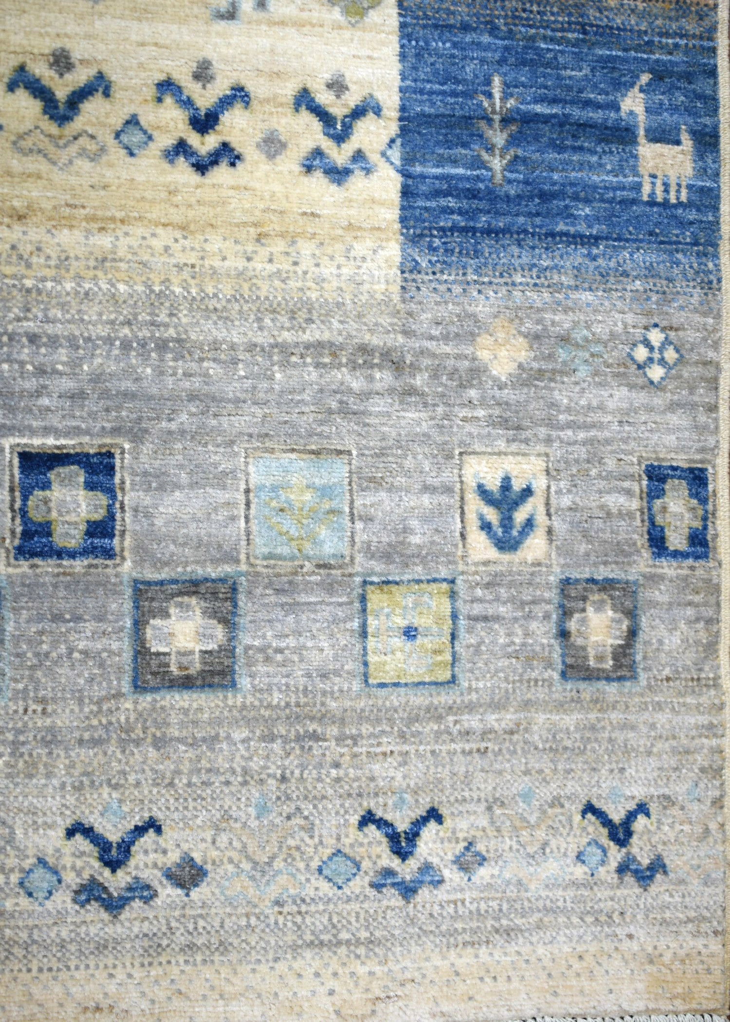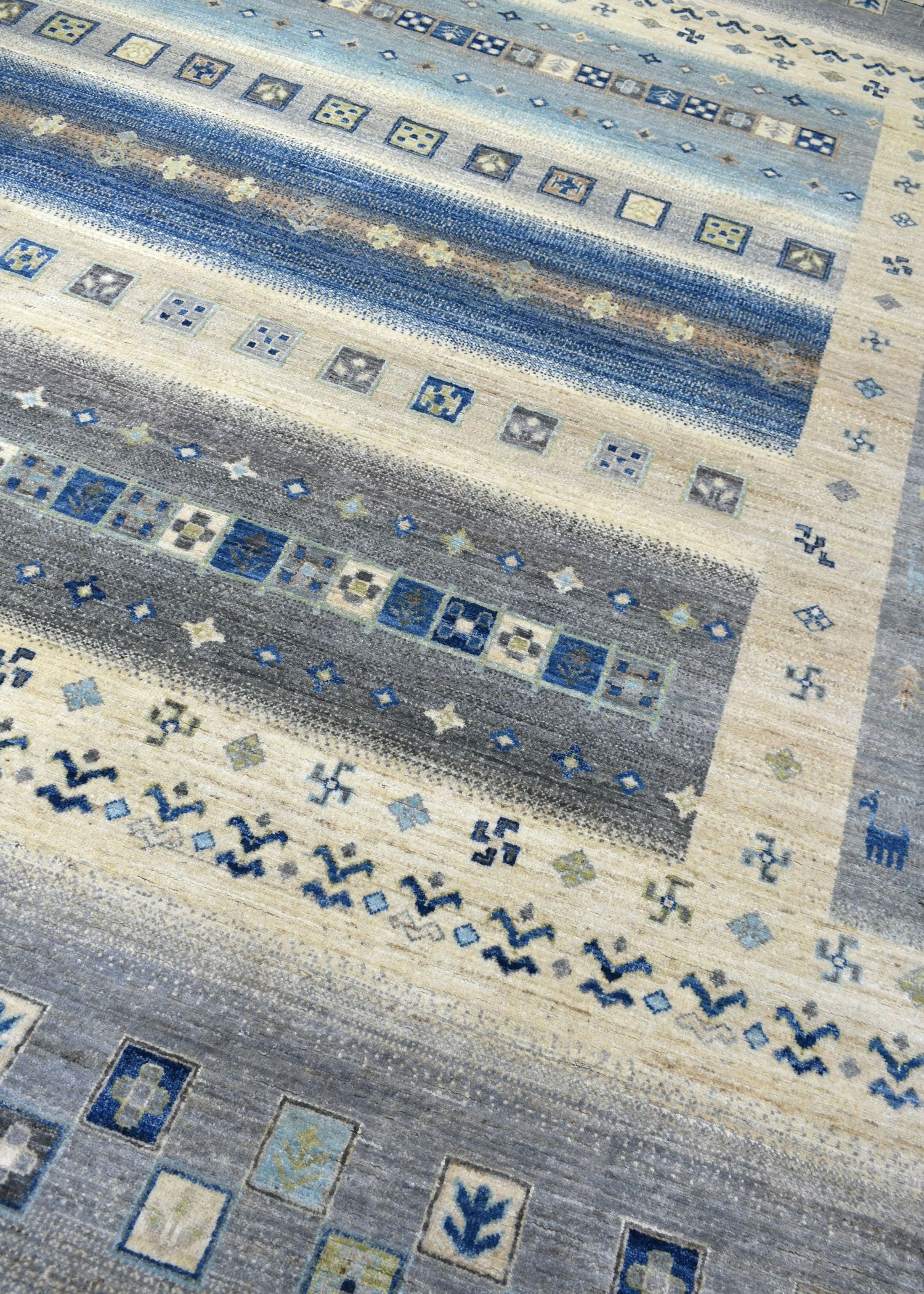 Show off your exquisite taste with our beautiful Gabbeh Handwoven Tribal Rug (J64204). It’s a prime example of a tribal Gabbeh done right and will add a unique, polished look to your space. Crafted mainly in grey and complemented with silver and medium blue, the Gabbeh design really pops. The wool pile surface is resilient yet comfortable and the cotton foundation provides a sturdy base. This 8' 10" X 11' 10" handwoven rug is of new construction and Afghani origin. All in all, you’re going to love this piece and it’s going to be the perfect addition to your home. Make it happen today — with your own Gabbeh Handwoven Tribal Rug.