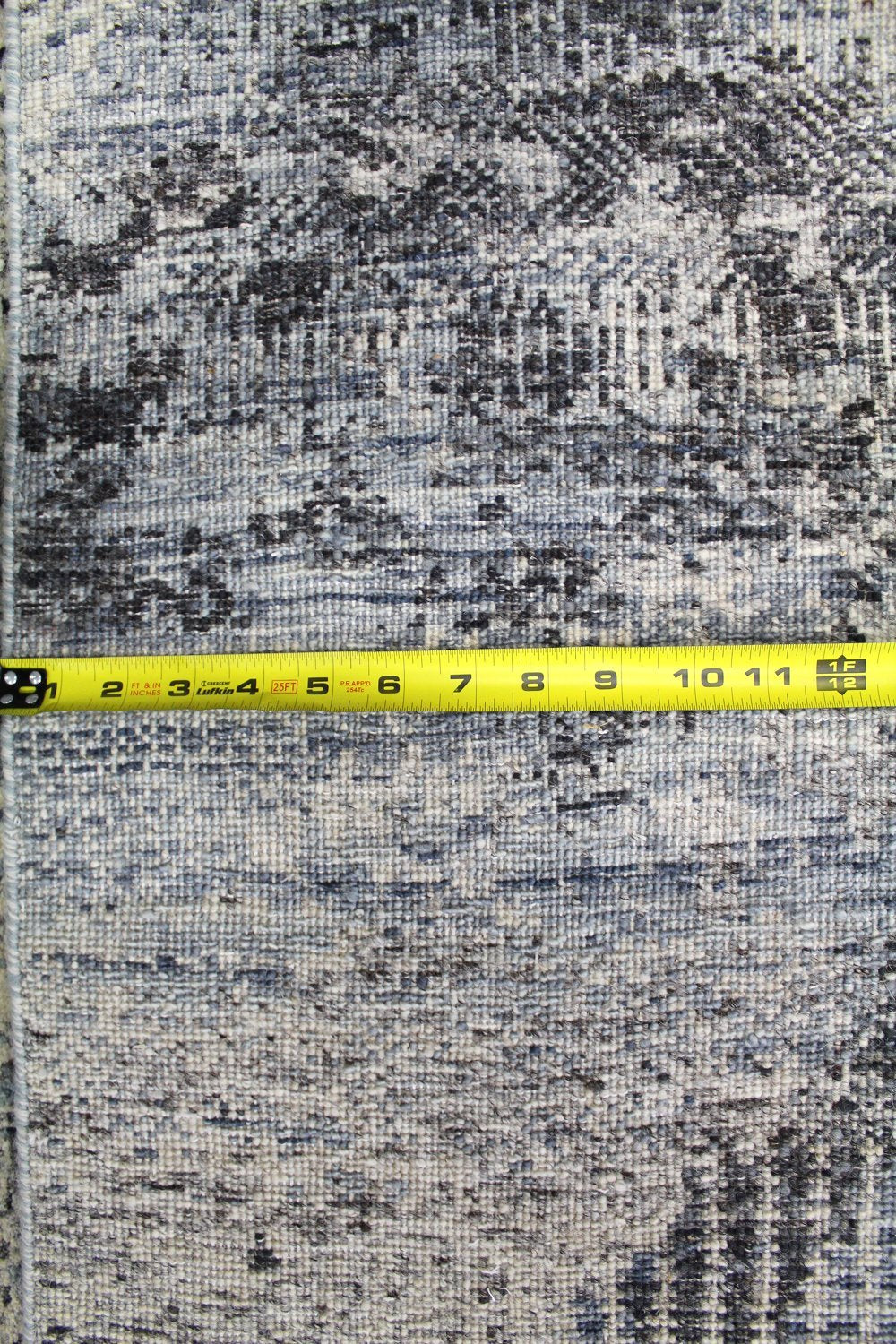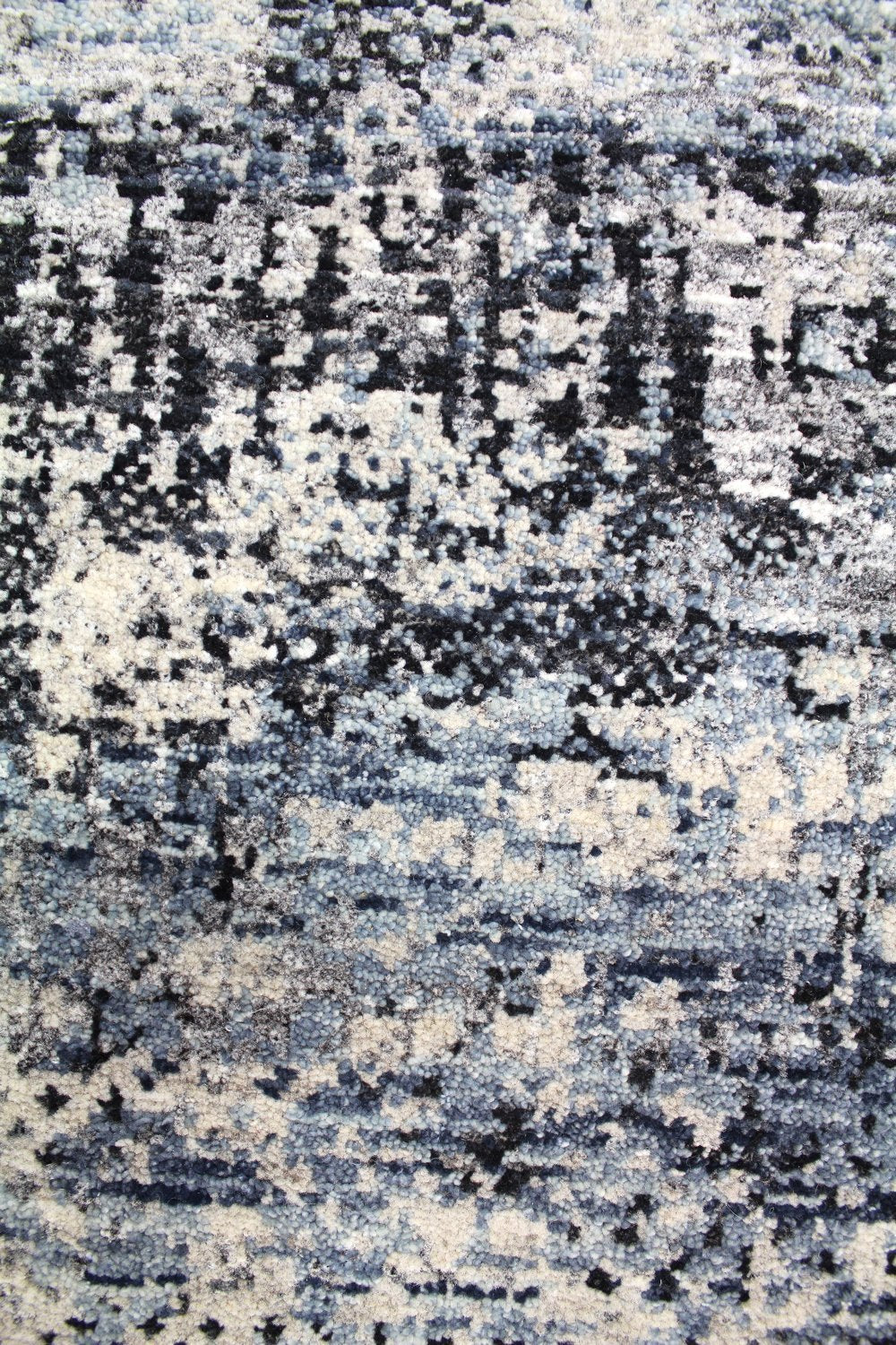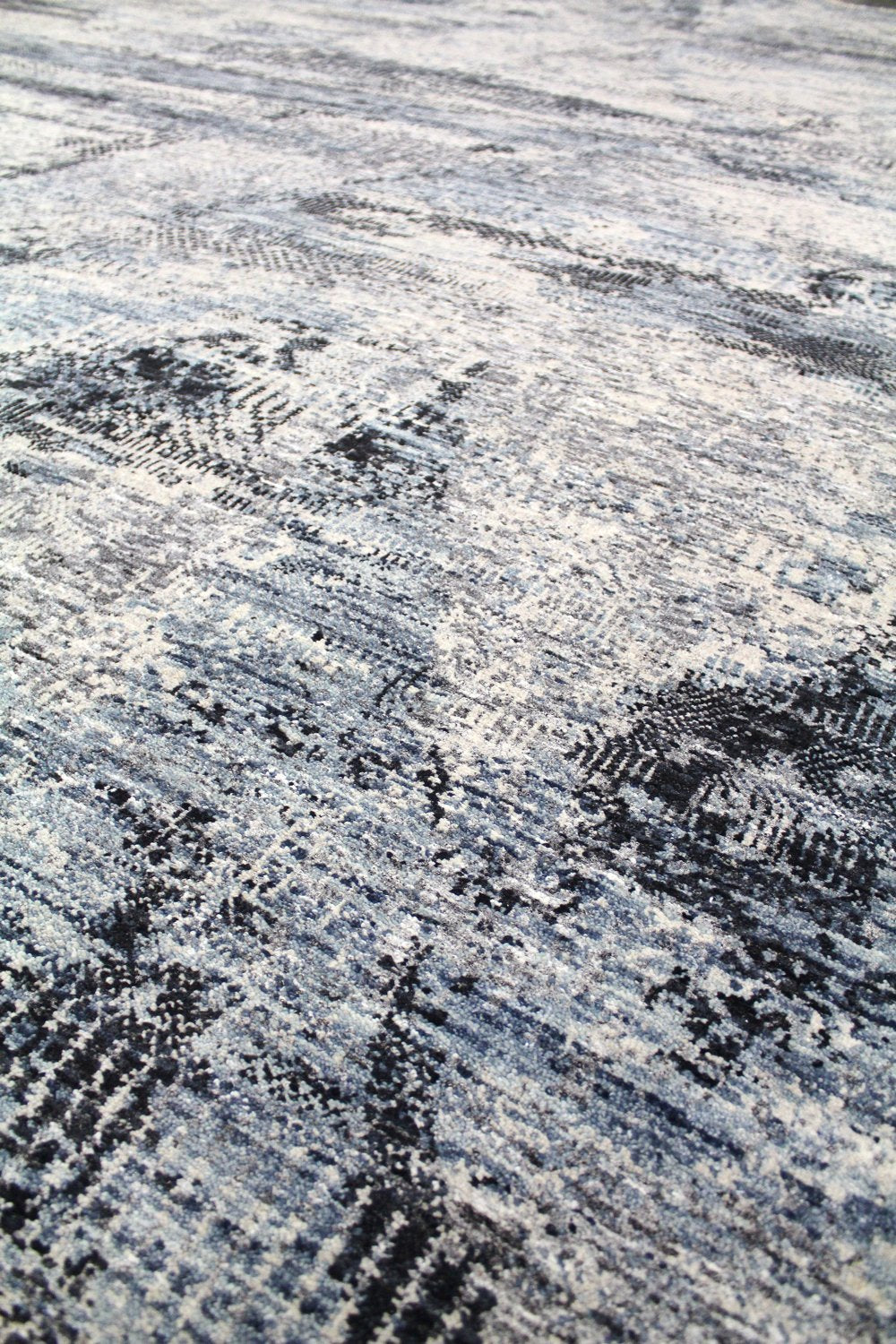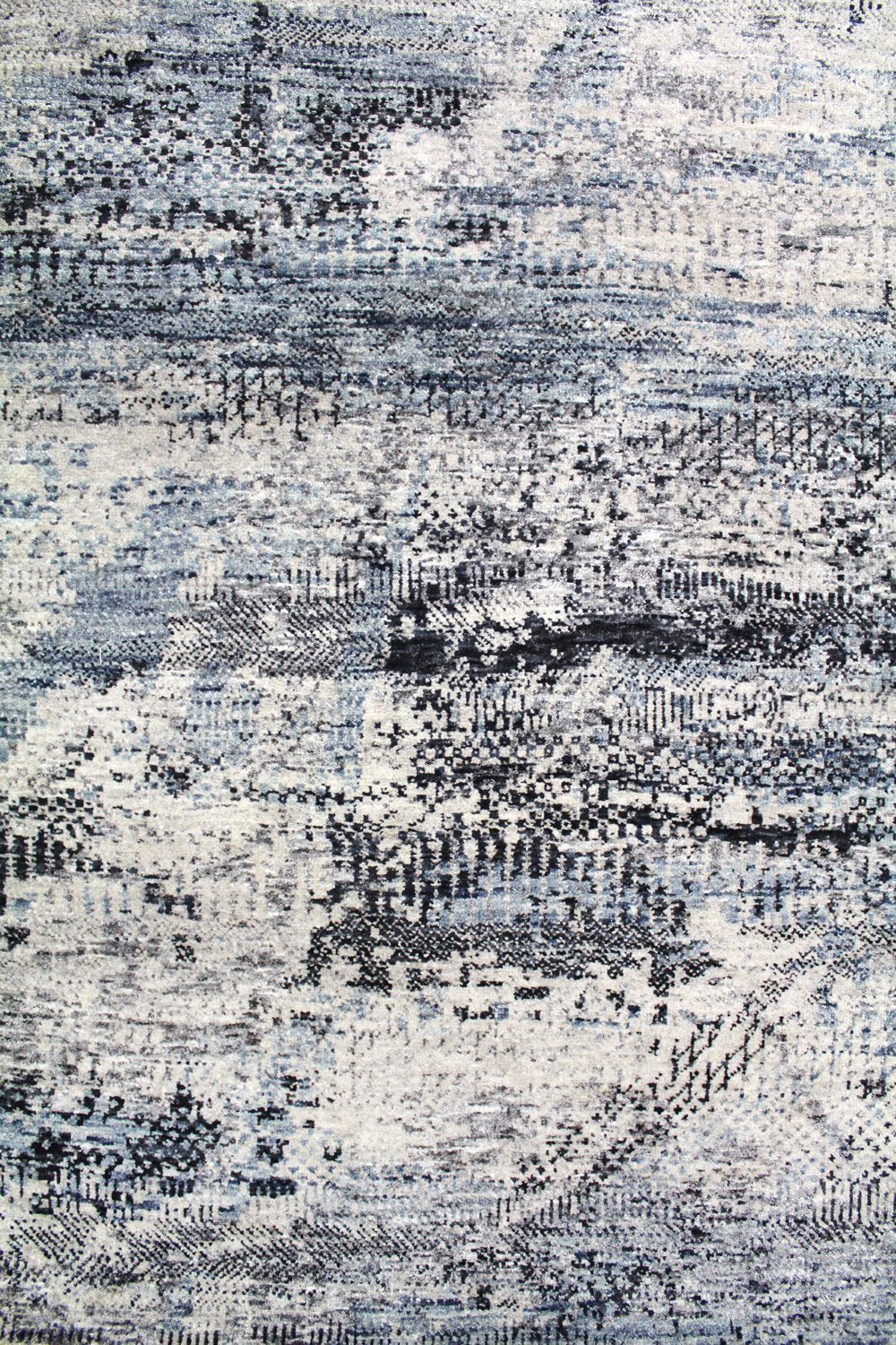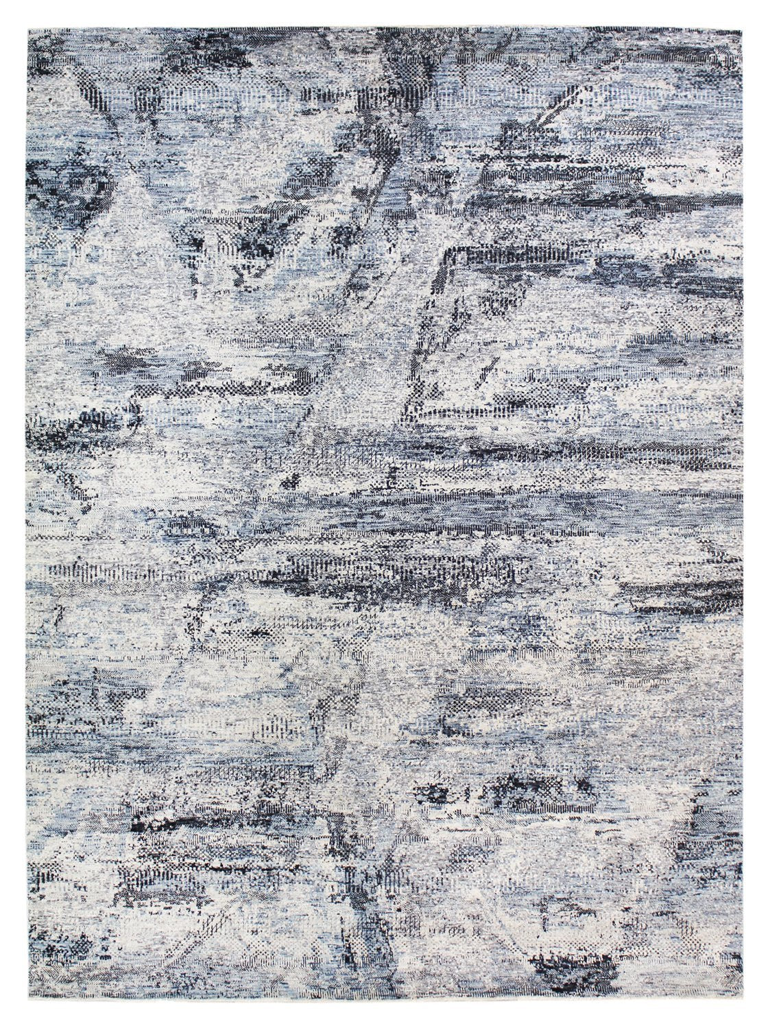This is an Indian rug with a contemporary galaxy design. The predominant color is grey laid on a silver background. The rug is new and is crafted with wool on a cotton base. It measures 9 feet by 12.2 feet.