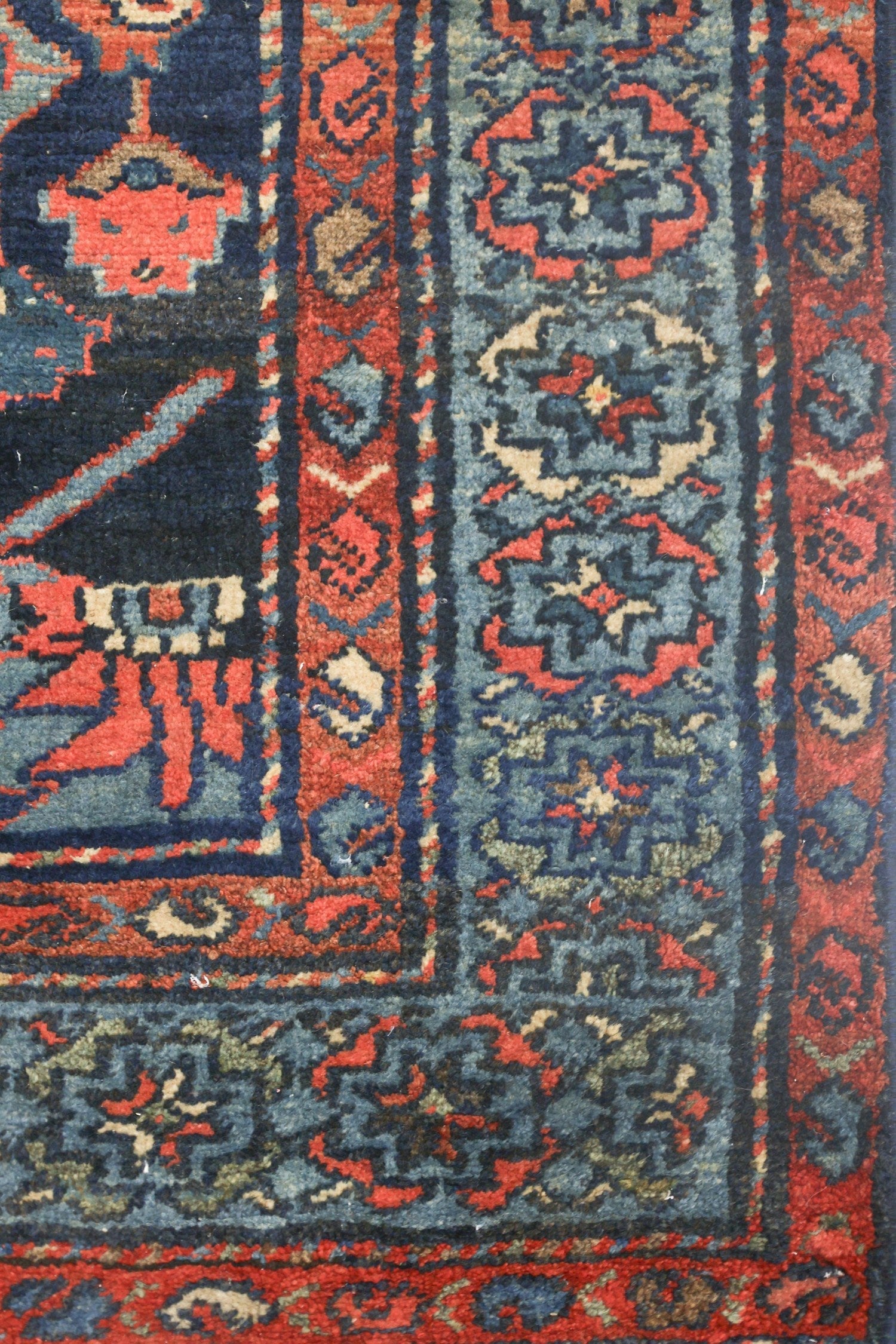 This Persian rug originates from the Hamadan region, renowned for its rich history in carpet weaving. The rug, crafted circa 1920, exemplifies the tribal style characteristic of Hamadan designs, known for their angular geometric patterns and symmetrical motifs.