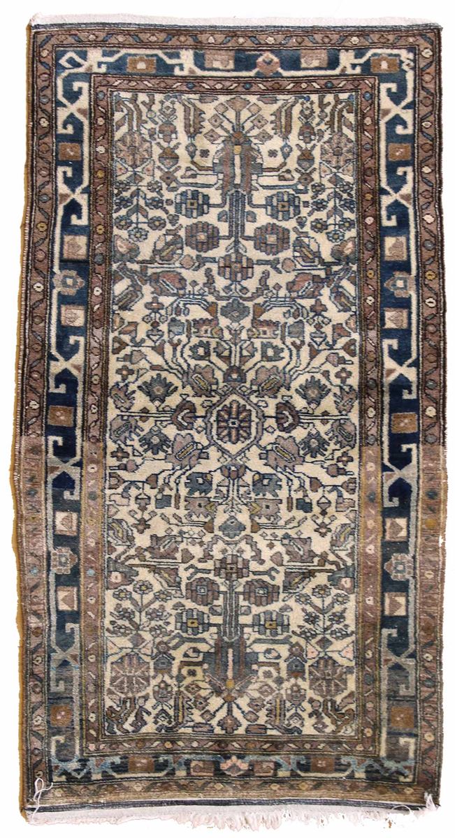 Design elements in Hamadan rugs often include angular geometric patterns, arabesques, and curvilinear motifs. The rug incorporates these traditional elements, creating a design that is both rich and complex. The central field of the rug displays an array of geometric shapes, stylized floral elements, and abstract motifs, all woven in a symmetrical and balanced pattern.