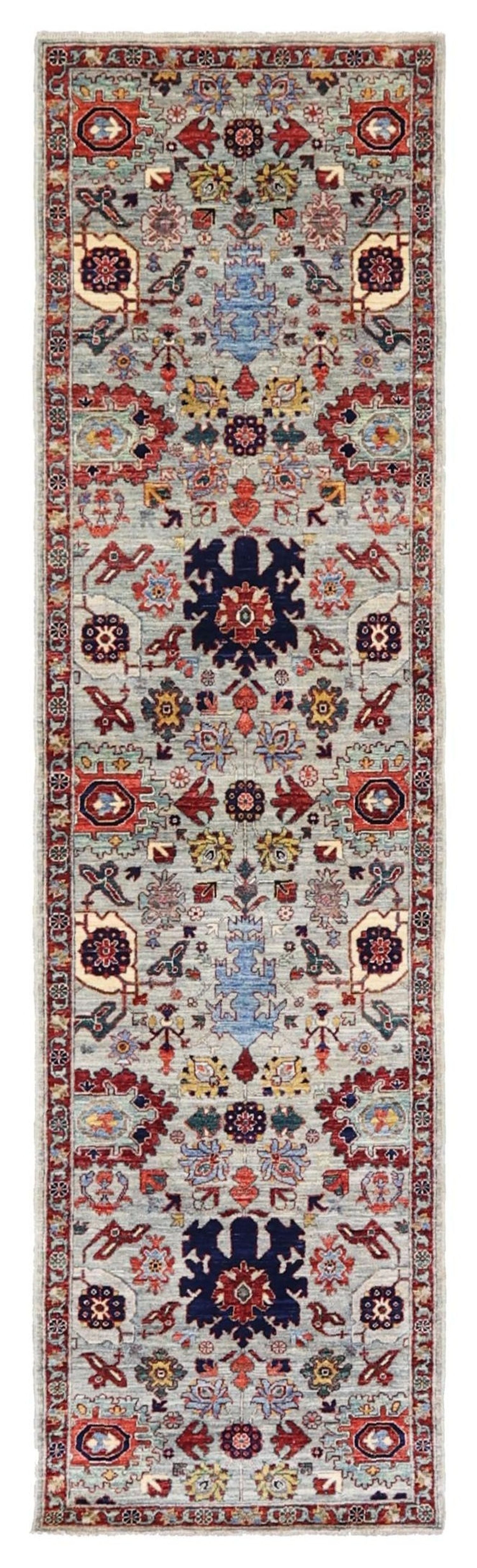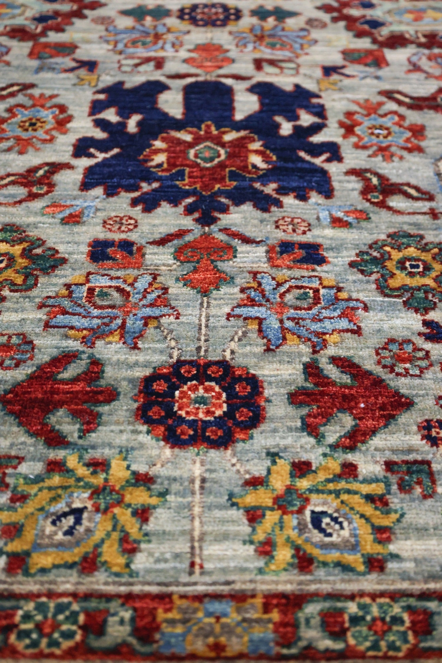 The Ghazni wool is then transported to Herat on the western side of Afghanistan for hand carding and spinning into carpet yarn. These intricate rugs are expertly woven on traditional floor looms, often within the weavers' own homes or as part of a cottage industry. Employing an asymmetrical "Persian" knot type, this rug features a robust wool pile on a cotton warp and weft, resulting in durability and longevity.