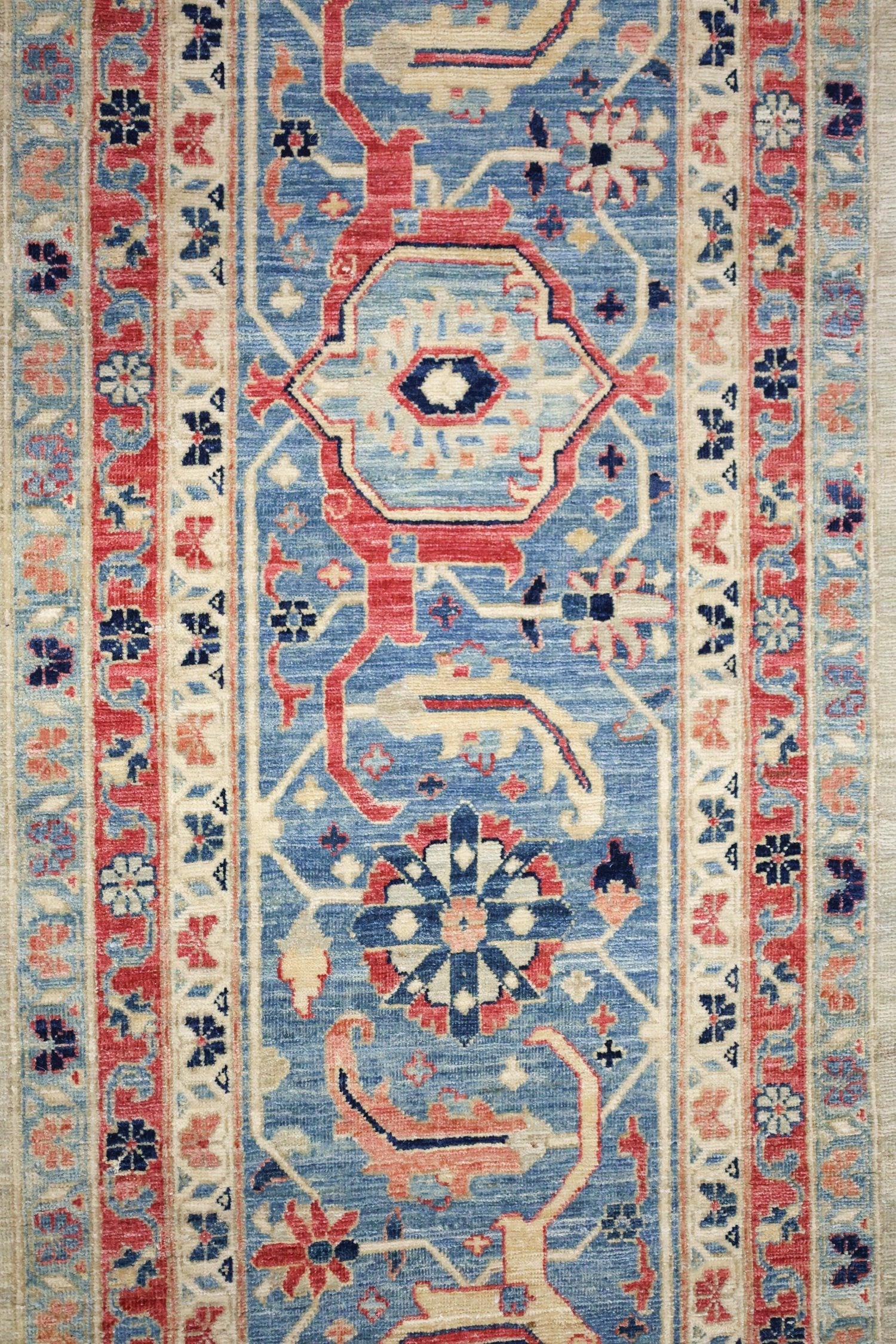 Employing an asymmetrical "Persian" knot type, this rug showcases the expertise of the weavers. The cotton warp and weft complement the all-wool pile, providing a sturdy foundation for the rug's structure. The double wefting, along with the heavily packed depressed warp weaving technique, results in a highly durable handwoven carpet.