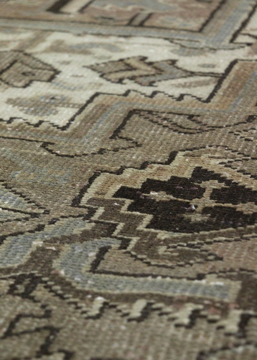 The rug referenced here, having been crafted circa 1960, emanates a vintage aura. The wool-on-cotton material composition has a soothing taupe background. The carpet's central design showcases an intricate, diamond-shaped medallion, a defining characteristic of the Heriz style. Lifted from the backdrop are ornate motifs of floral and geometric characters. The medallion is encompassed by numerous layers of delicately crafted borders filled with smaller floral and geometric patterns. Its substantial primary border exhibits a recurring leaf and vine pattern, flanked by narrower borders housing smaller iterative motifs.