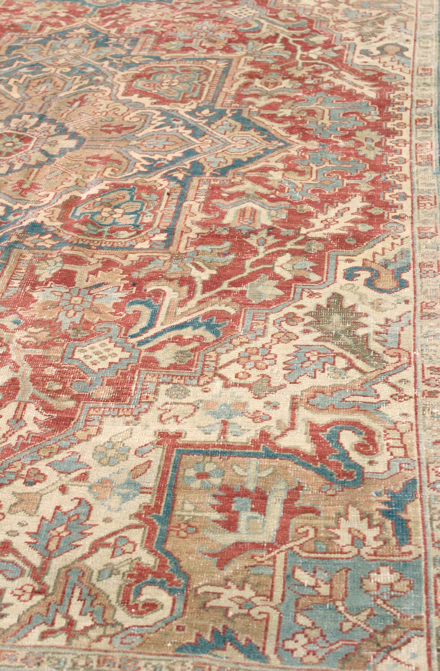 This rug hails from Persia and embodies the traditional Heriz design. This style echoes the tribal roots of the Heris village in northwestern Iran, where it originated. Typically, the rug is composed of wool on a cotton base, aligning with the classic material choice for these rugs. This particular piece dates back to around 1920.